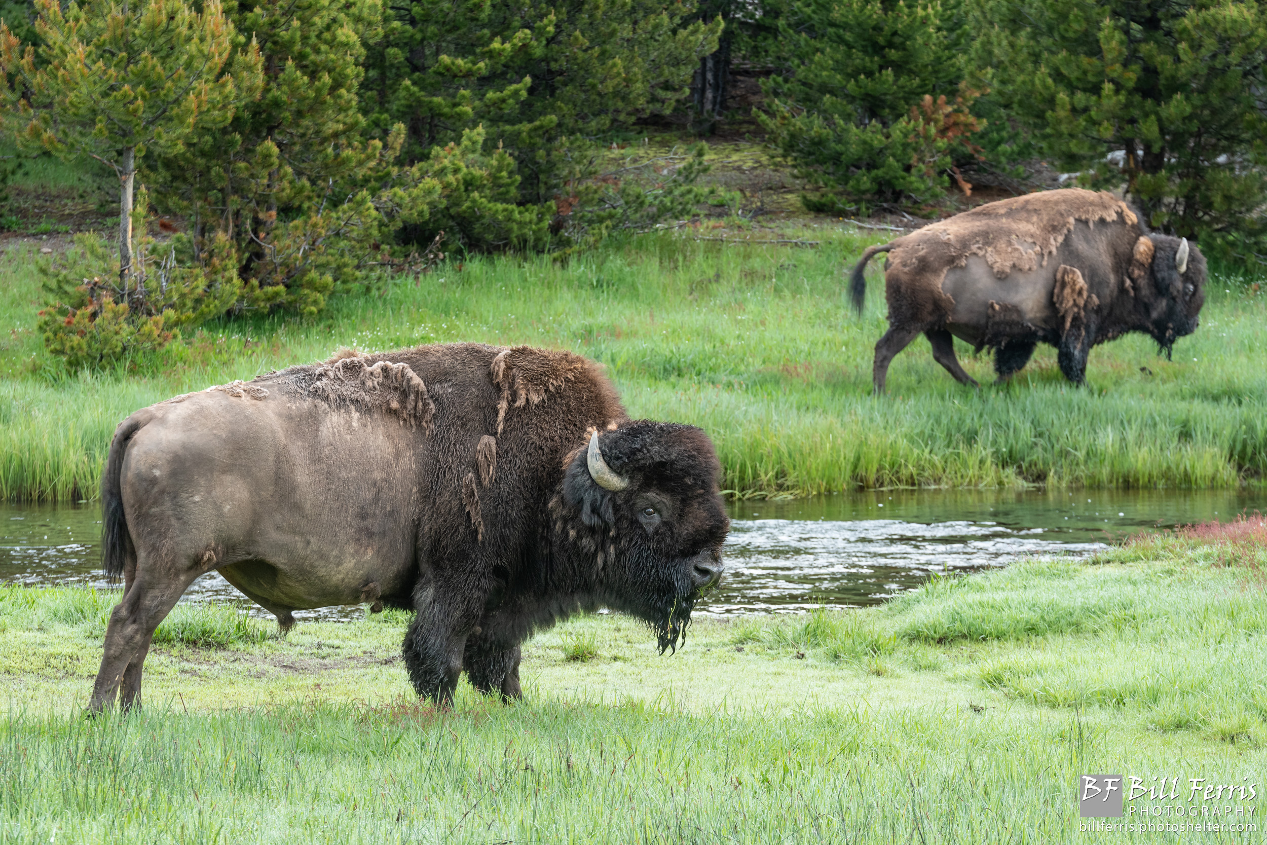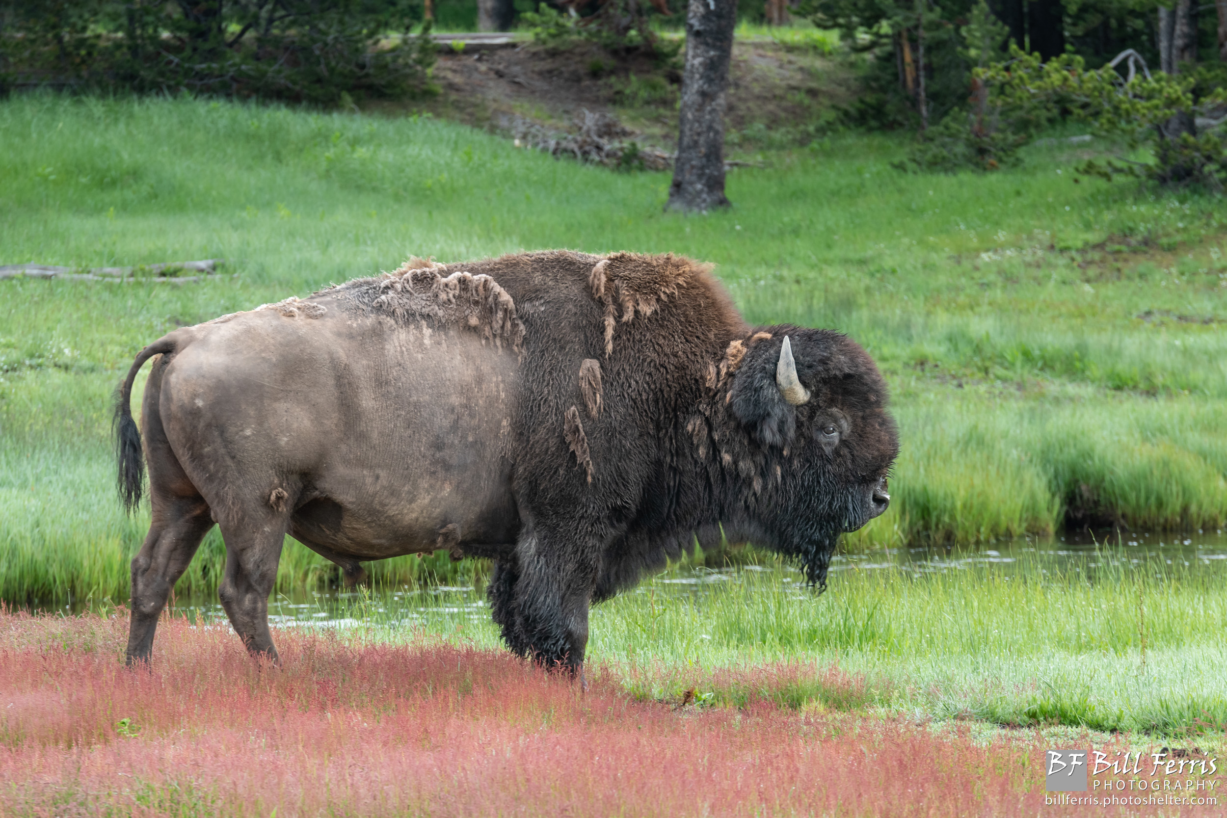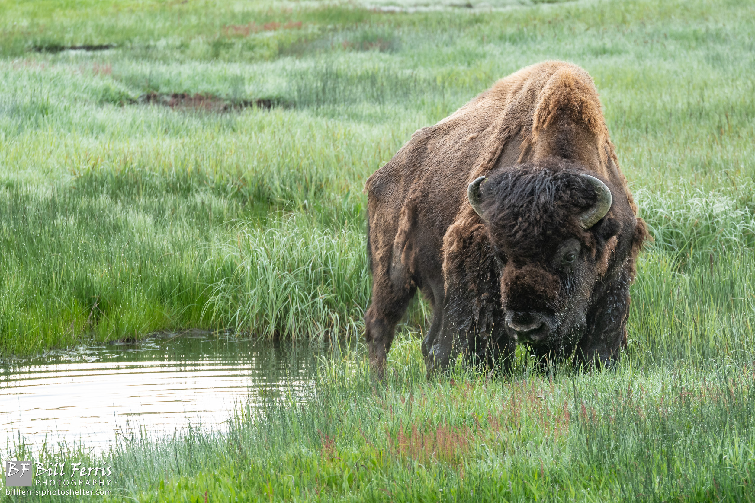 A Yellowstone bison bull pauses during a morning graze along the Gibbon River.