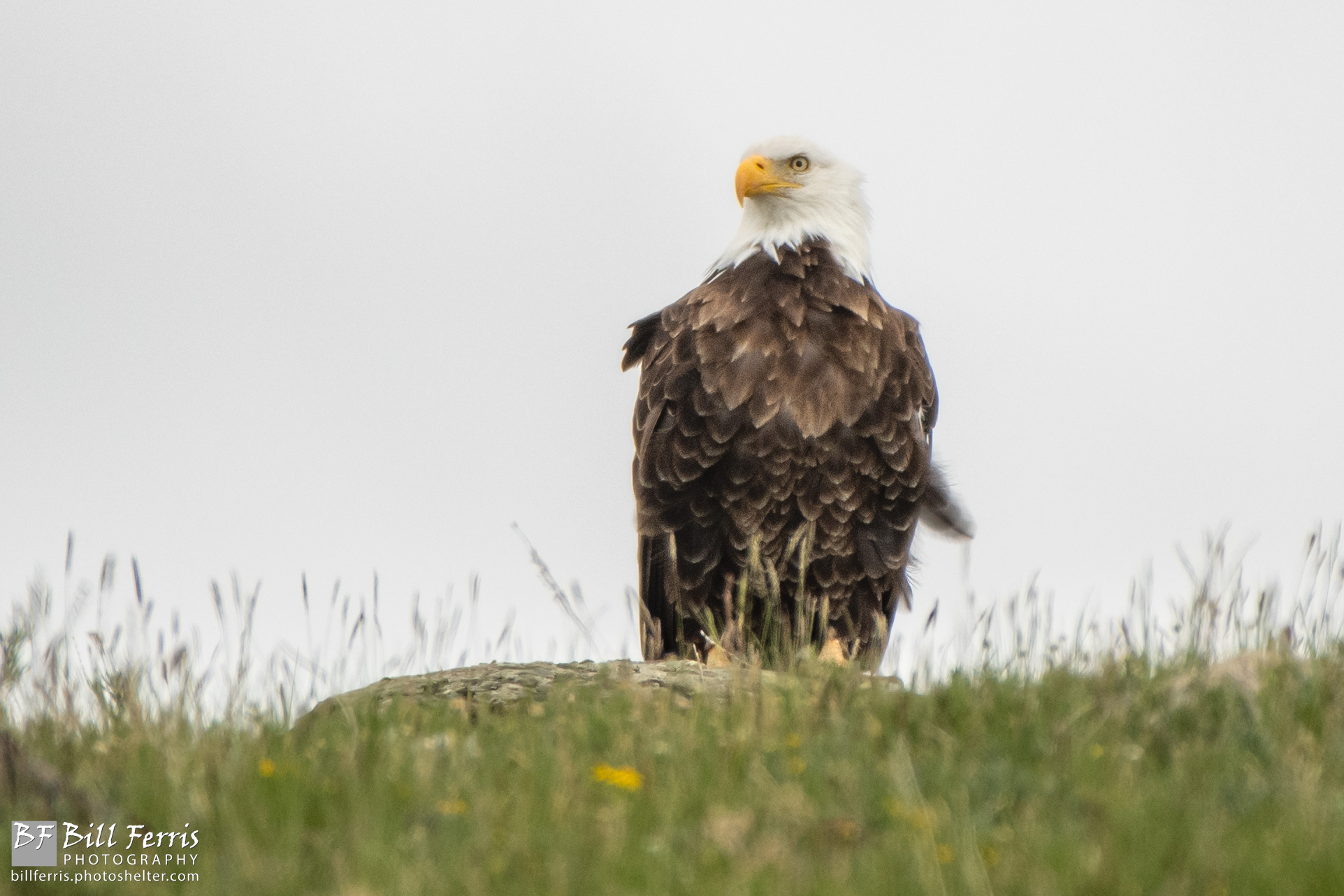 A bald eagle stands watch over a hill slope in Yellowstone National Park.