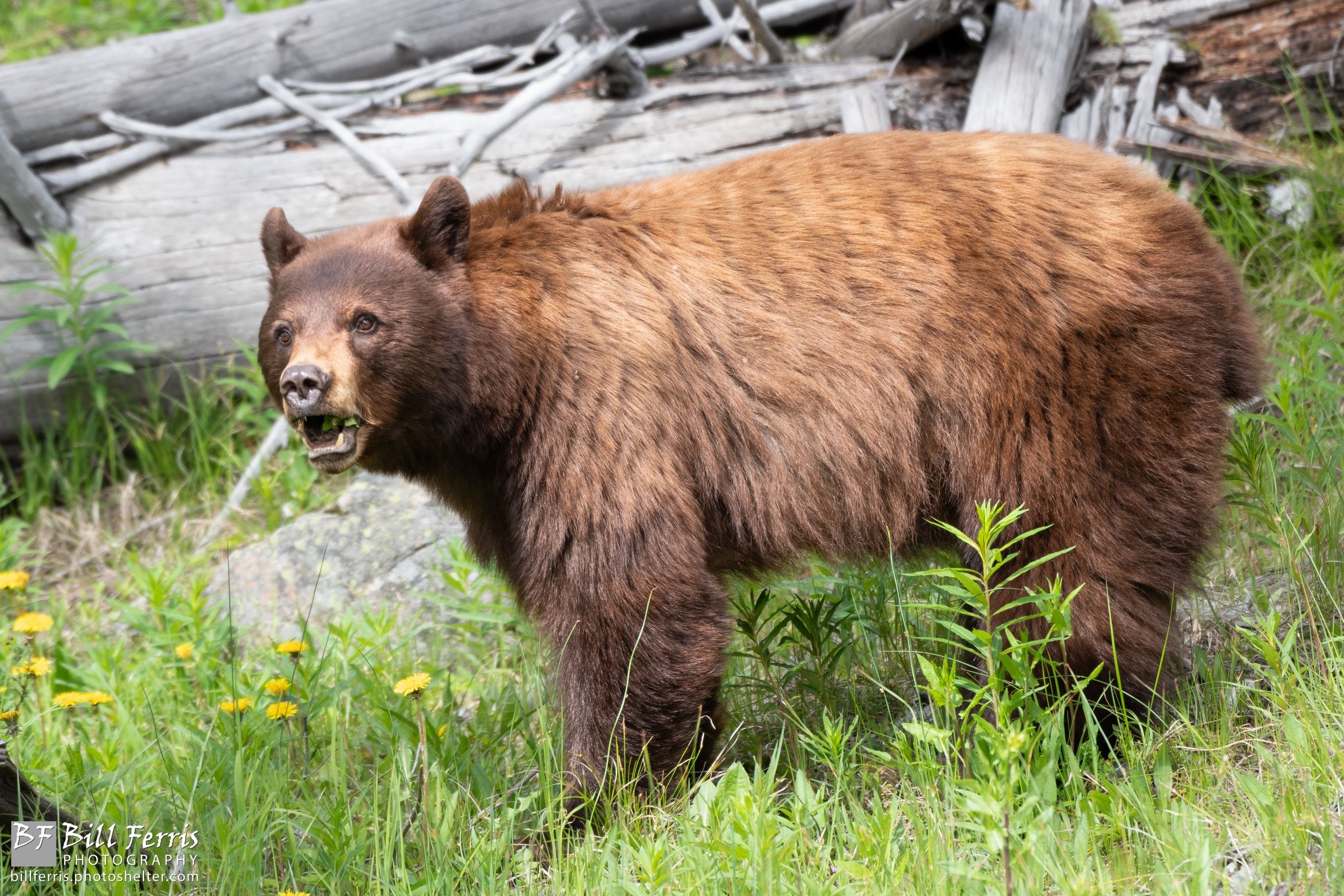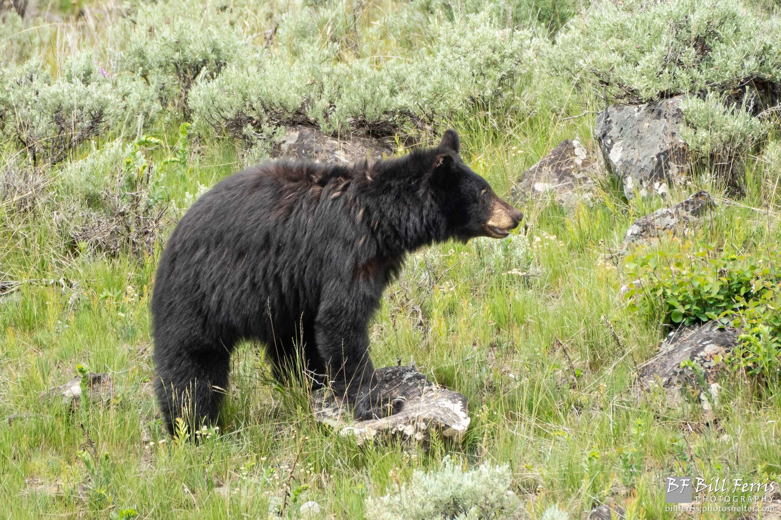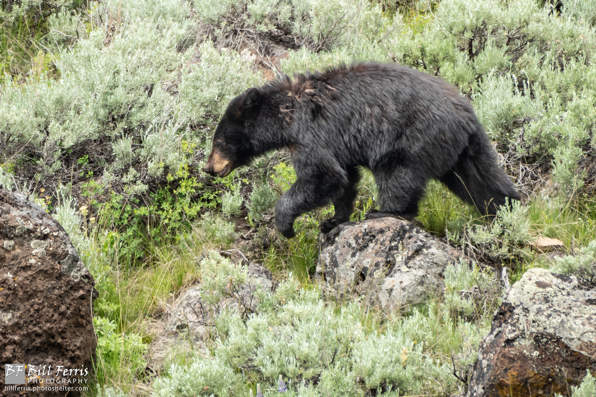 A Yellowstone black bear searches for a midday snack.