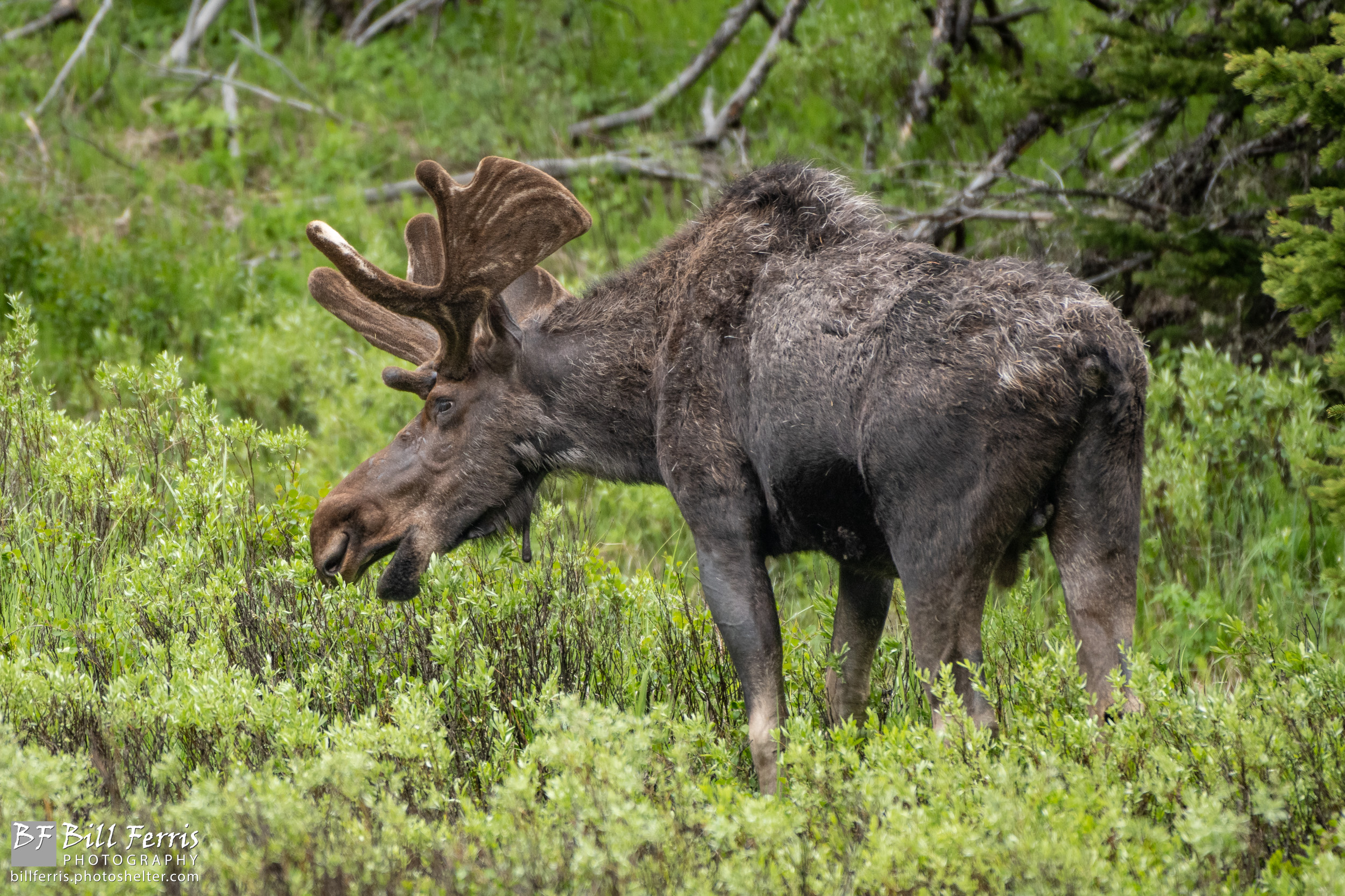 A Yellowstone bull moose grazes in a meadow near the northeast entrance to the park.