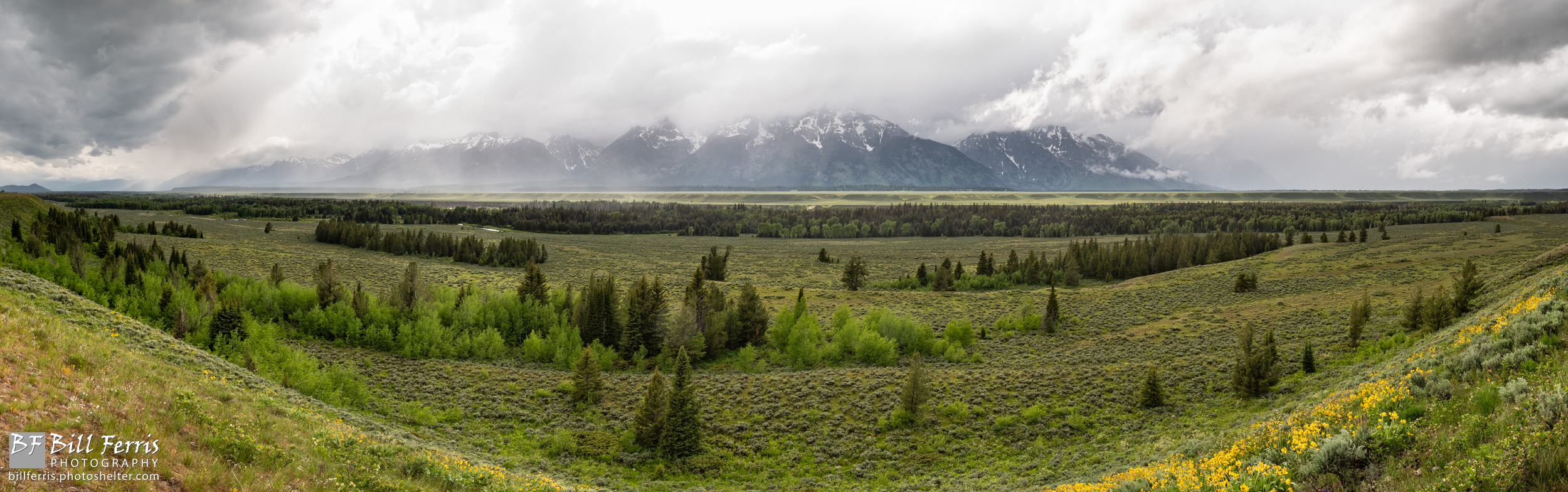 The Grand Tetons stand enveloped within summer storm clouds. (6-exposure panoramic stitch)