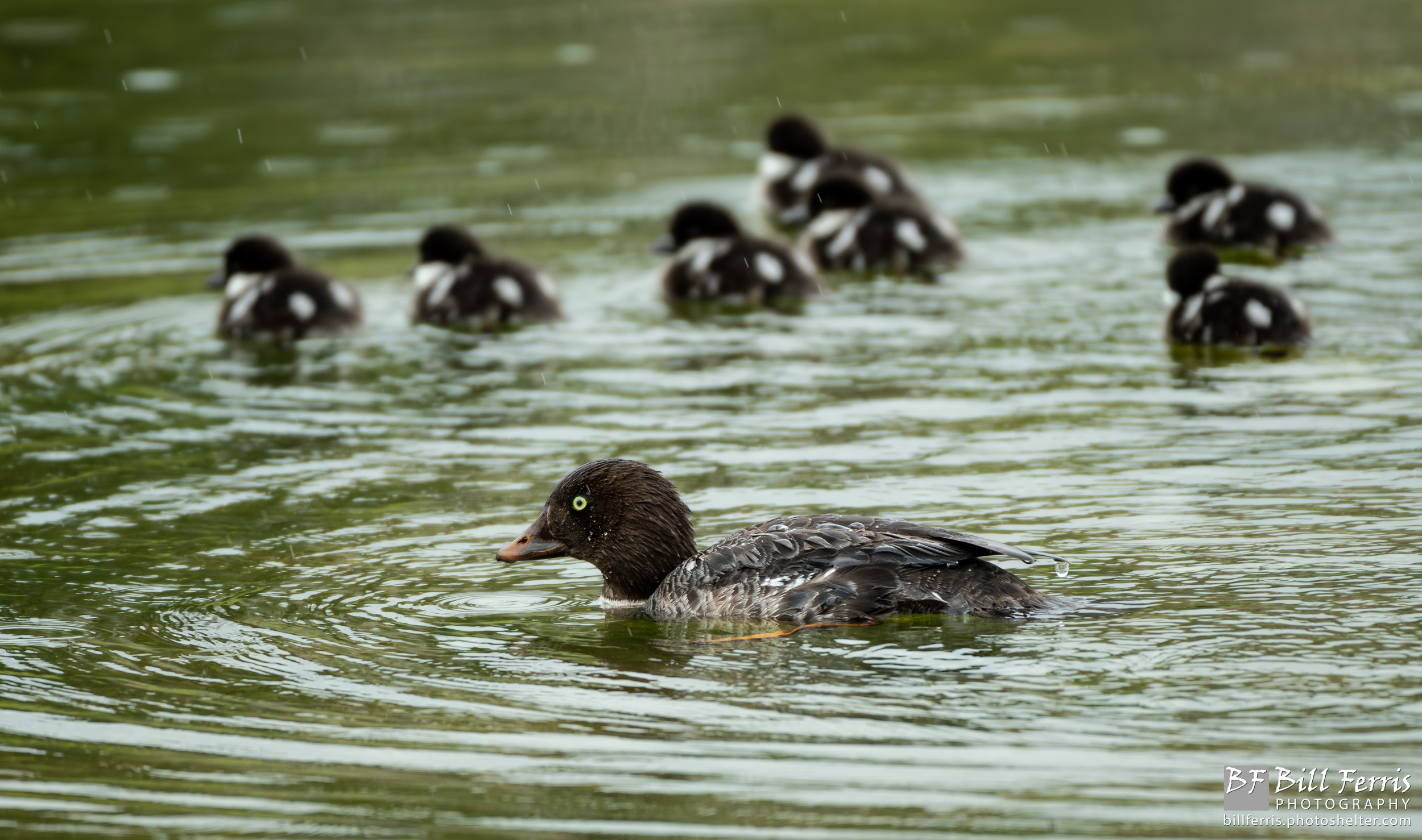 Seven goldeneye chicks, with Mom in the lead, cruise a tributary of the Snake River in Grand Teton National Park.