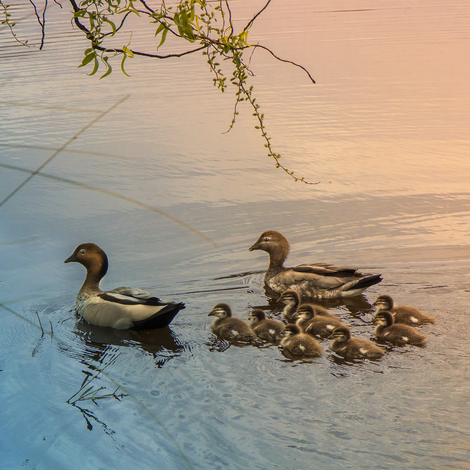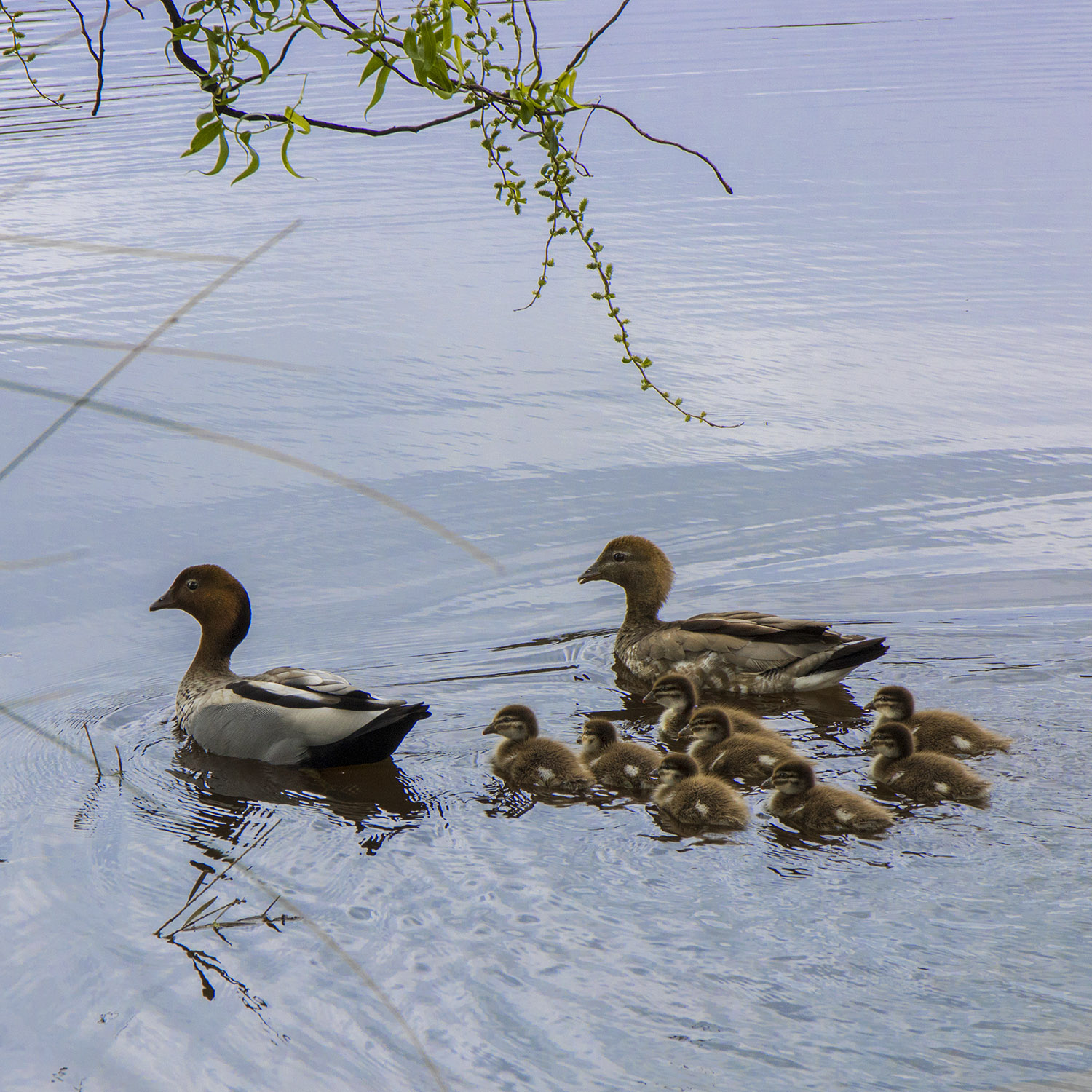 I understand the branches and twigs can be distracting, depending on one's preferences and styles, but I like them as they provide a bit of natural framing overall and of the leading duck in particular.