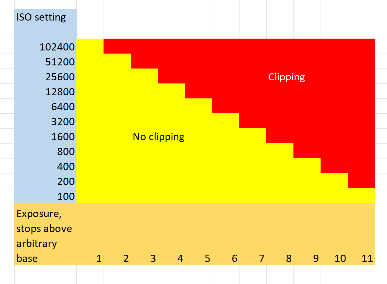 In order to relate the graphic to DR, I'd have to bring in read noise and photon noise, and also pick a SNR threshold. That would make it camera specific. I didn't want to do that. DR is full scale over mean at some threshold SNR, so you can't read DR off the graphic. What the graphic does show is the effect of ISO setting on full scale with full scale measured in lux-seconds of exposure.
