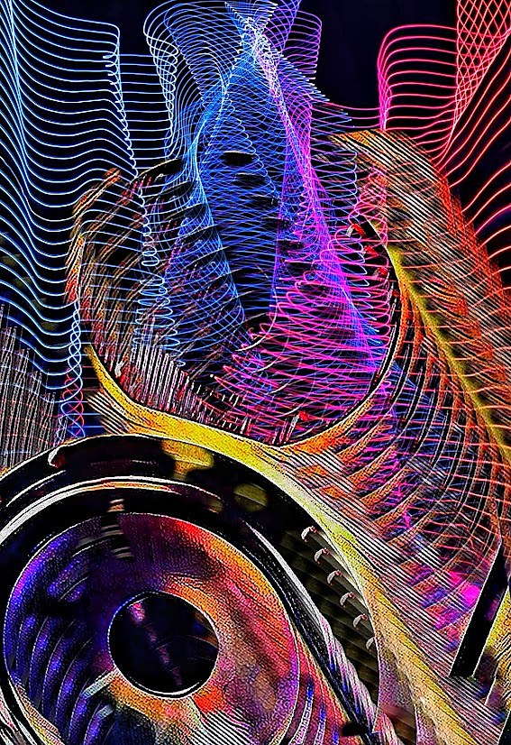 I am a commercial photogrher. Some fols think that is a kida glamorous job- pretty fashion models, designer jewelry, gourmet foods, snazzy cars, cool stuff- well sometimes. Sometimes- not so much! Imagine spending a week shooting surgical supplies for a catalog How a bit musical instruments for an auction house, 300 of them, straightforward on a white background. appliances and home- entertain stuff but for an online seller- no fancy stuff. As my grandkids used to Booooooring! The good thing is, I get a studio full of stuff with interesting shapes, colors, and surfaces, and things that most folk don't have lying around the hous or office. Good fodder for abstract images.