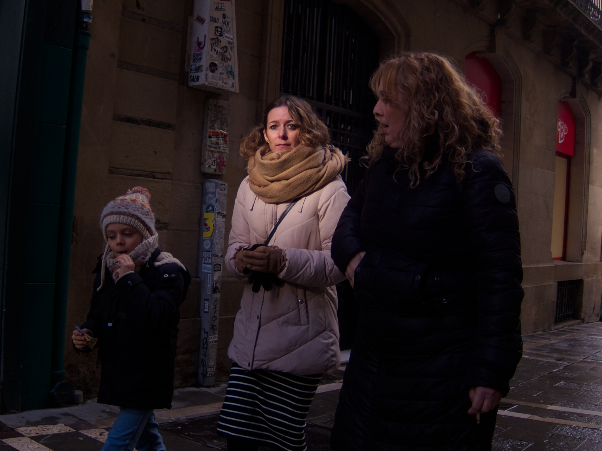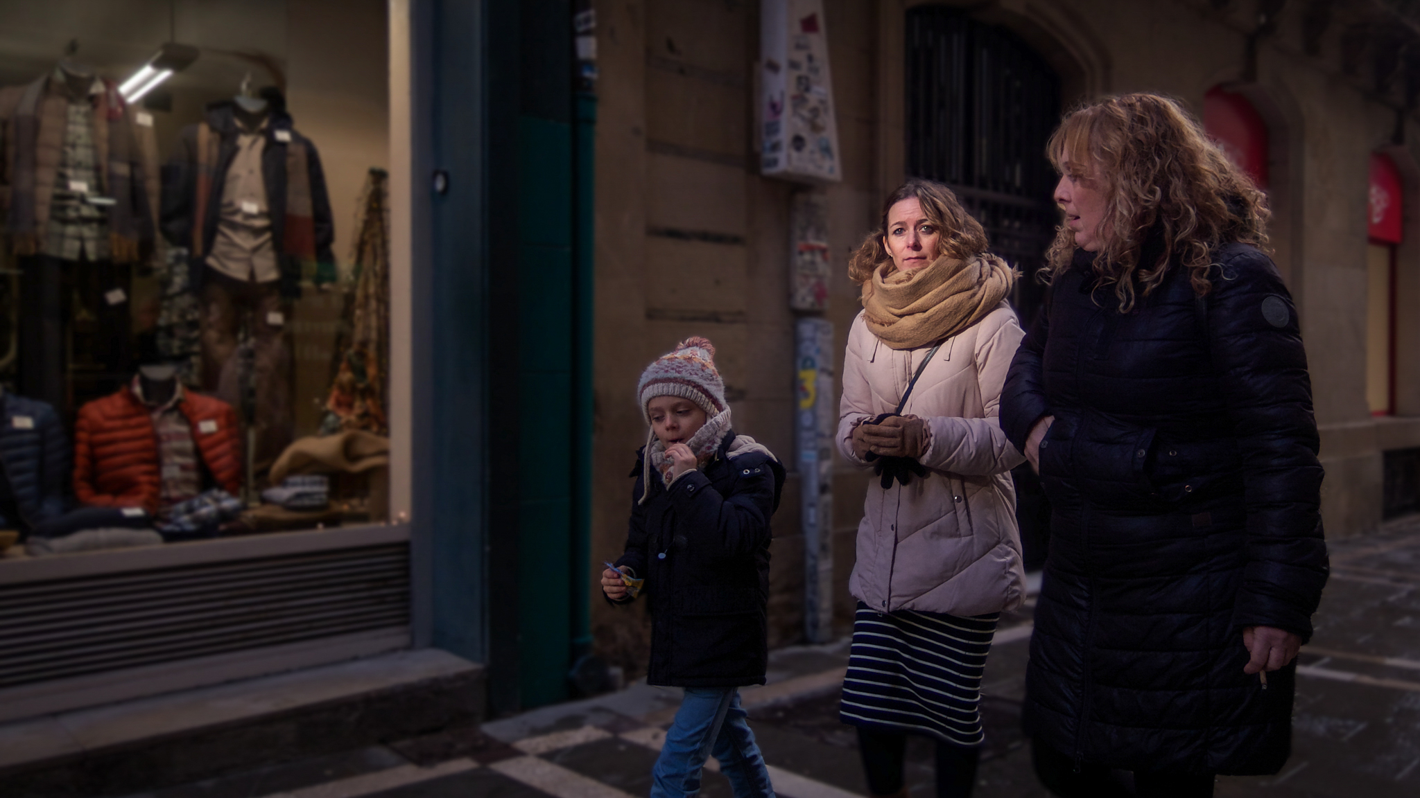 The positioning of the three women and the shop window is beautifully handled. The diagonal down along the heads links to the widow corner and a grouping within the window that echoes the right hand group and the rugged up clothing. Three generations out together with the eldest - closest and largest, looking across with a gaze that takes in the other two- great.