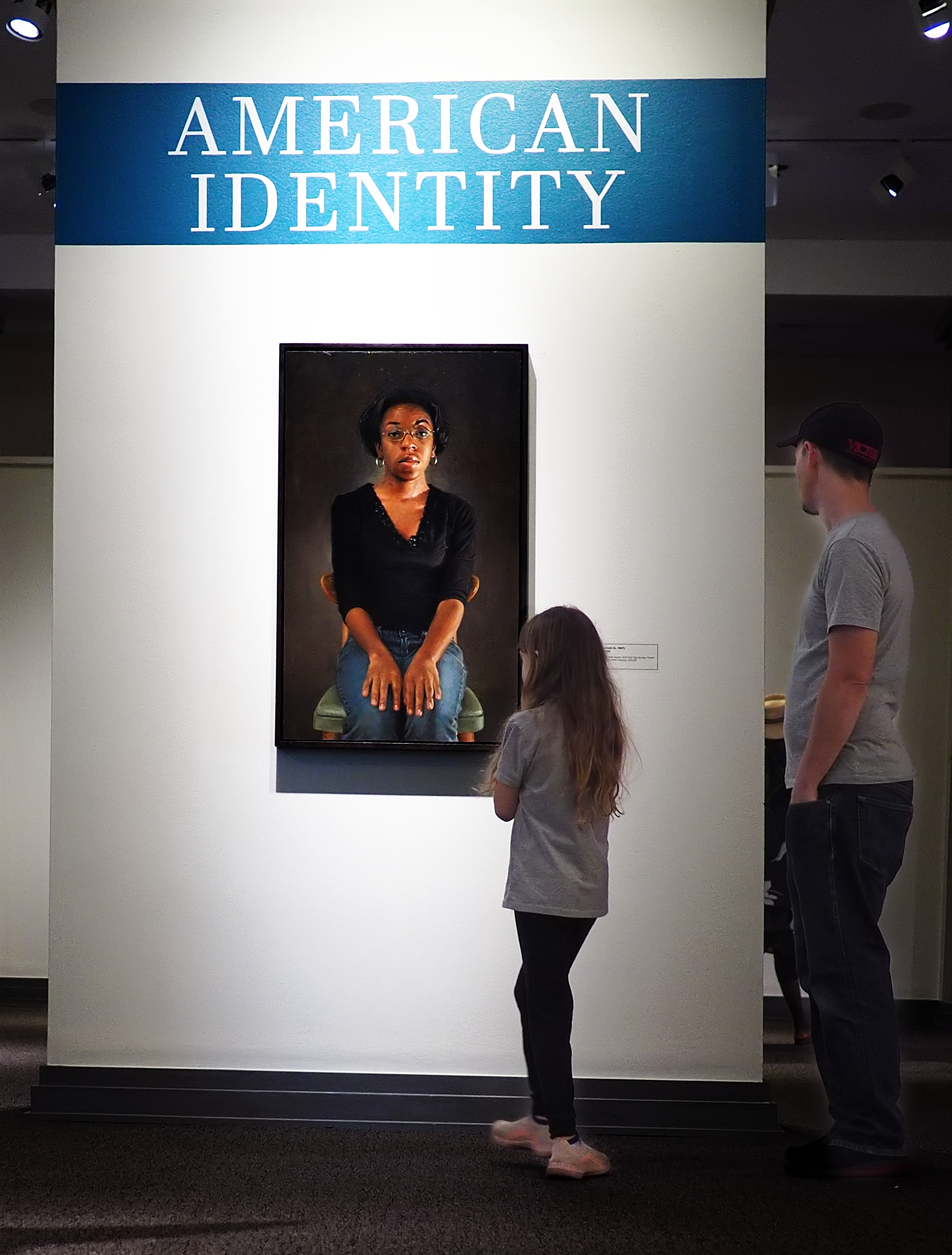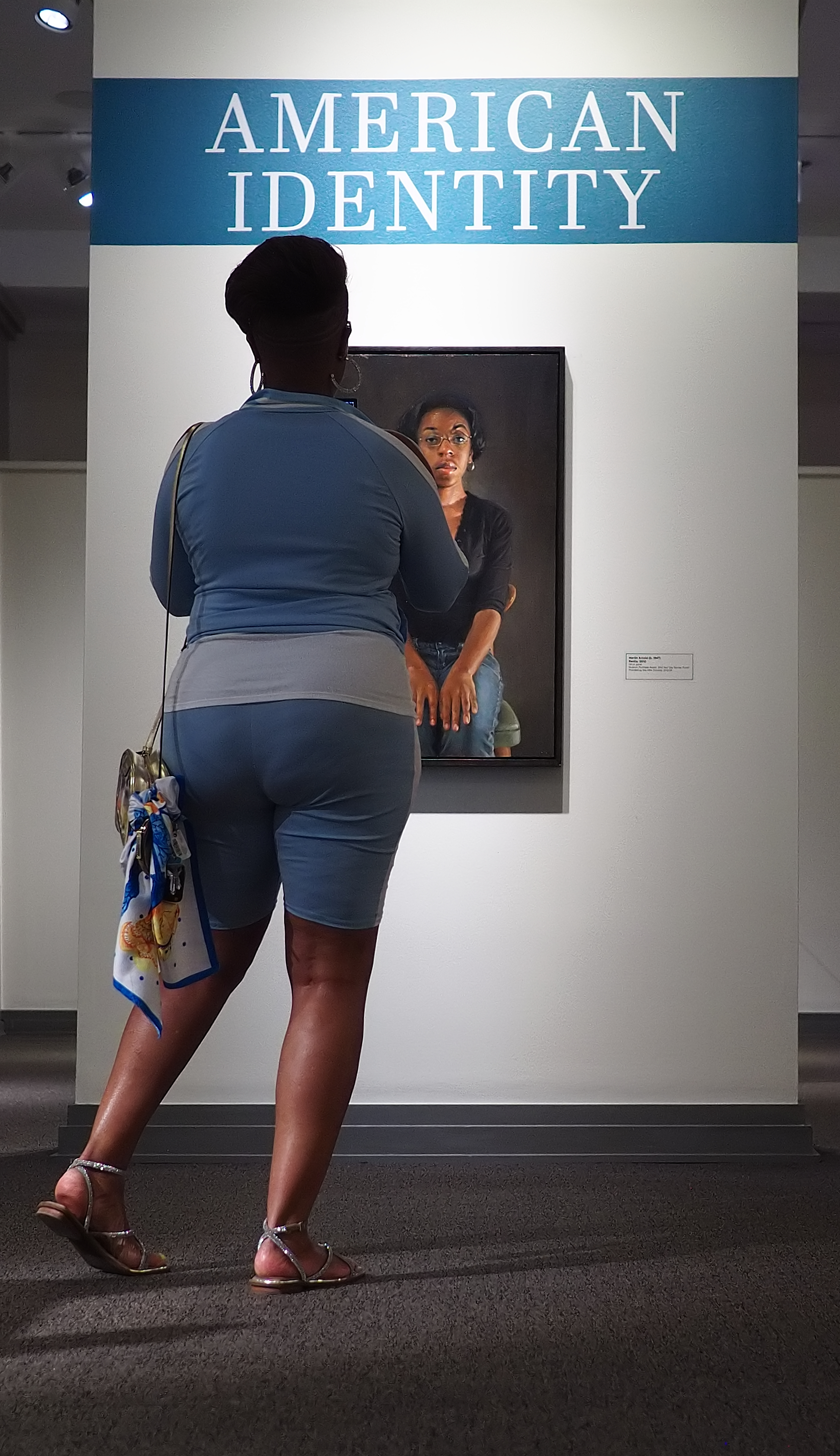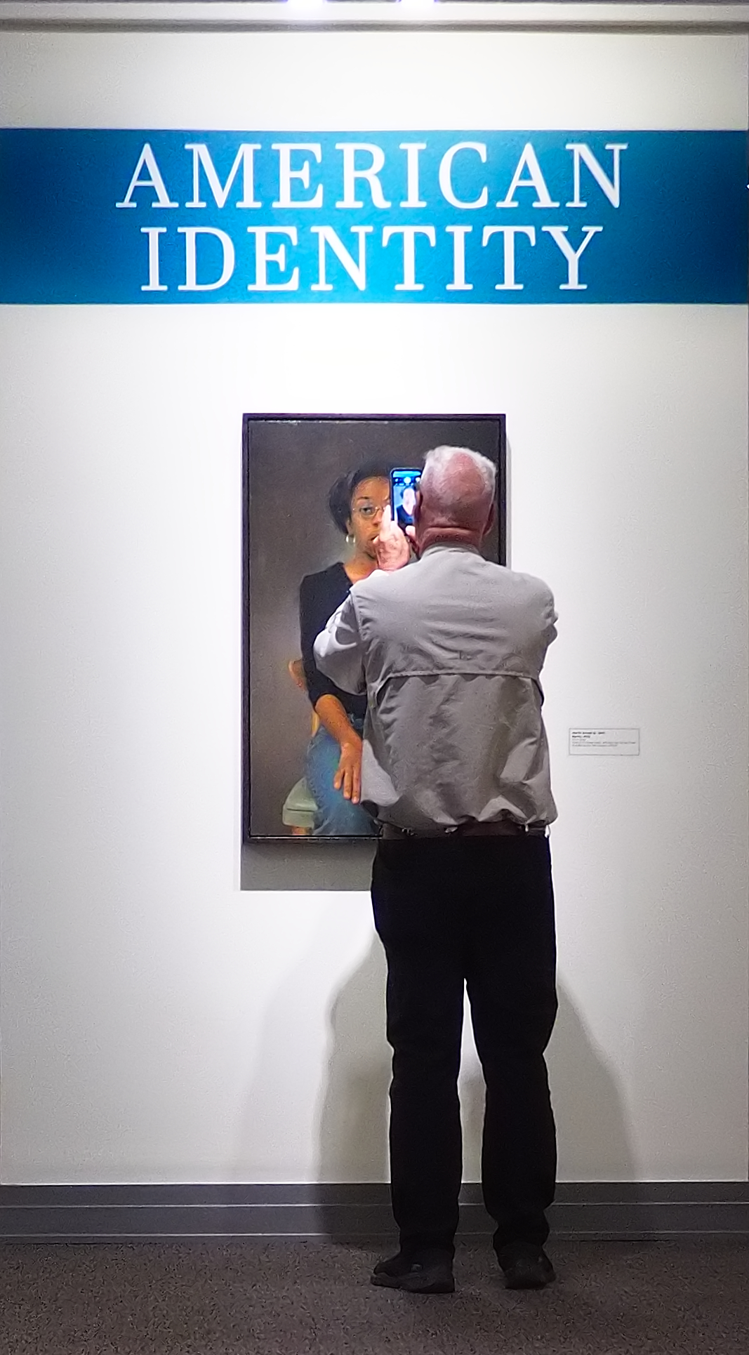 What I like about this collection is that the viewers themselves have become part of the subject. They reflect aspects of "American Identity." Each of your photos prominently includes the exhibition title. This draws them together in the collection as well as adding an interpretation to the individual shot.