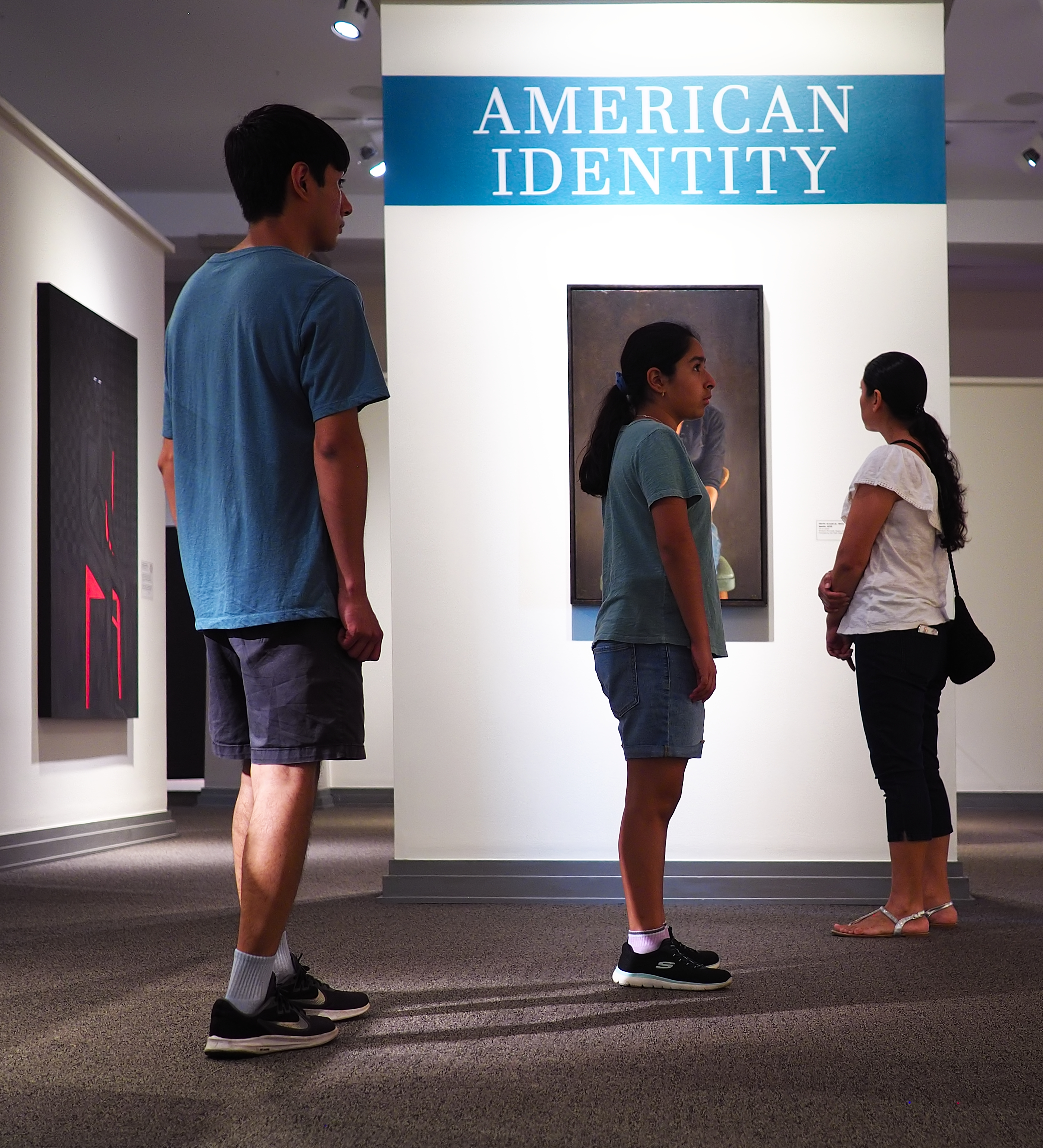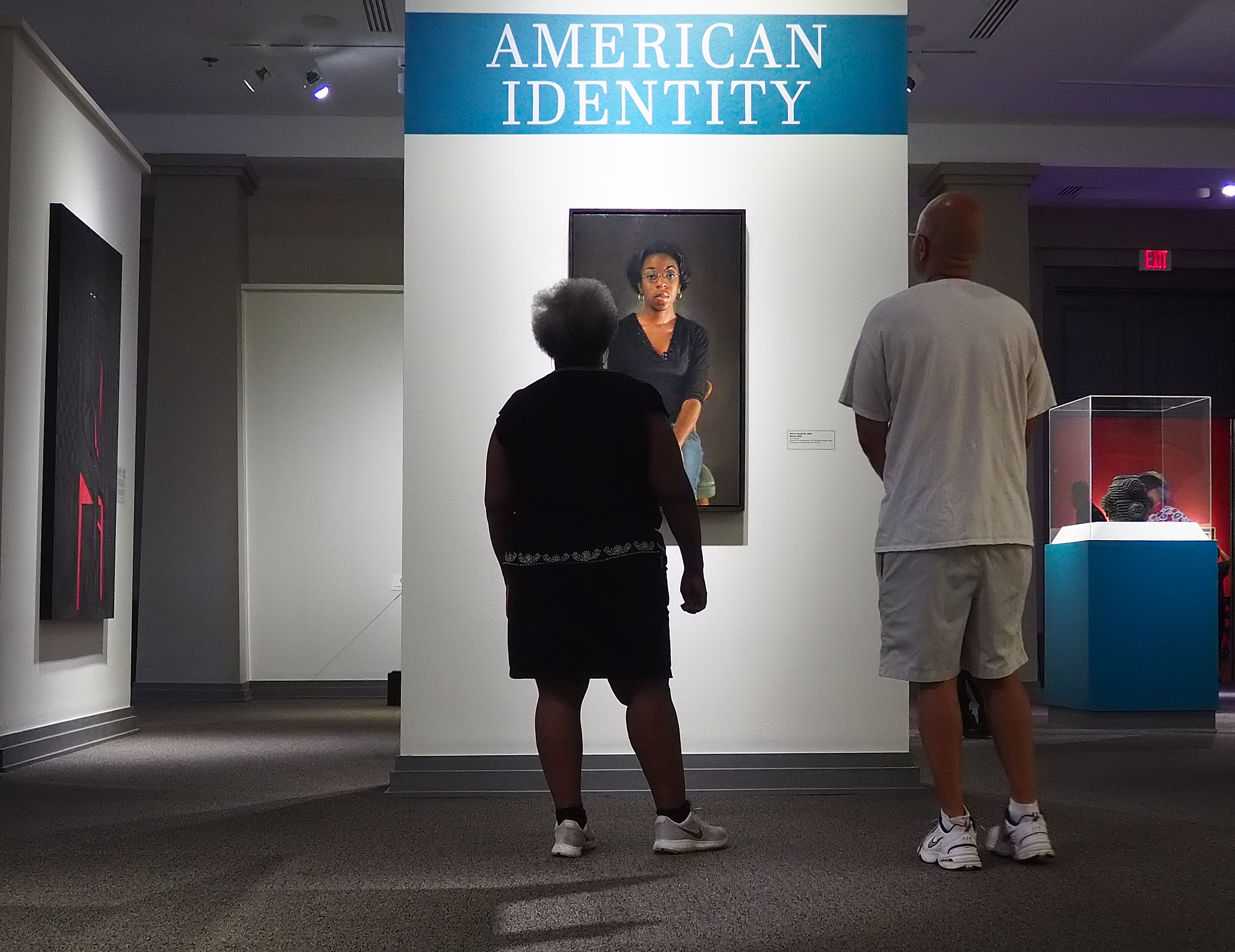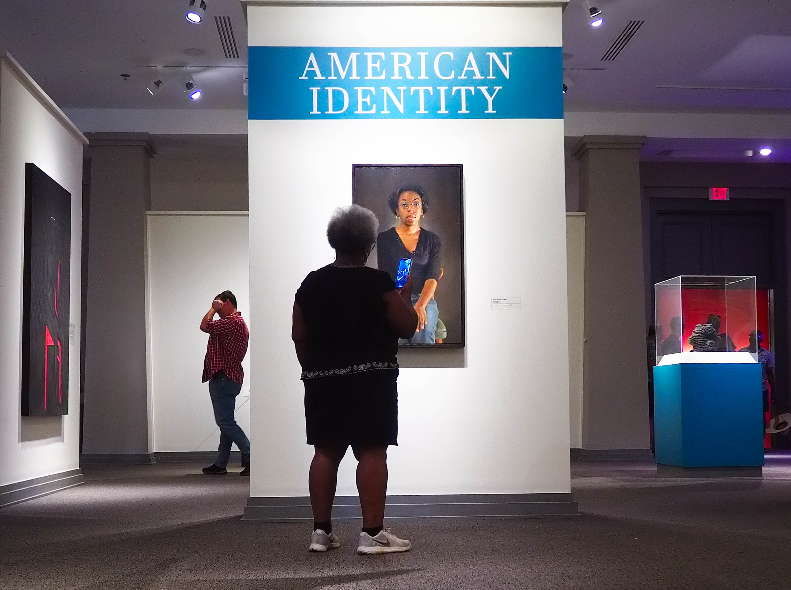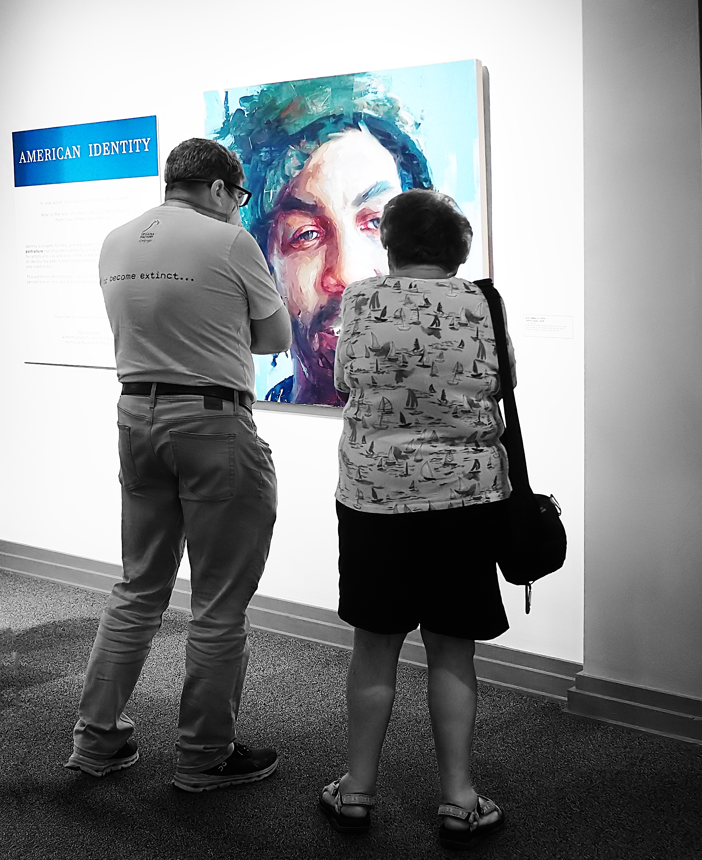 What I like about this collection is that the viewers themselves have become part of the subject. They reflect aspects of "American Identity." Each of your photos prominently includes the exhibition title. This draws them together in the collection as well as adding an interpretation to the individual shot.