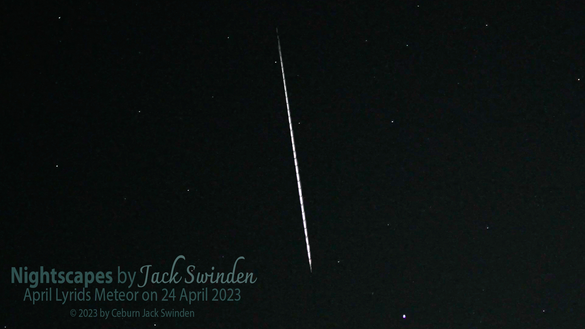 This is a video of an April Lyrids meteor captured on 24 April 2023 using my Sony ZV-E10 with Rokinon 20mm t/1.9 lens at 01:05 CDT (06:05 UTC) in Everman, Texas. Video was shot in true 4K using 24p 60M. The video shows the full size image at normal speed, then shows a cropped in view at normal speed, then finally shows a cropped in view at 1/10th speed so you can see how the meteor flares multiple times and understand how that will look when captured within a long, still image photo.
