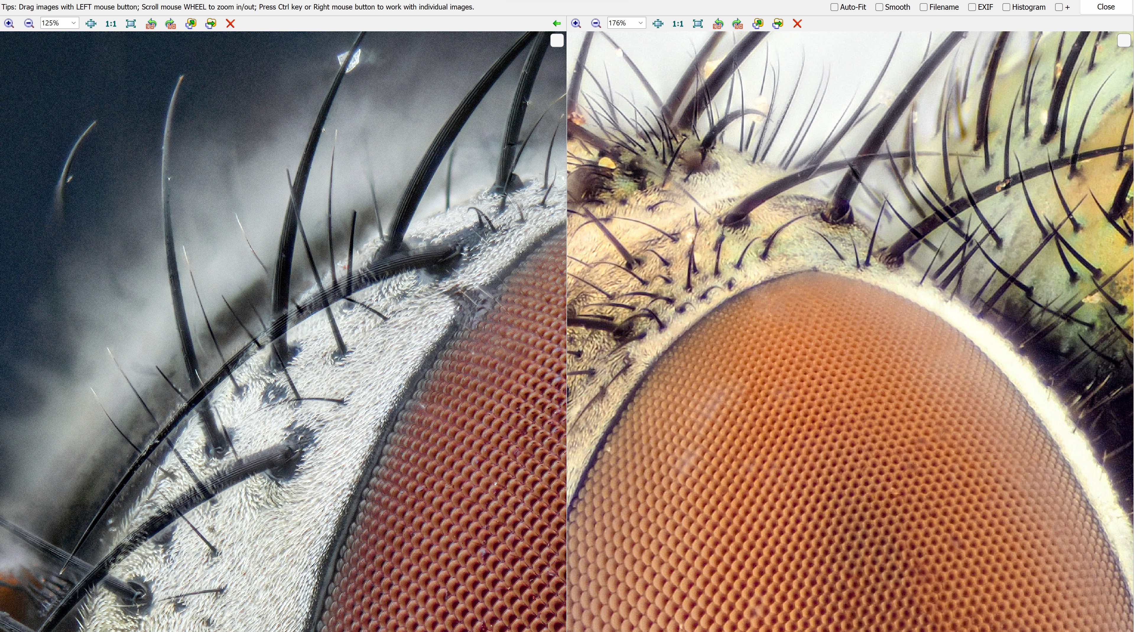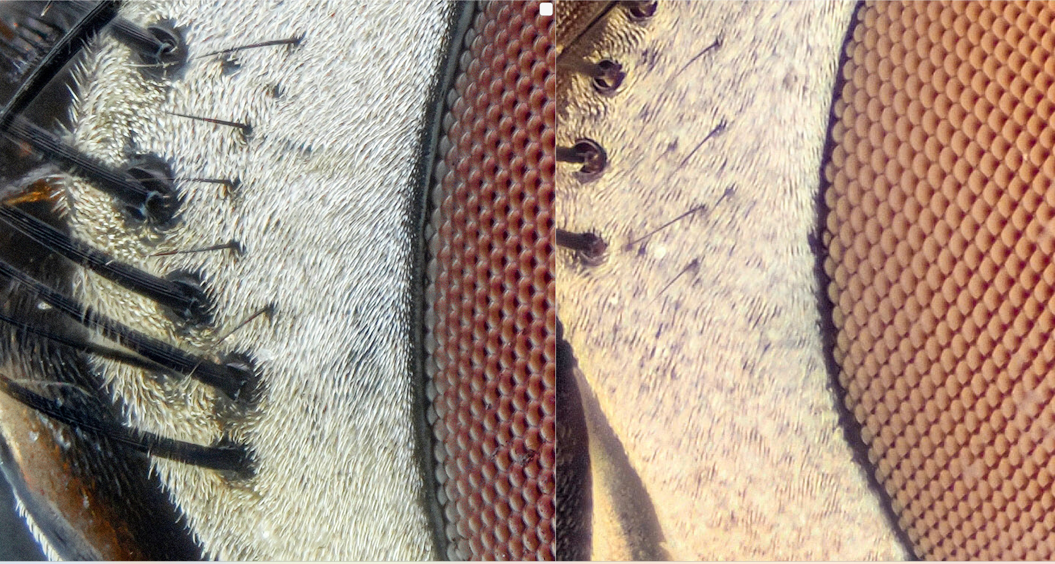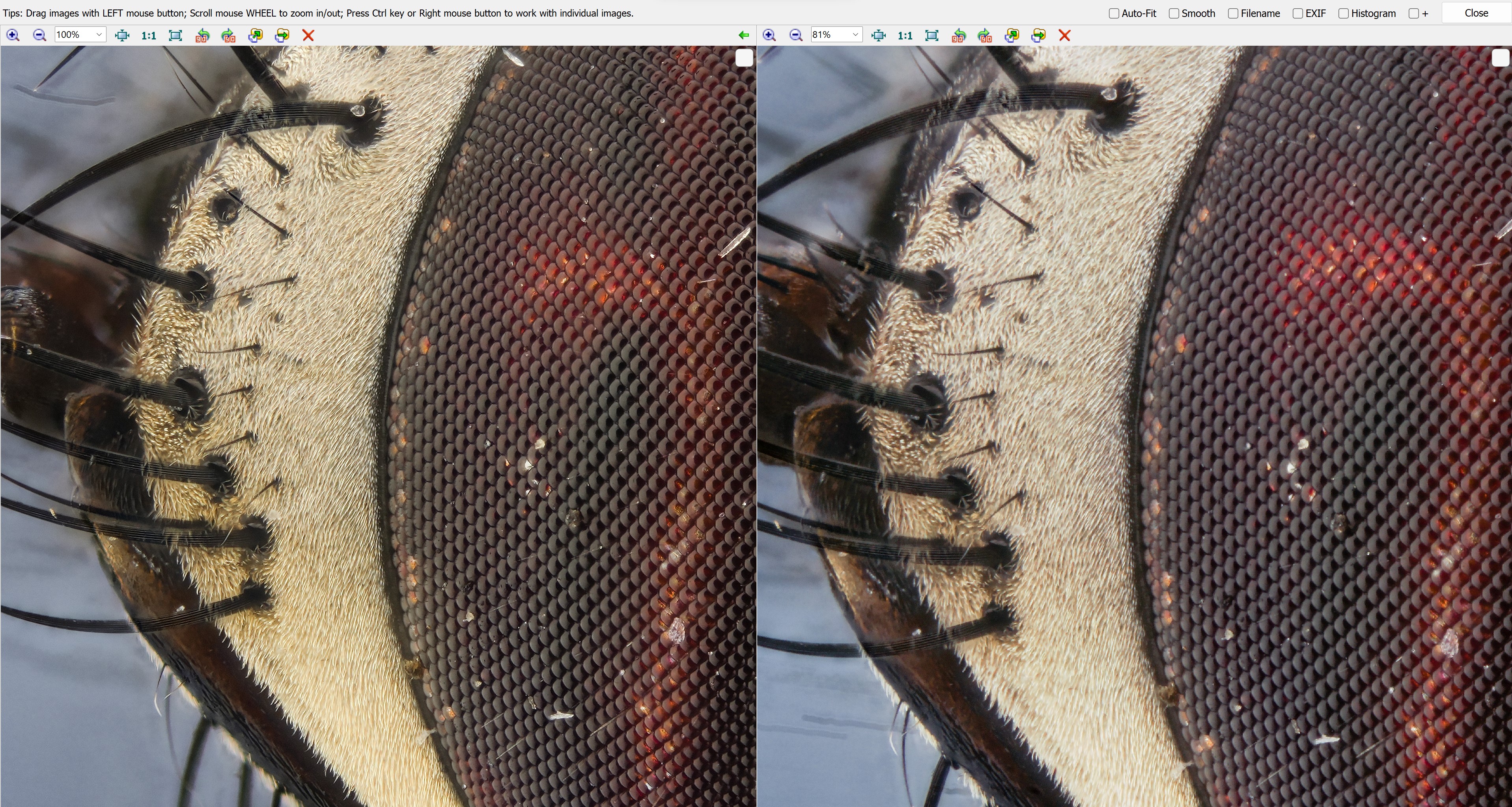 a74 crop mode 14 meg Vers a6300 24 meg 10x olympus microscope objective same dead fly 😒 he was alive but i acidently squashed him transfering him to the studio. at least he was still 🤨🙄 identical lighting and processing. and 100 images each stack. electronic shutter remote shutter control so no vibration at all.