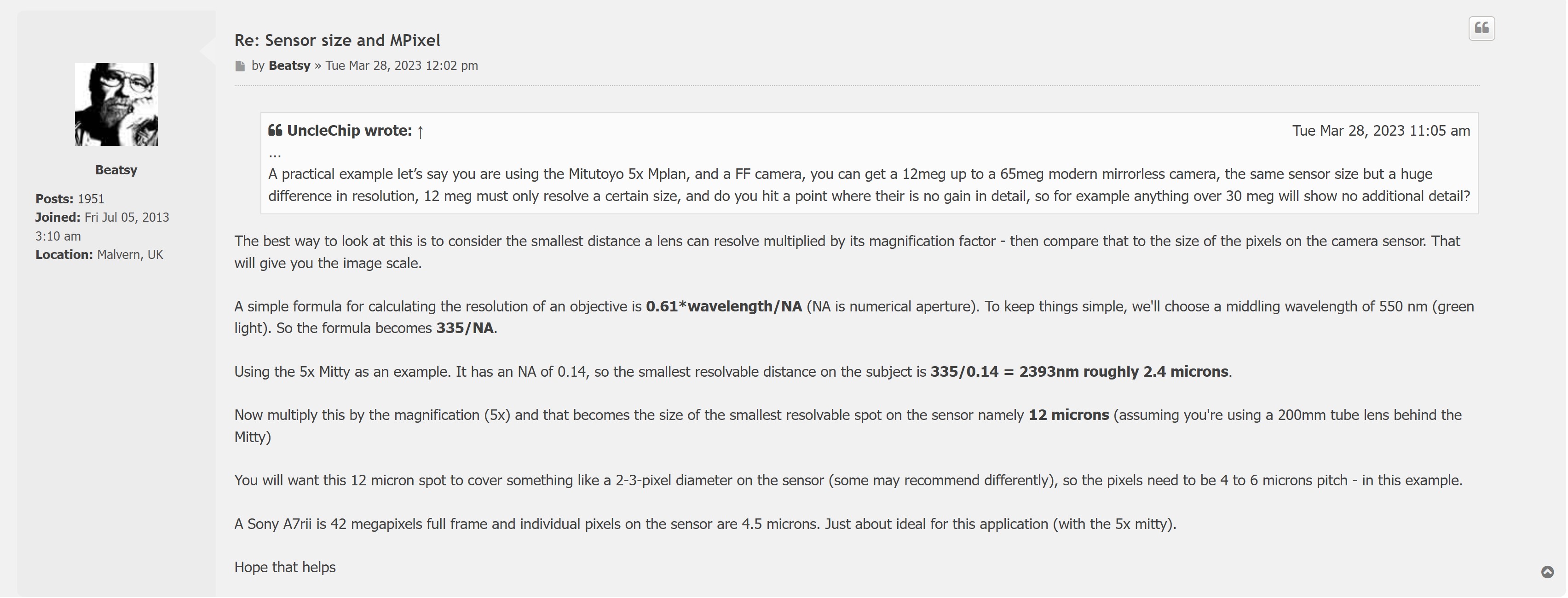 well did my final test 4x amscope microscope objective 20meg em12 fly head eye detail , sony a74 apsc mode 14 meg image. the sony absolutly destroyed the smaller sensor pixels on detail sharpness and contrast even magnifying it to suit the 20 meg file. then used the 10 x olympus objective pulled back to (6x aprox )the same framing as the 20 meg olympus image. the sony just didnt just destroy it, it abliterate the smaller pixels. its on another planet.