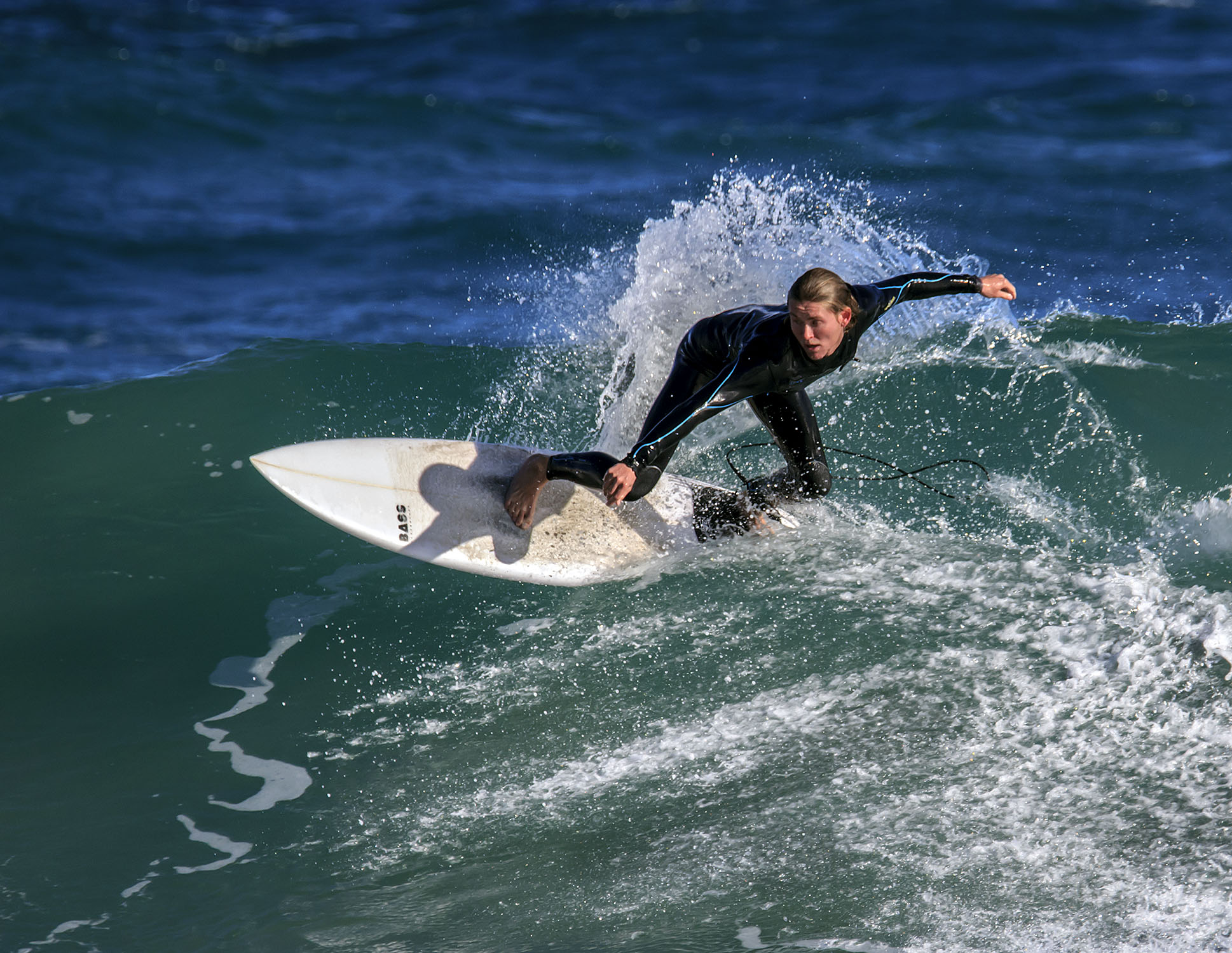 Nice photo!! I agree with camperjimk that you chose a good shutter speed to stop the action of the surfer and the water and allow it to still convey motion. I really like the shape of that spray. The spray behind him, the angle of the lean and the s-pattern in the wave foam shows me he was making some sharp turns working that wave.