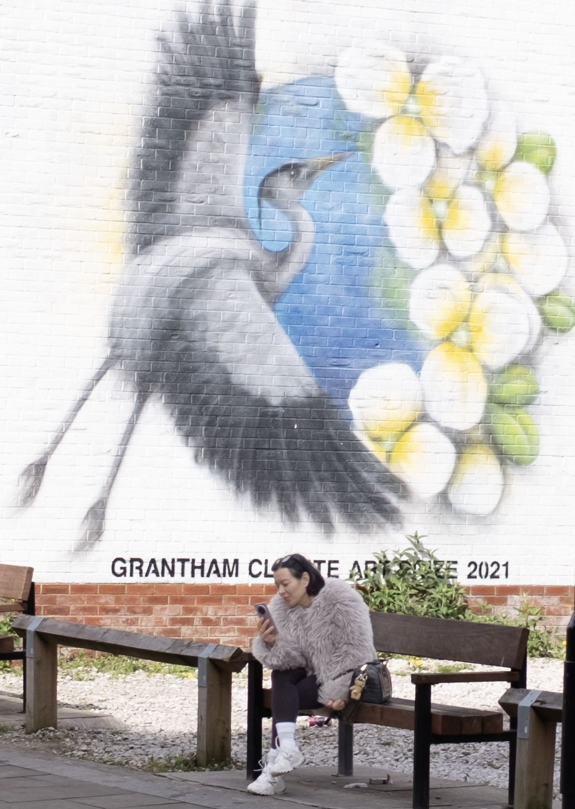 I was just walking through the town centre and saw this lady sitting underneath the mural. It tickled me that her coat was definitely looking like bird feathers and managed to snap this before she moved away. Comments appreciated.