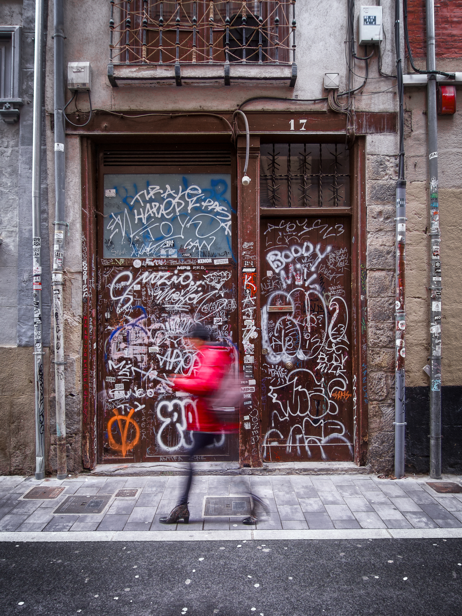 I like it too. Makes it look like the lady is hurrying to get away from the 'chaos' of the graffiti.