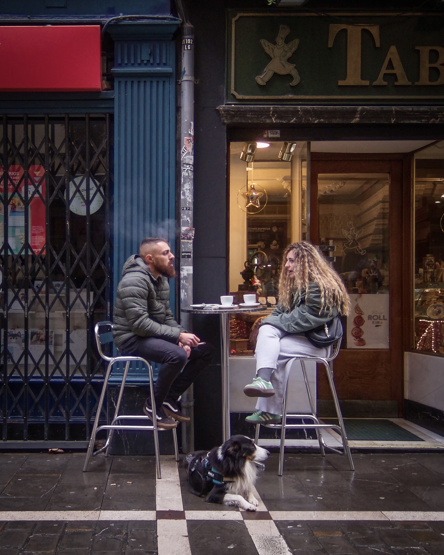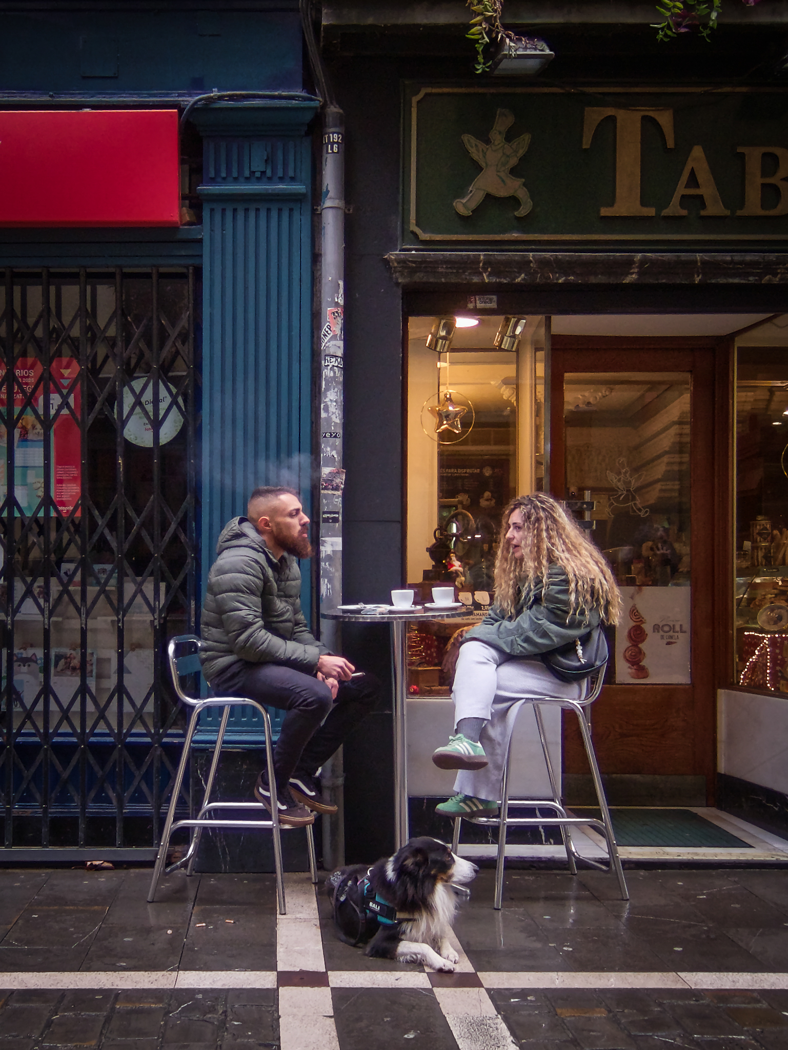 On a technical note, not a fan of the portrait orientation -- it makes the scene feel cramped. Even a square crop would be better with a little more on the sides and a little less on the top (or even just a square crop from what was presented, from, say, the white line below the dog's paws to just above the sign and below the light). It's just that (for me), the portrait orientation for this photo is a bit claustrophobic.