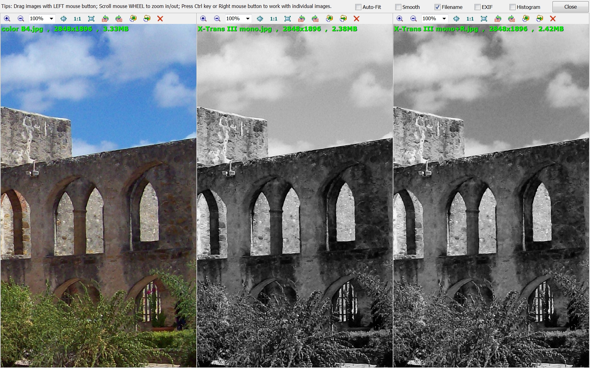 Especially noticeable was the difference in the blue sky between 'mono' and 'mono+R' which seems about the same as a real red filter on a camera loaded with a roll of B&W film!