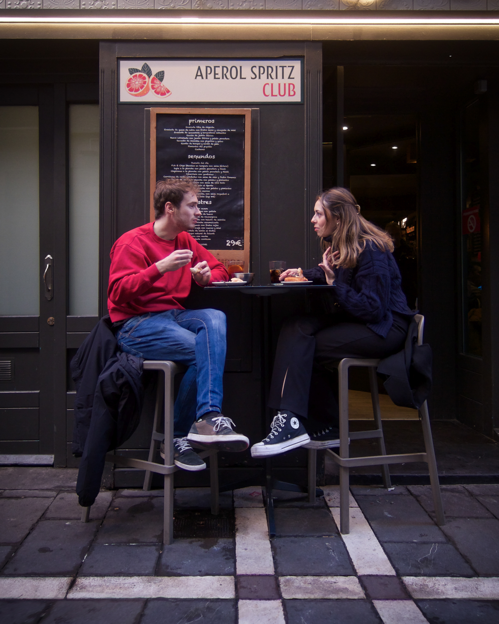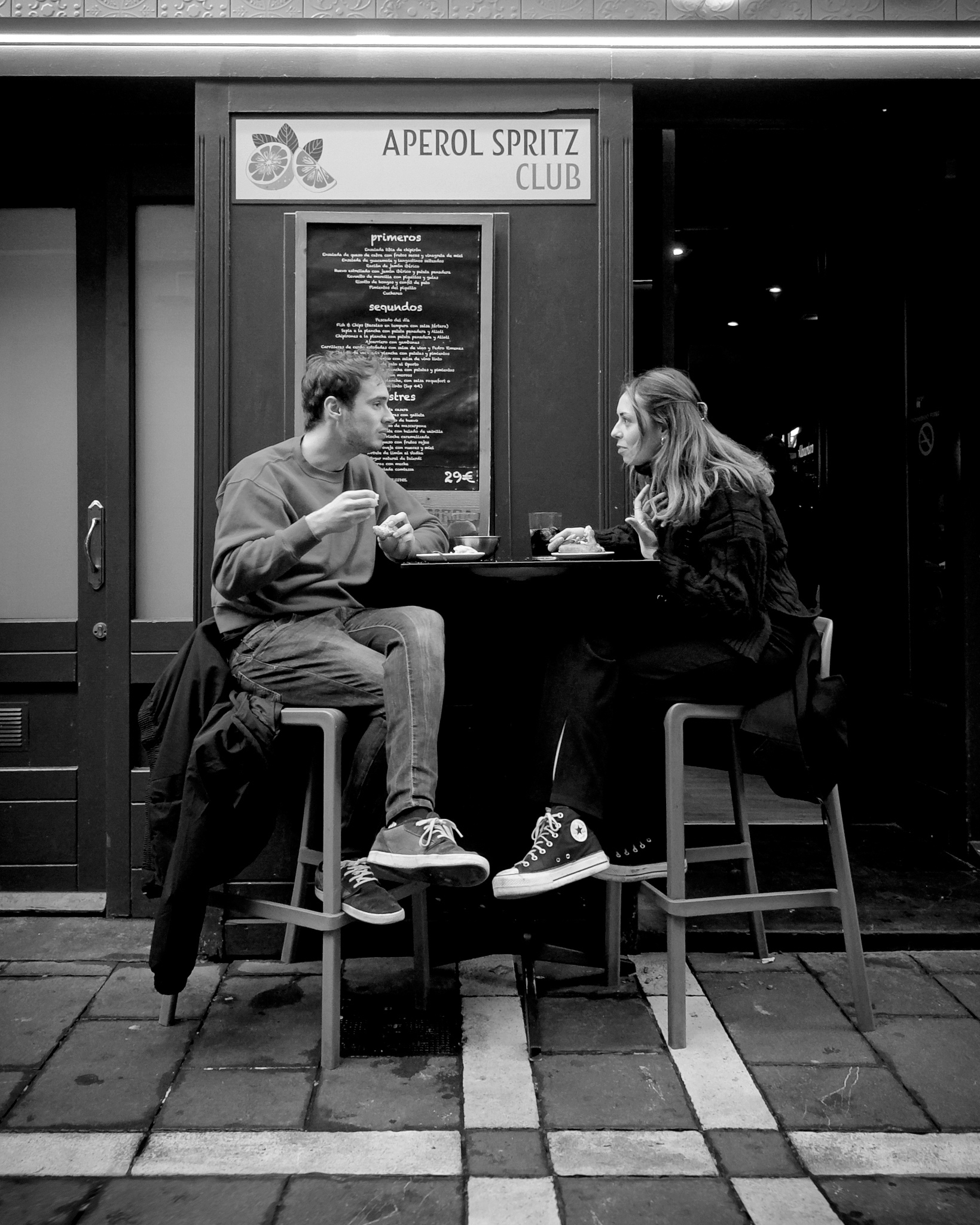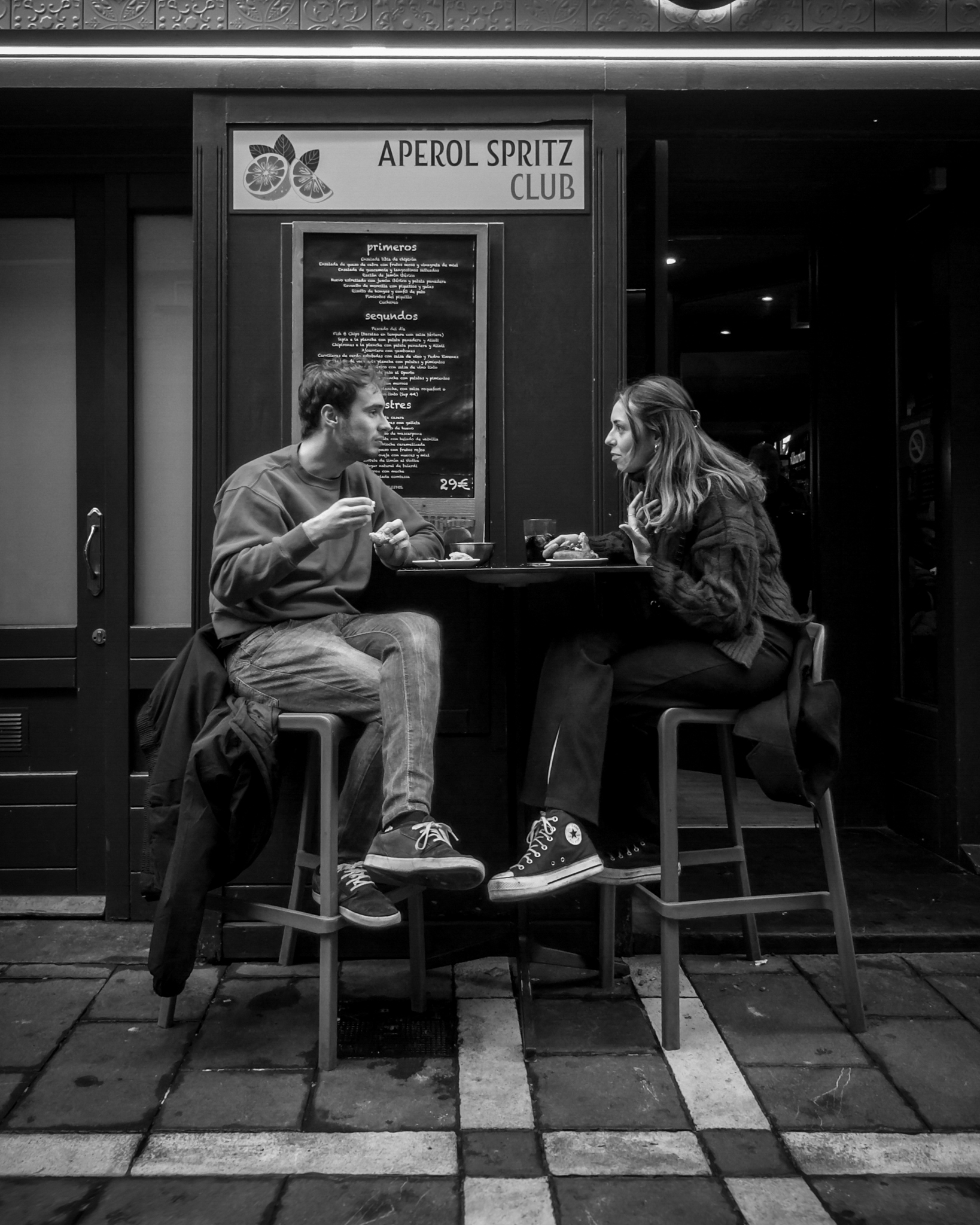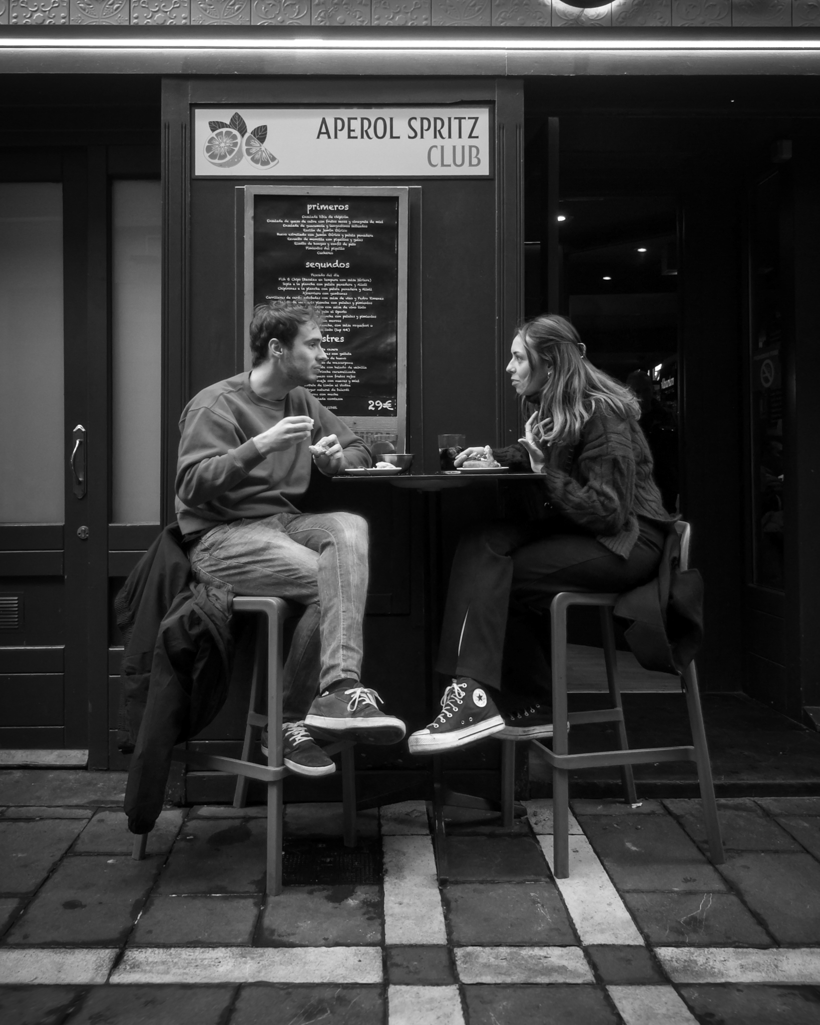 Looking at this again, the striking thing is that the man is in highly coloured clothes, while the woman has black trousers and a very dak blue sweater. Unless enlarged, the sweater actually looks black on my screen. Perhaps you can make the blue of her sweater a bit lighter.