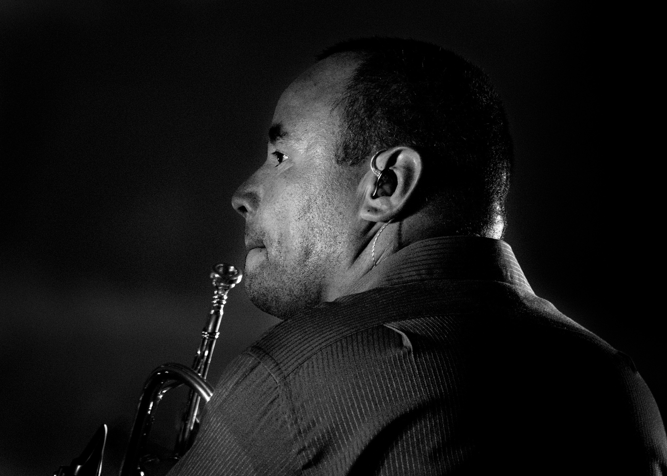 The performer is multi-instrumentalist Johnny Holliday performing at an outdoor jazz concert in 2014. The image was made from backstage during his performance. Reprocessed from the original RAW file today.