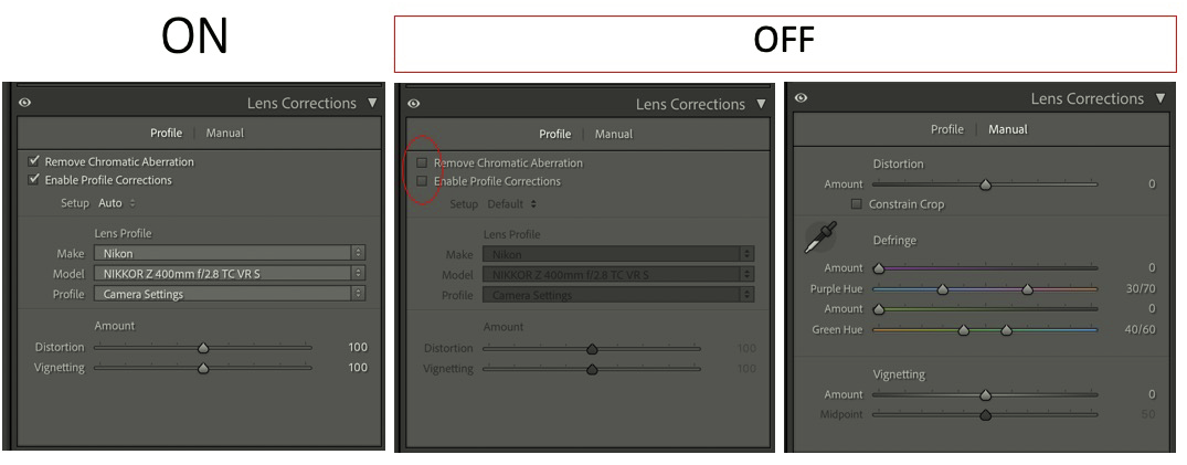 Here’s an example from my Z9 w/ and w/o (or w/o and w/ I don’t know) lens corrections in LR:
