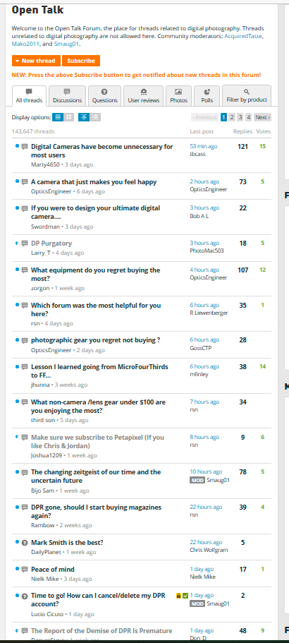 While I have only participated in a quite small part of dpreview (Adapted lens talk) - which means I probably don't have a very good indication of how a really populated, active forum looks like - I'm quite impressed by the amount of activity here, where I'm also taking a look at other areas. It's interesting to see and I feel like it might be a benefit to re-think the whole structure and see this as an opportunity. I'm sure there are several examples but here's just one observation:
