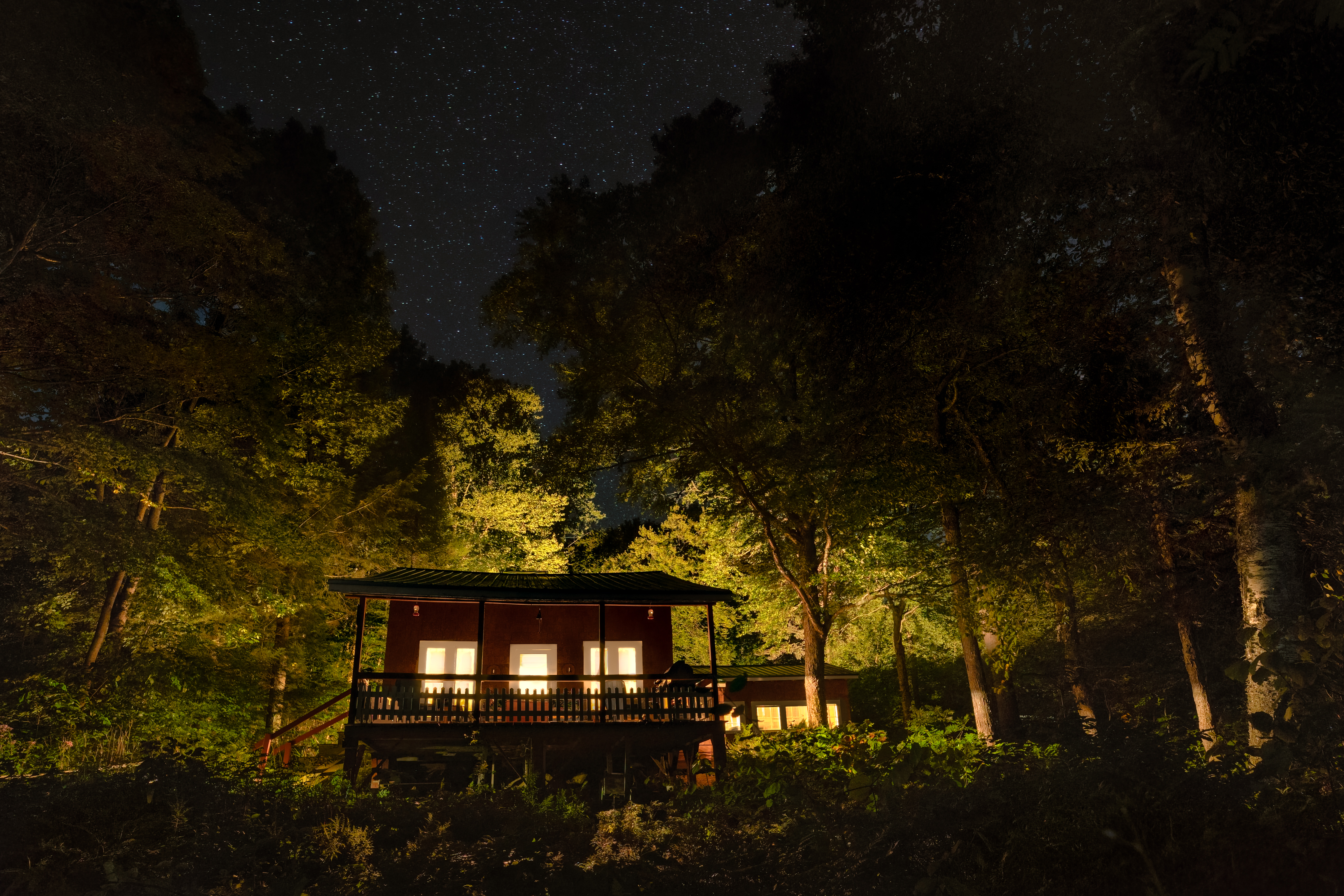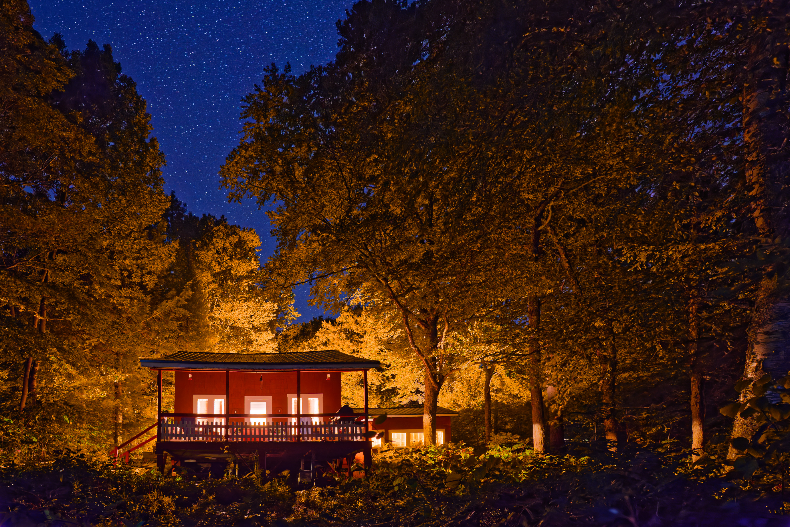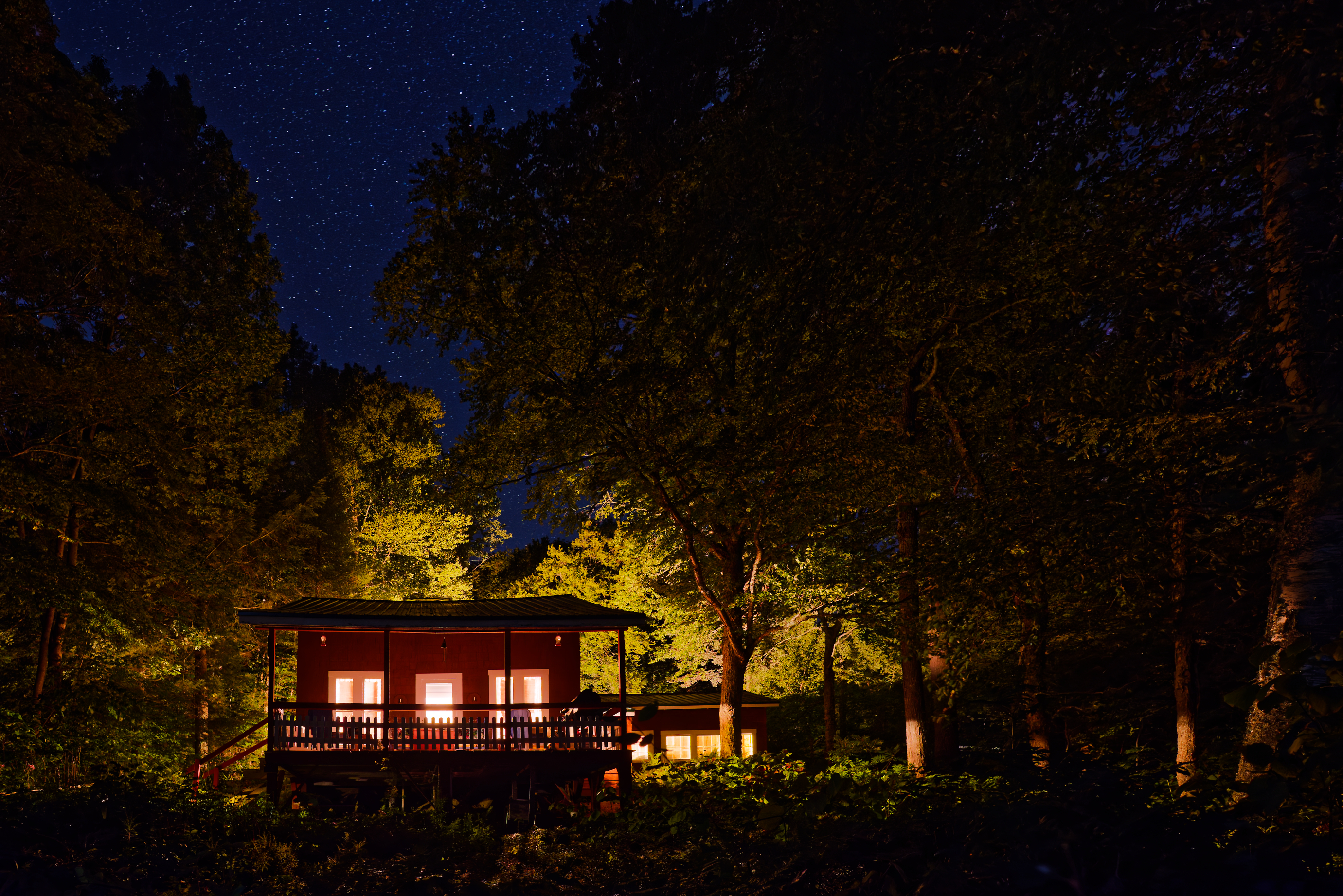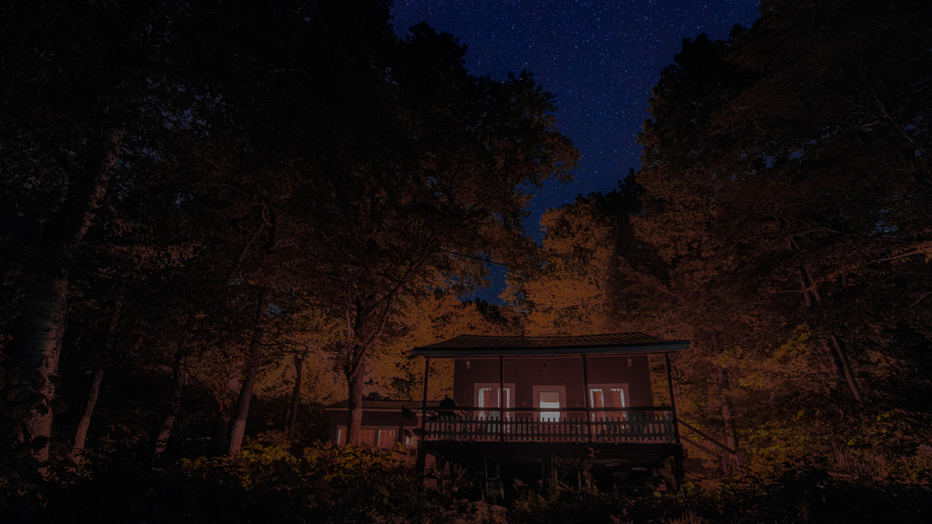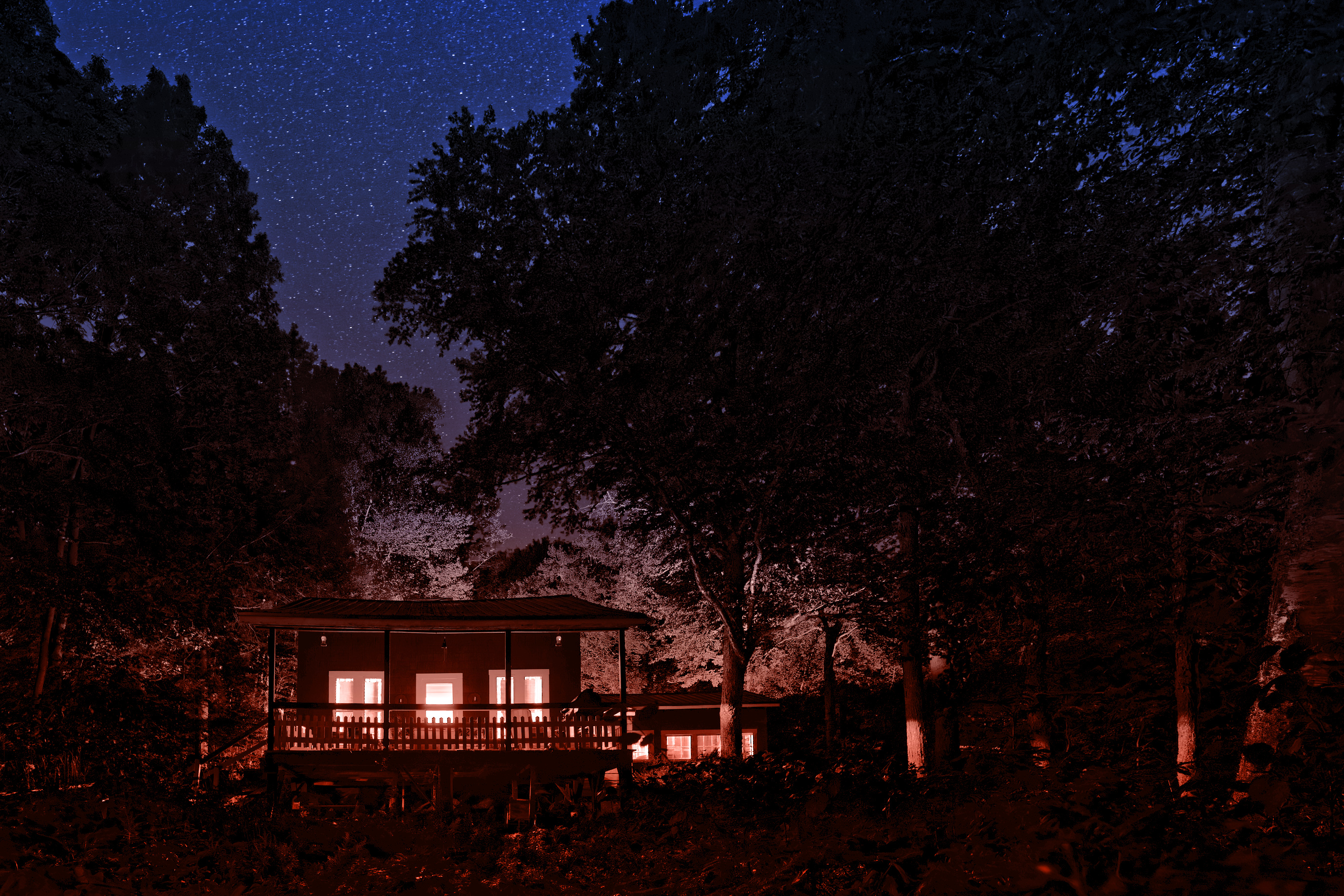 A bunch of problems to deal with here, blown highlights in the house windows, mixed light sources/white balance issues, lots of dynamic range, a generally undesirable distribution of light and contrast. Good luck...
