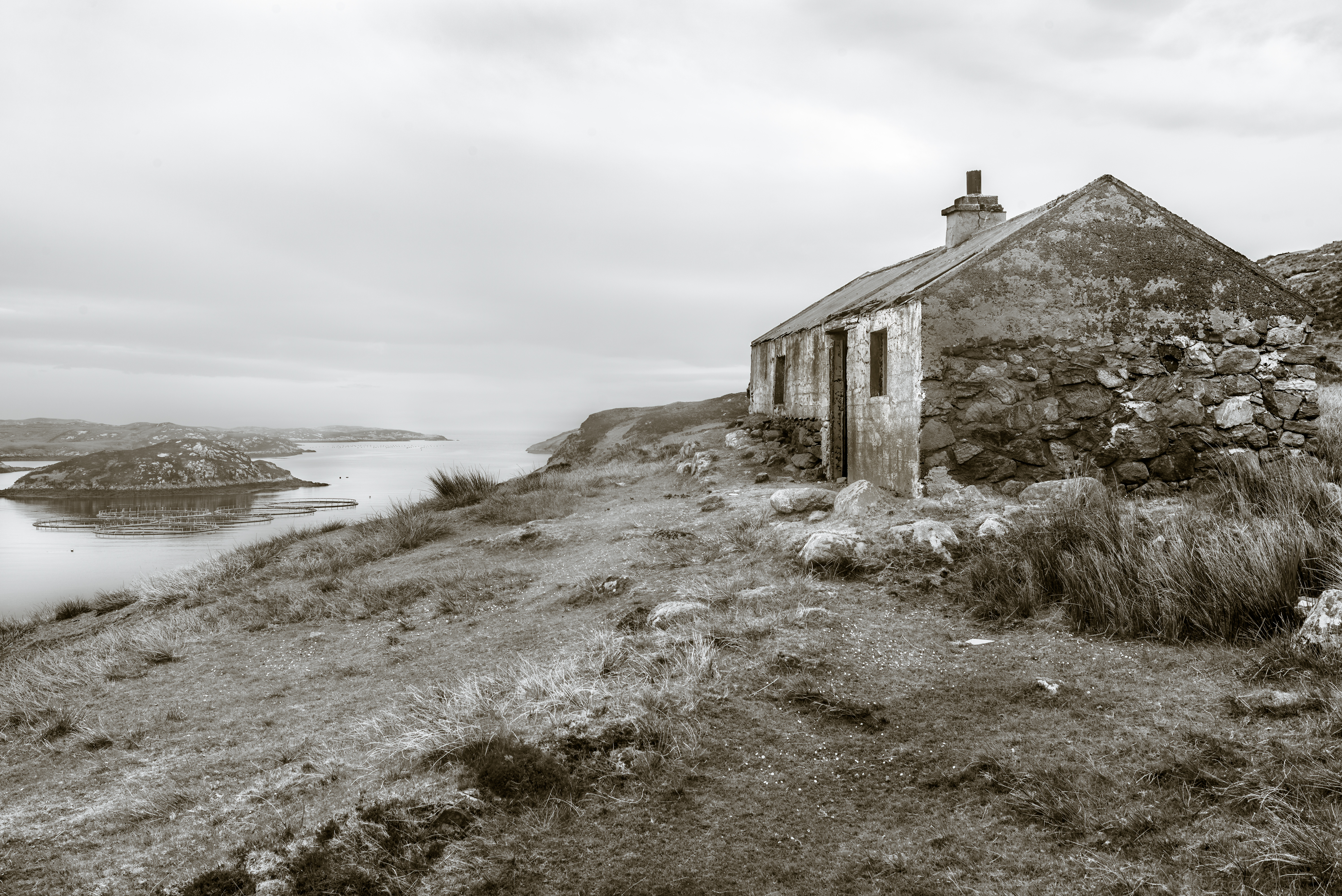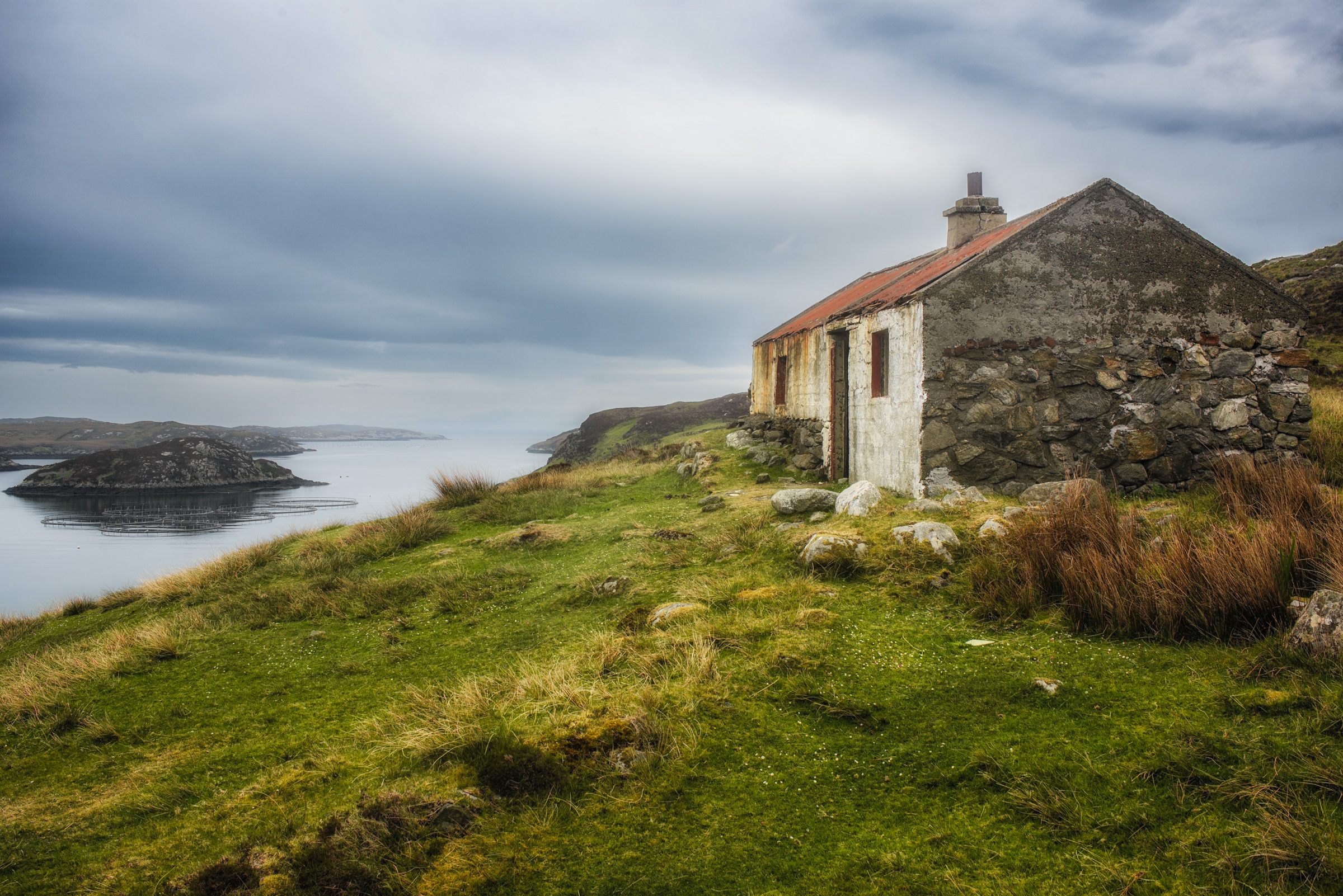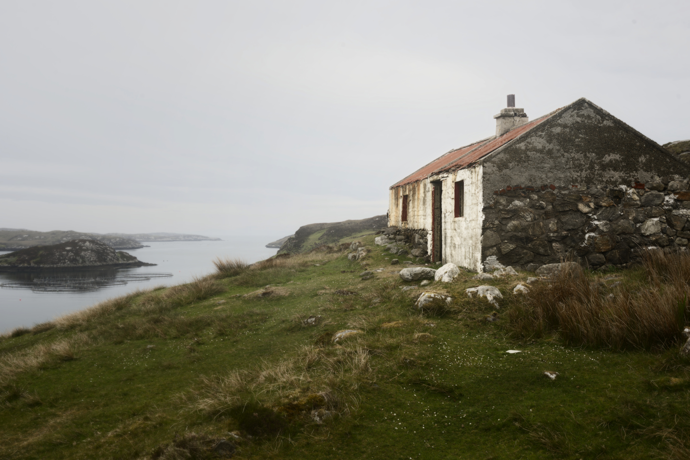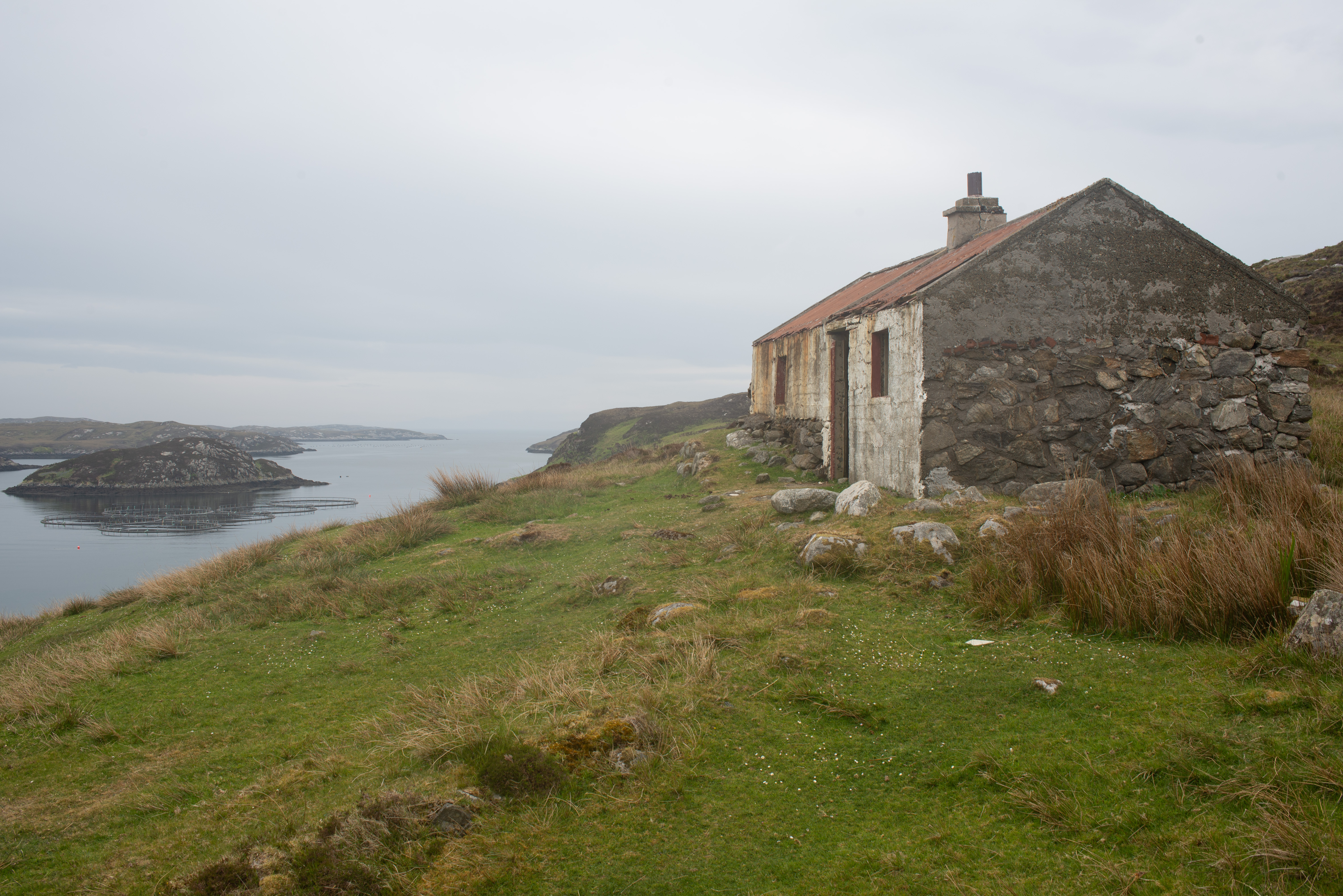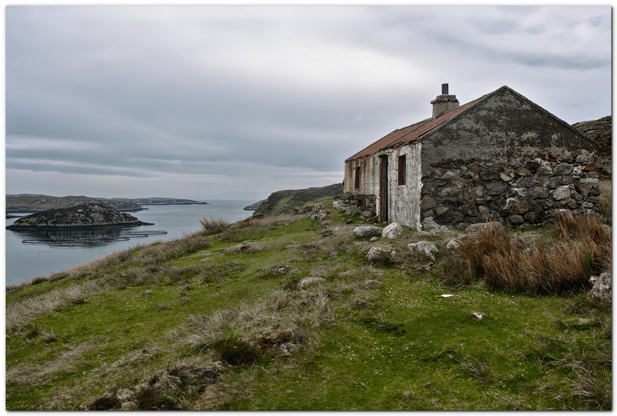 About the image: Kicked off the fertile lands on the West Coast during the Land Clearances the Islanders were forced to make a living of the unproductive land on the East Coast or fishing in The Minch (which was later over fished by the EU fleets). This is an old Whitehouse, cheap government replacement for the old Blackhouses and are little more than a shuttered concrete pour under a corrugated roof, this one over the remains of a older stone building. No damp course and no insulation they were unsuitable for the climate and hastily abandoned when newer, insulated homes became available.