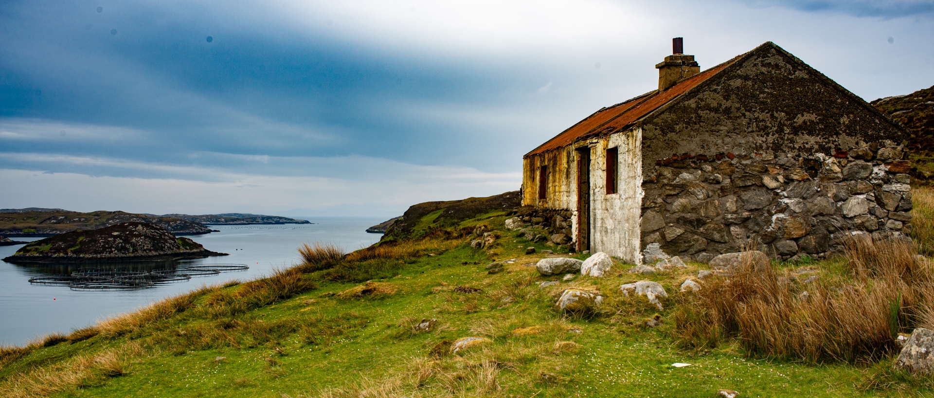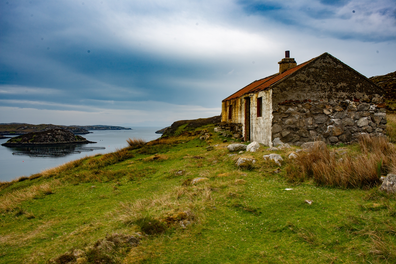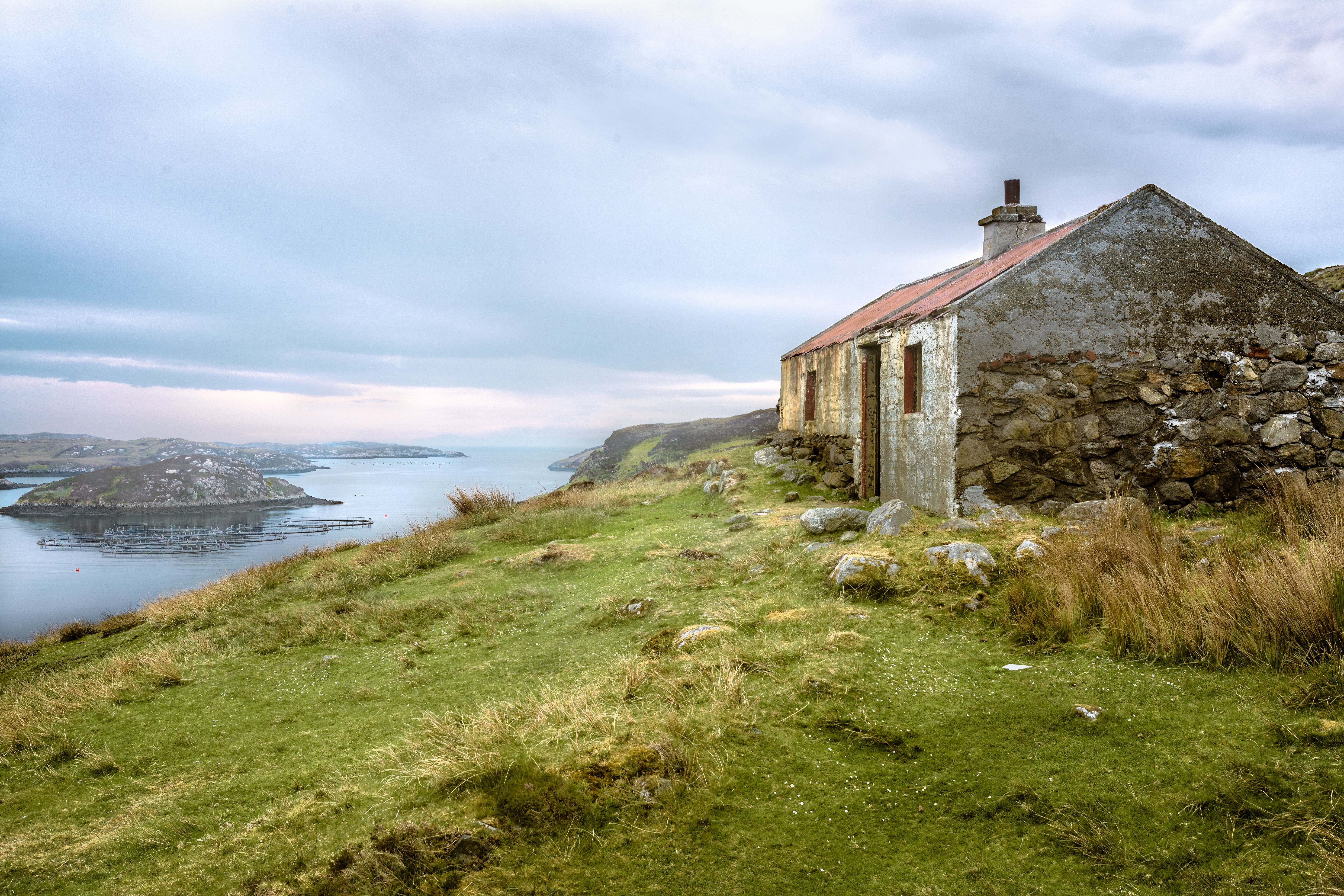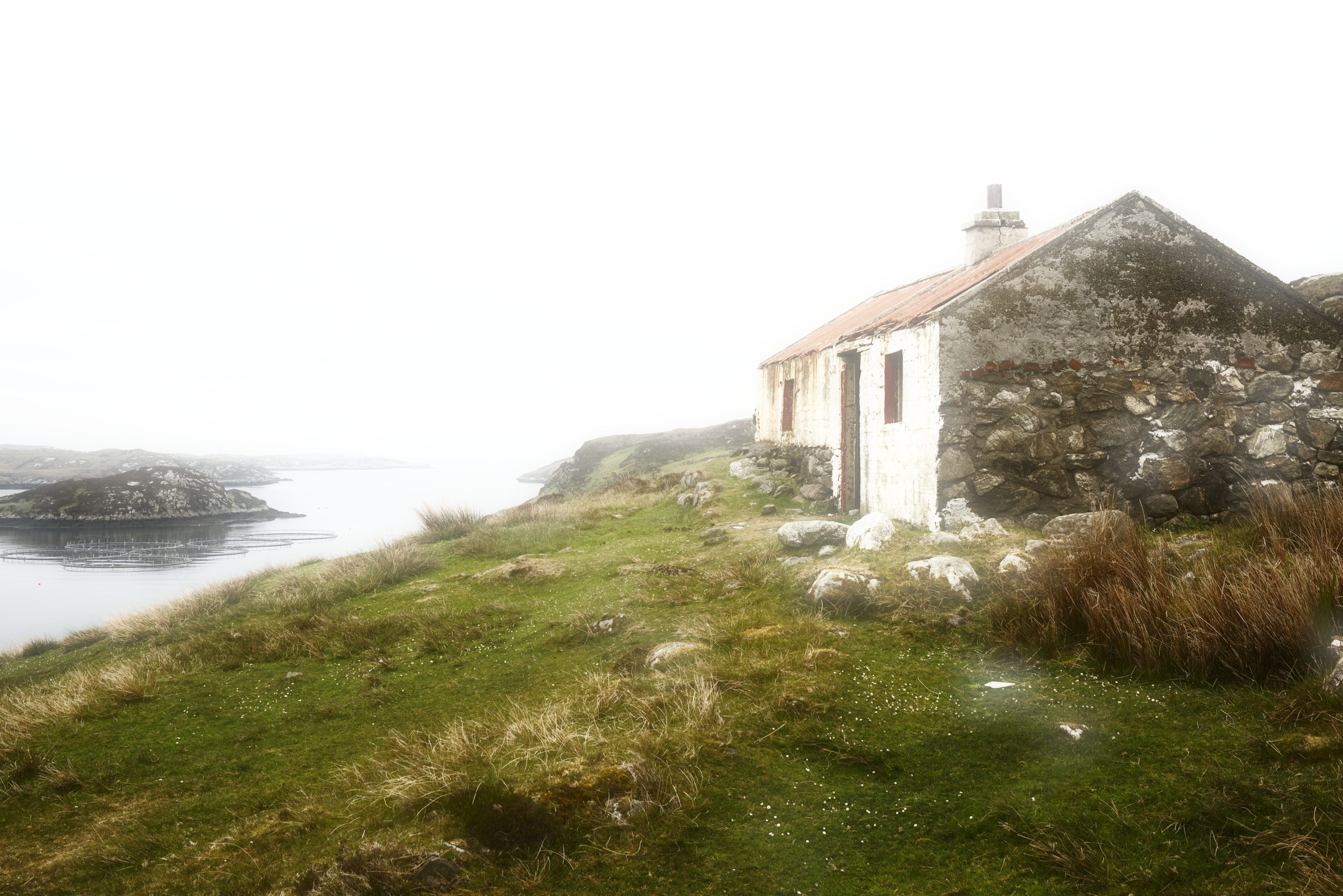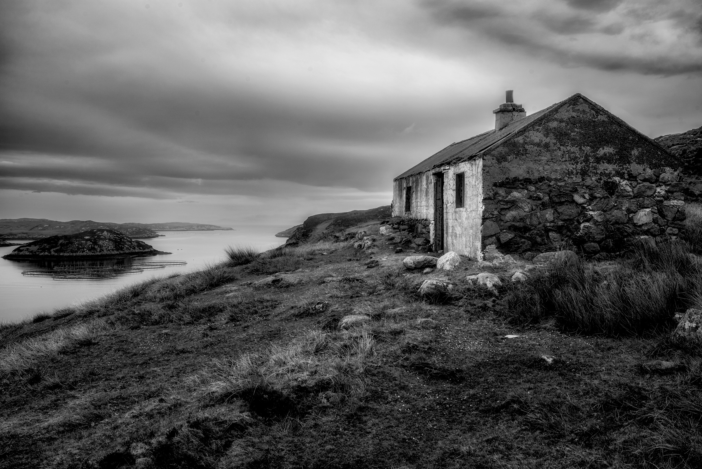 About the image: Kicked off the fertile lands on the West Coast during the Land Clearances the Islanders were forced to make a living of the unproductive land on the East Coast or fishing in The Minch (which was later over fished by the EU fleets). This is an old Whitehouse, cheap government replacement for the old Blackhouses and are little more than a shuttered concrete pour under a corrugated roof, this one over the remains of a older stone building. No damp course and no insulation they were unsuitable for the climate and hastily abandoned when newer, insulated homes became available.