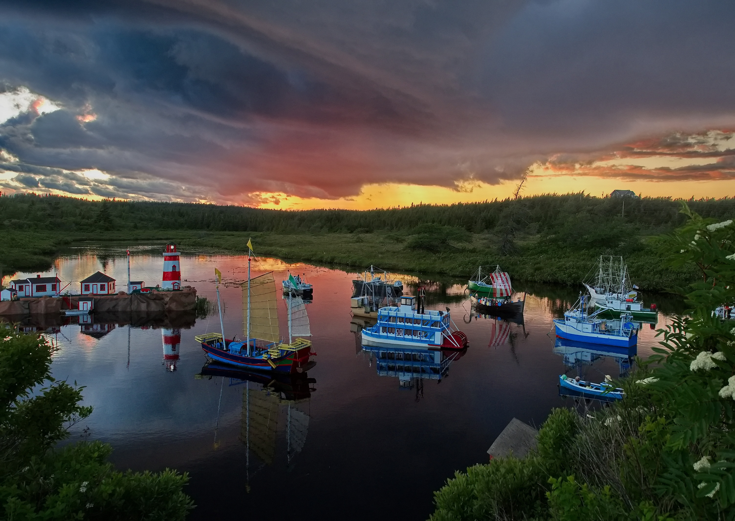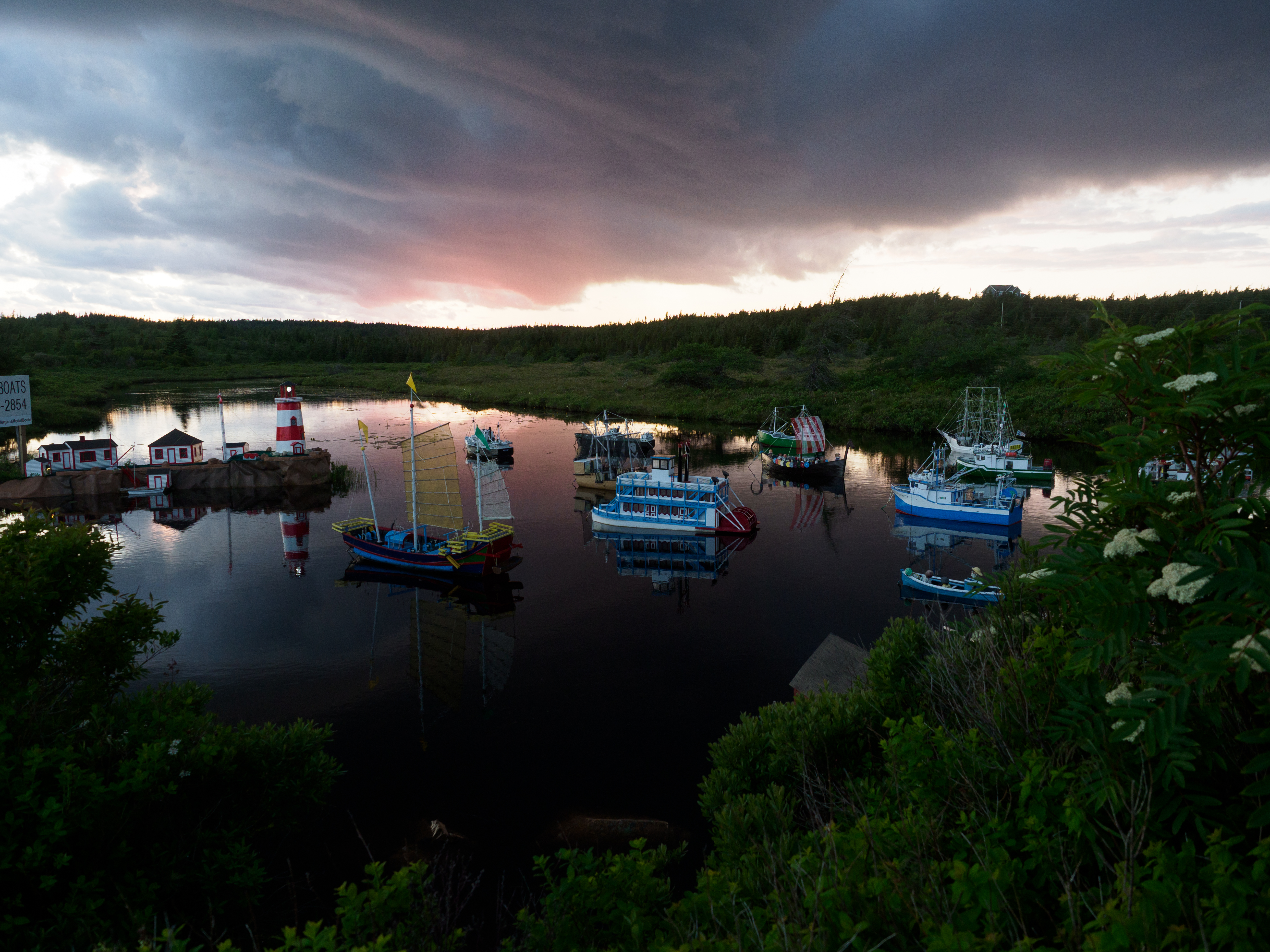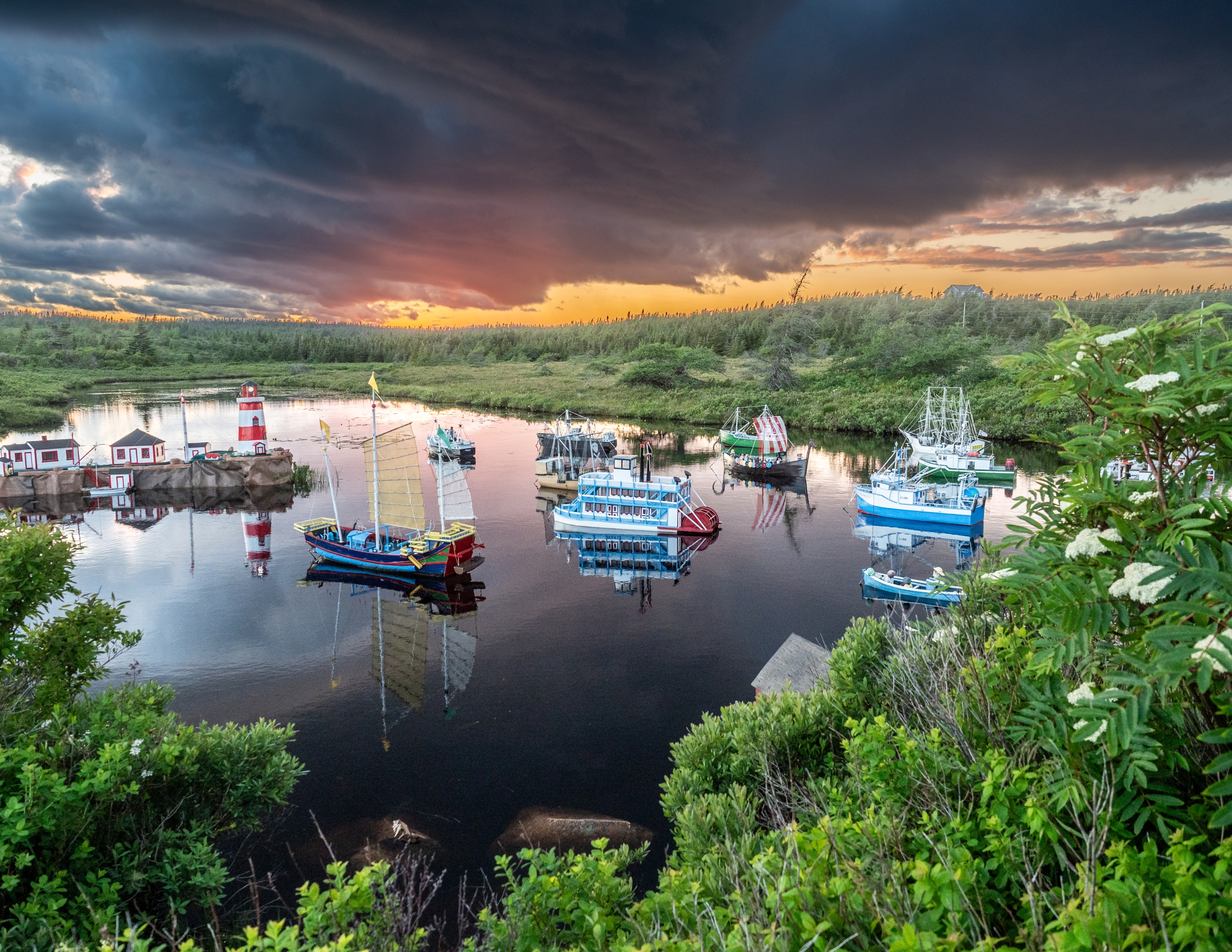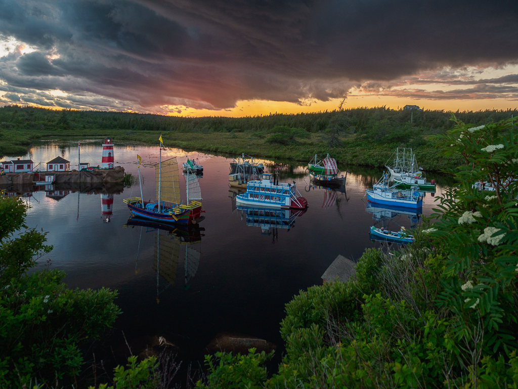 About This Image: I have never been more confounded by an image. It was taken in Newfoundland in the wilderness section of the Avalon peninsula, near the village of Witless Bay. A fierce storm blew in from the sea, making the day dark as night. We pulled off the road on a gravel pullout and waited it out in the car. As the sky brightened afterwards, we noticed a path over a slight ridge, explored it, and found this scene. Dozens of little boats, carefully built, each about 3-4 ft tall, bobbing in the river. A sign noting the builder. I thought that with the threatening but colorful sky and all those boats and reflections I'd be able to make something interesting of it with editing and cropping. But I never could. Maybe you can...JPG below, original raw file (ORF) in dropbox here www.dropbox.com/scl/fi/3cwv0i9thgatnndm381lp/last-week.orf?rlkey=5jgl9wops8yg63m15dfhgertu&dl=0
