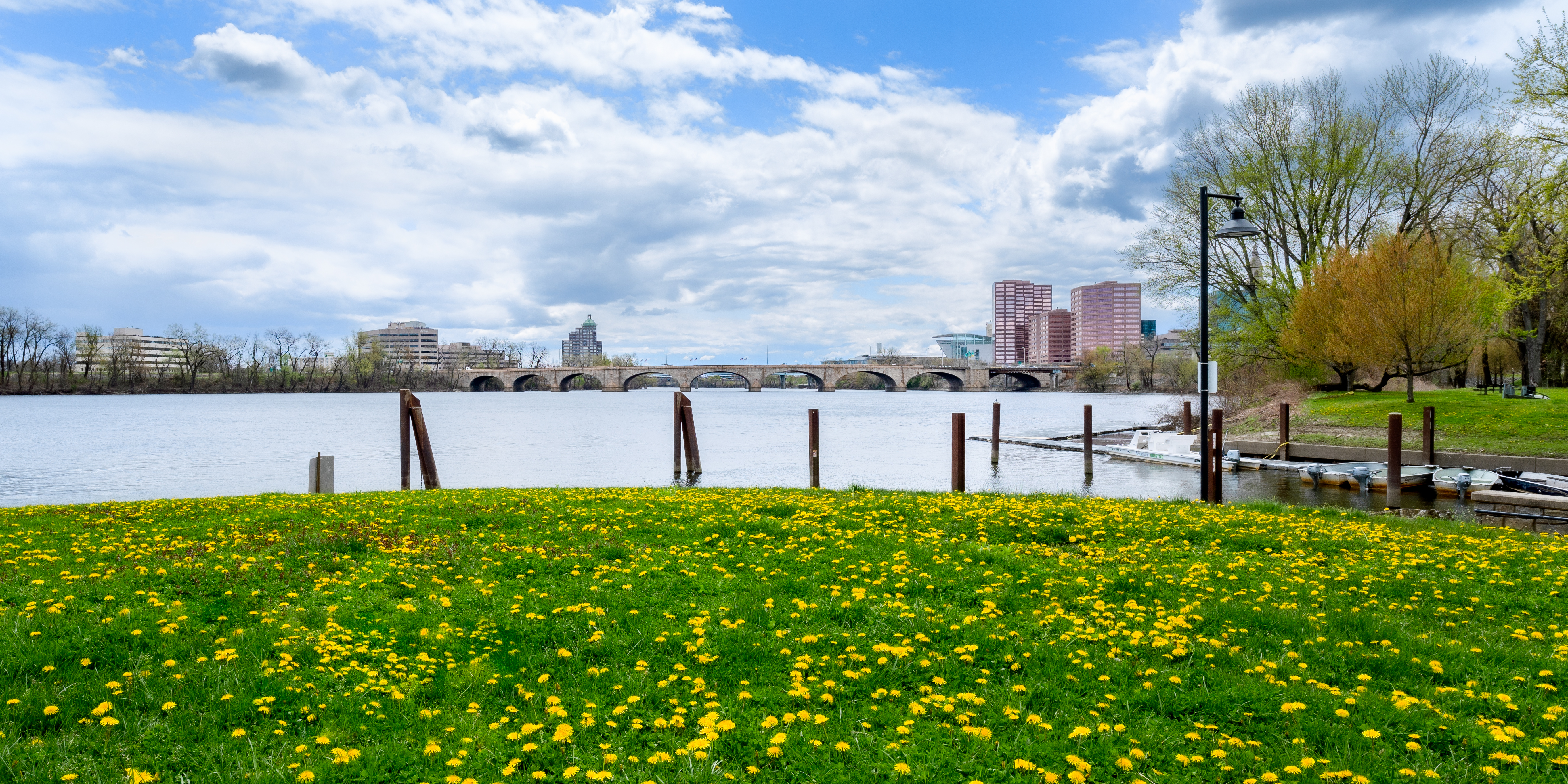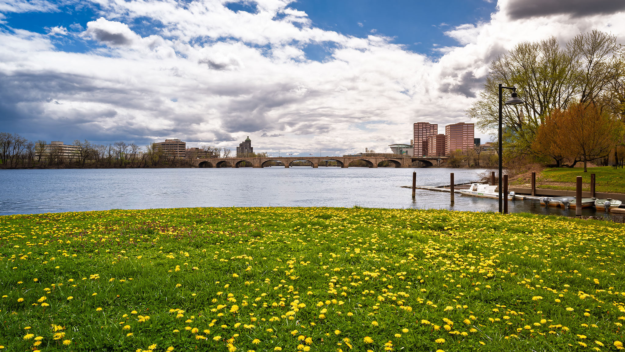 The central horizontal waterline would usually be a bit weird and unbalanced, but the grassy foreground with the dandelions brings everything back into balance. And the vertical elements in the shot play their part too.