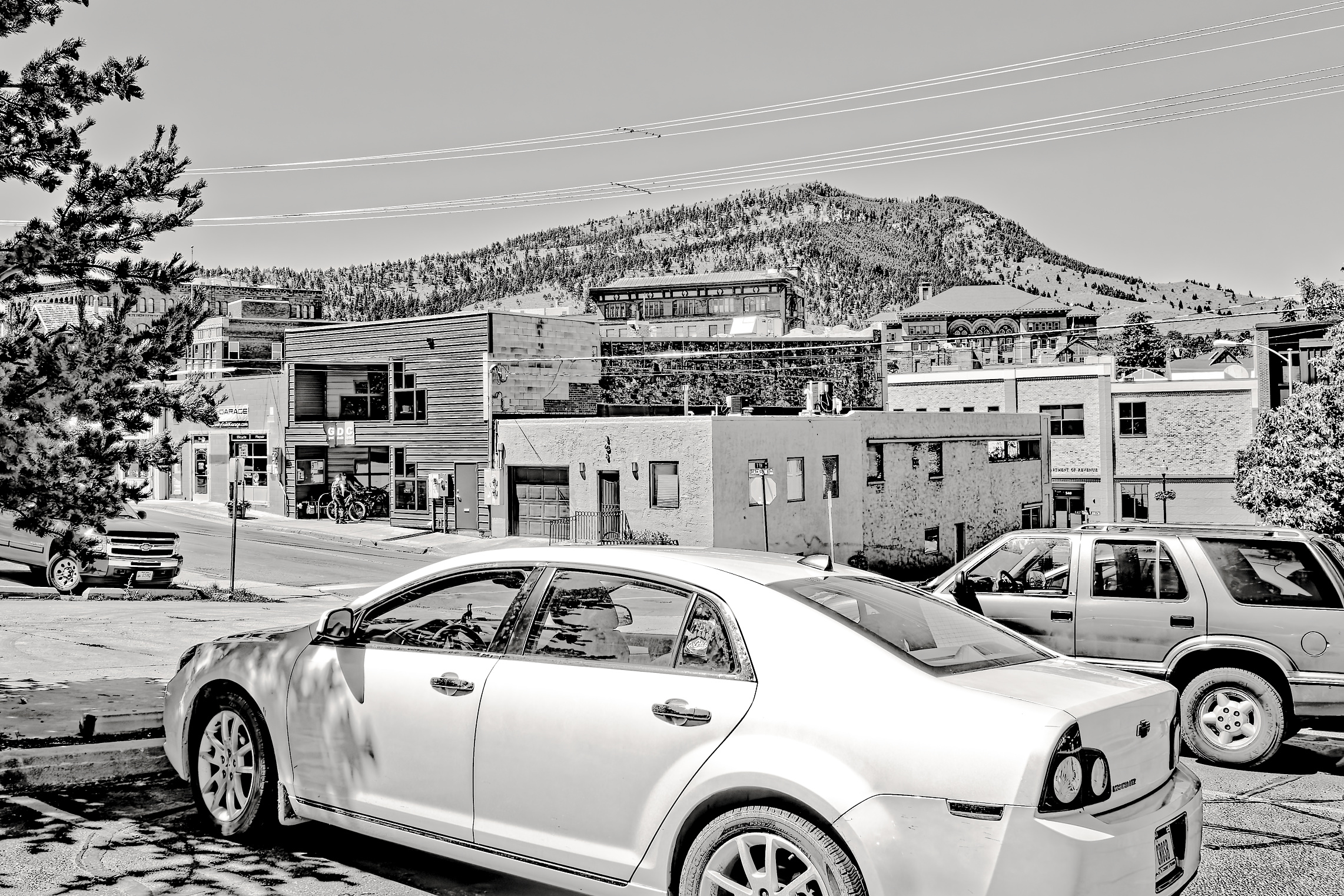 Unless cropped more aggressively (which doesn't give a lot of great options either), you're kinda stuck with the cars in the foreground. I just toned them down a bit to make them less distracting, and processed the rest in my usual reality based manner. Not being being too keen on swapping skies, I kinda like how the bright wires add some visual interest to the nice, but otherwise featureless blue sky...