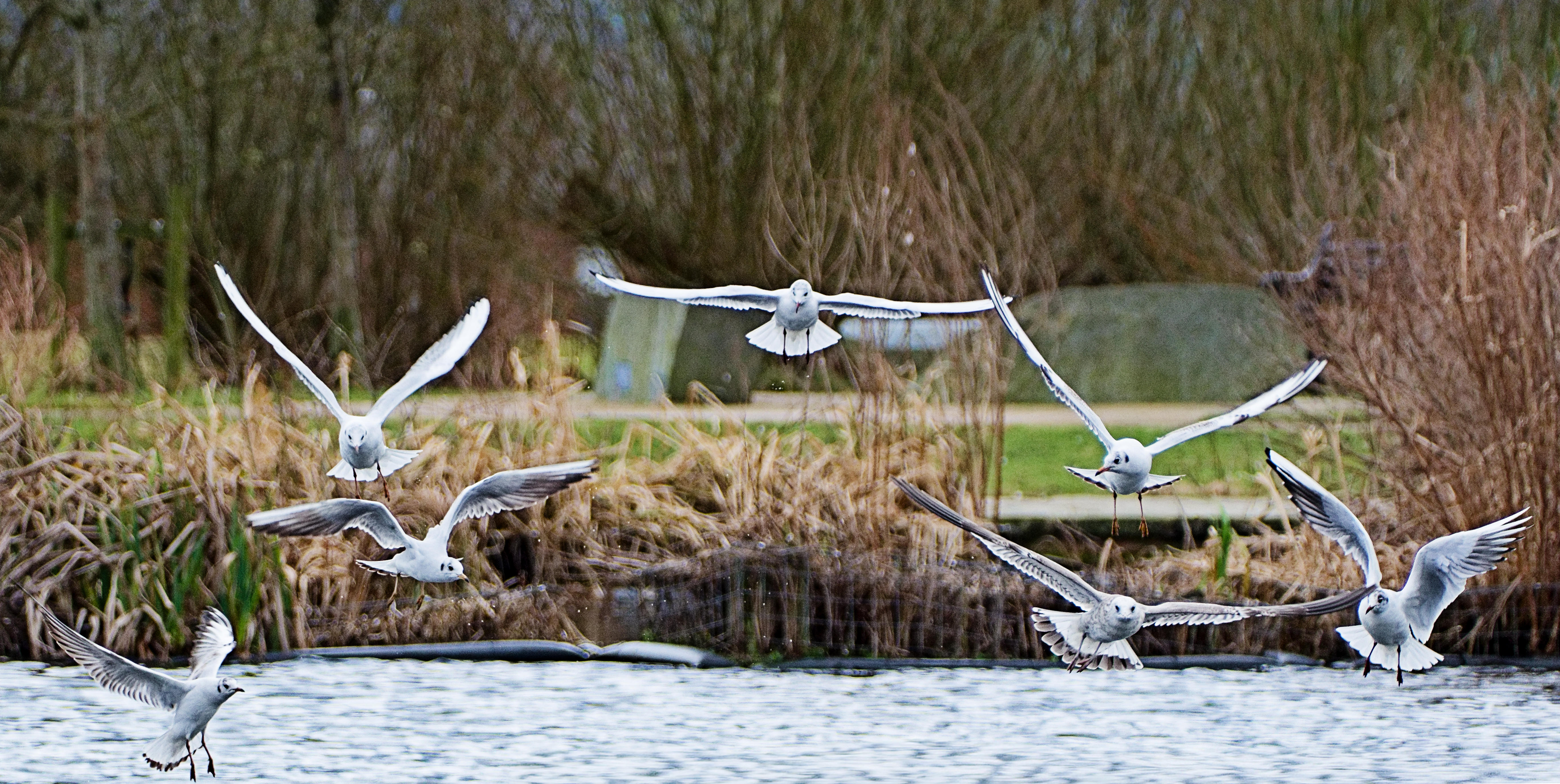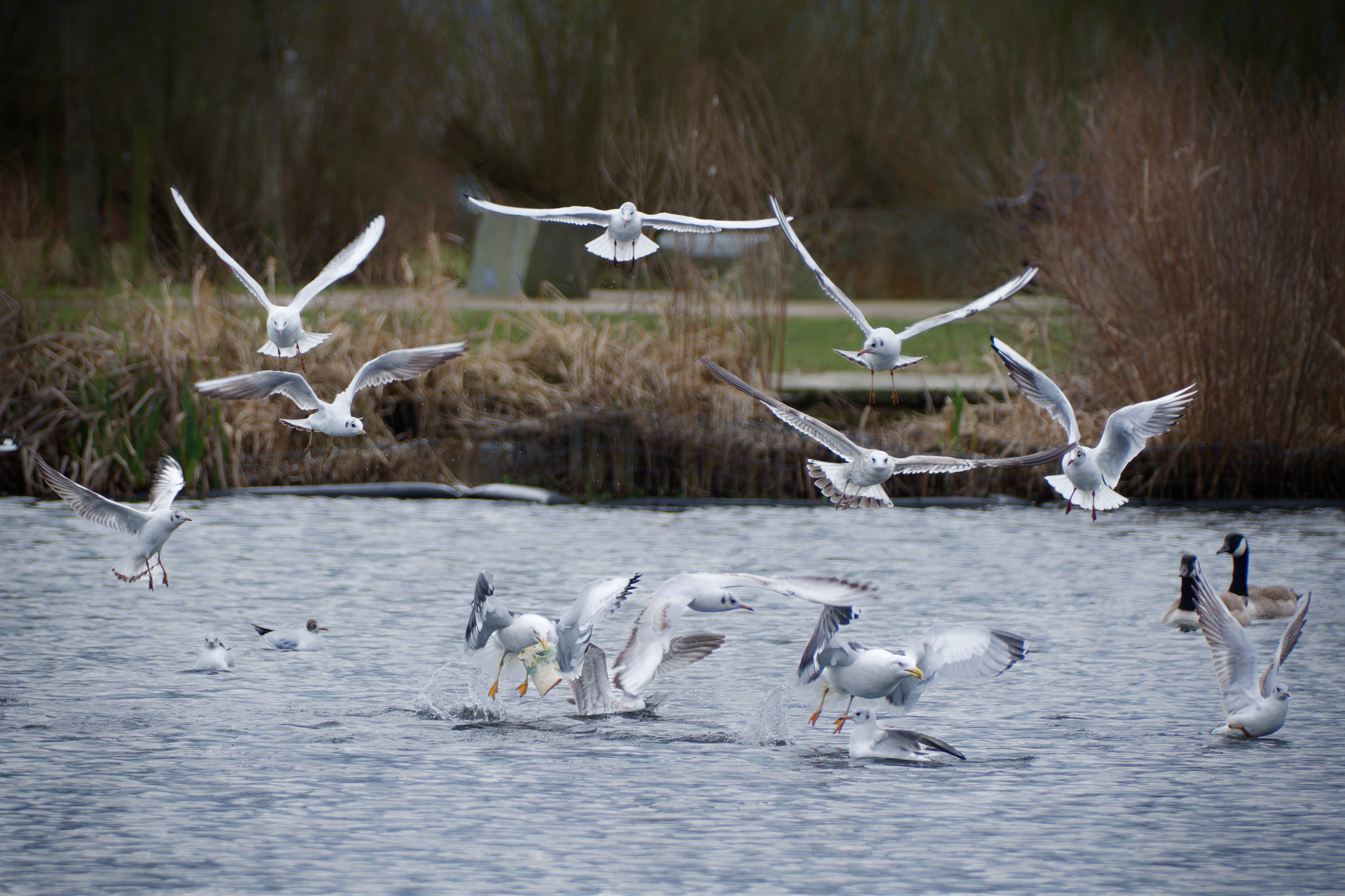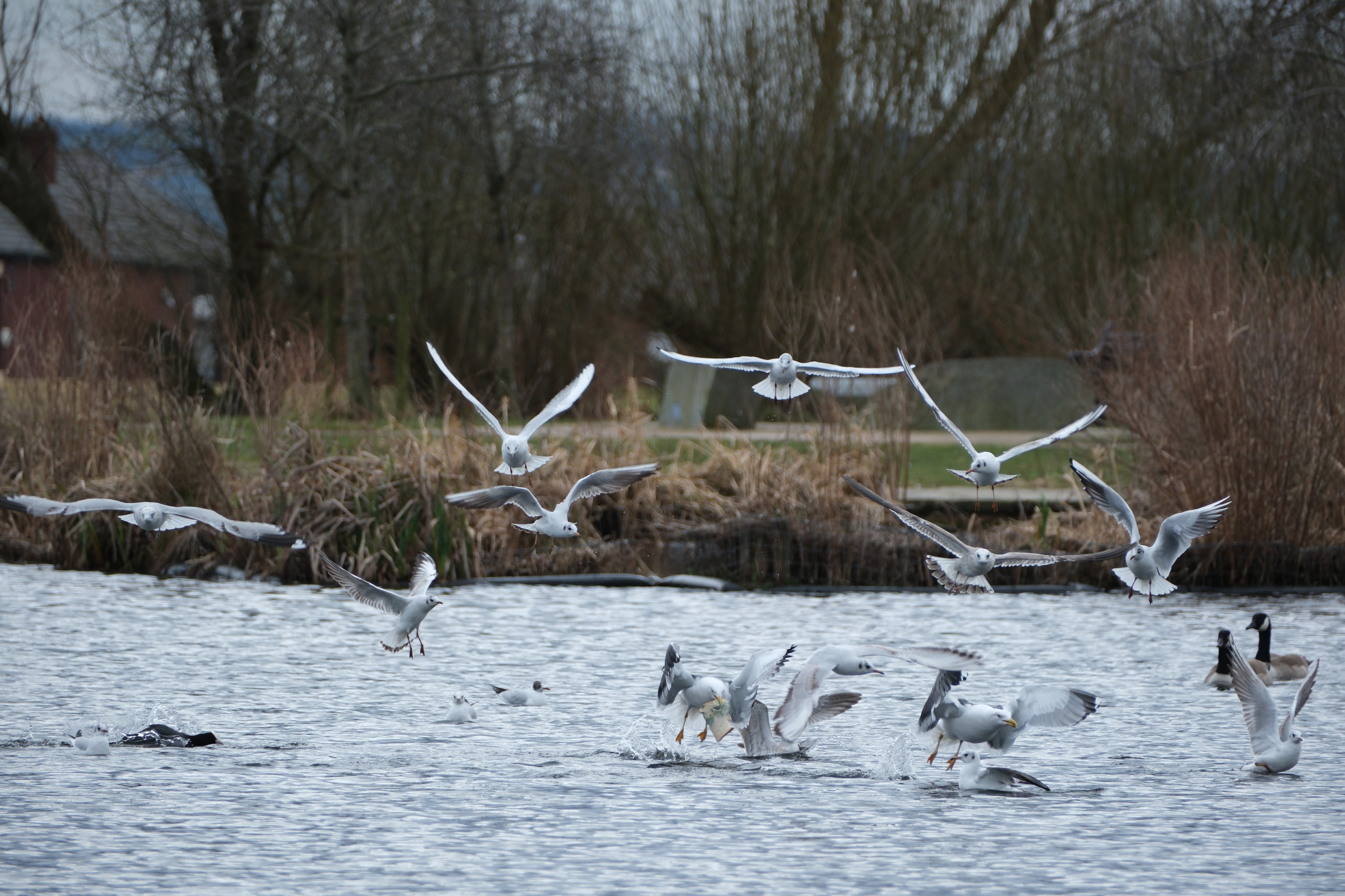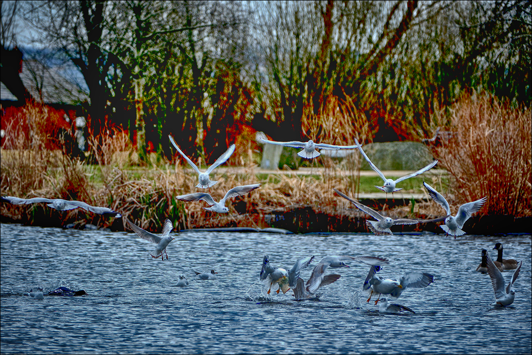 Birds over the pond. Lots going on , so feel free to crop/enhance to find something interesting.