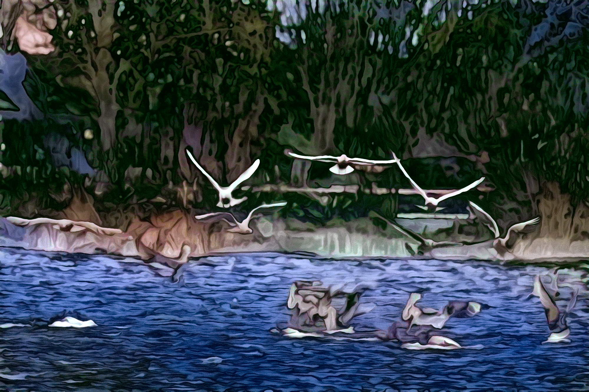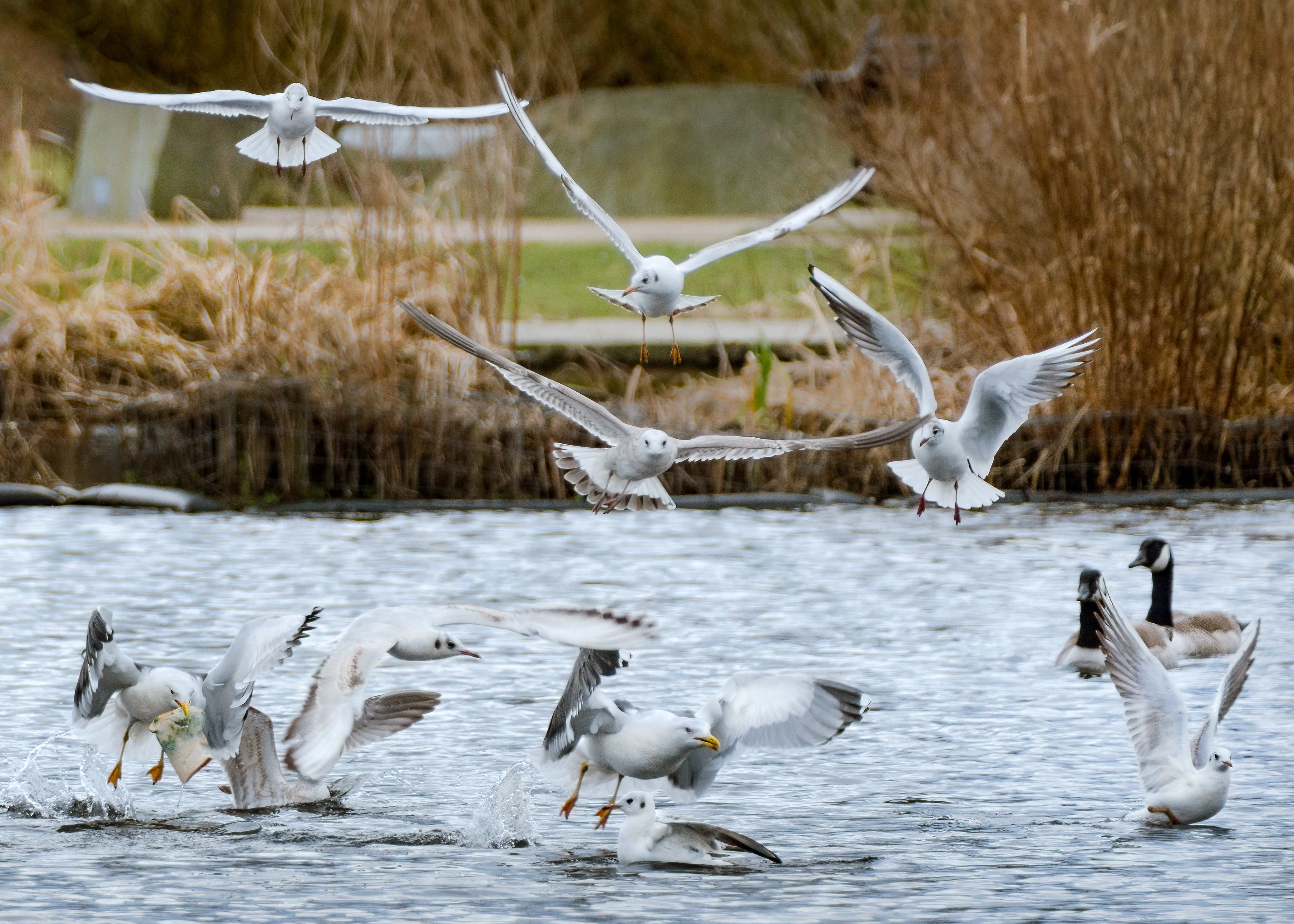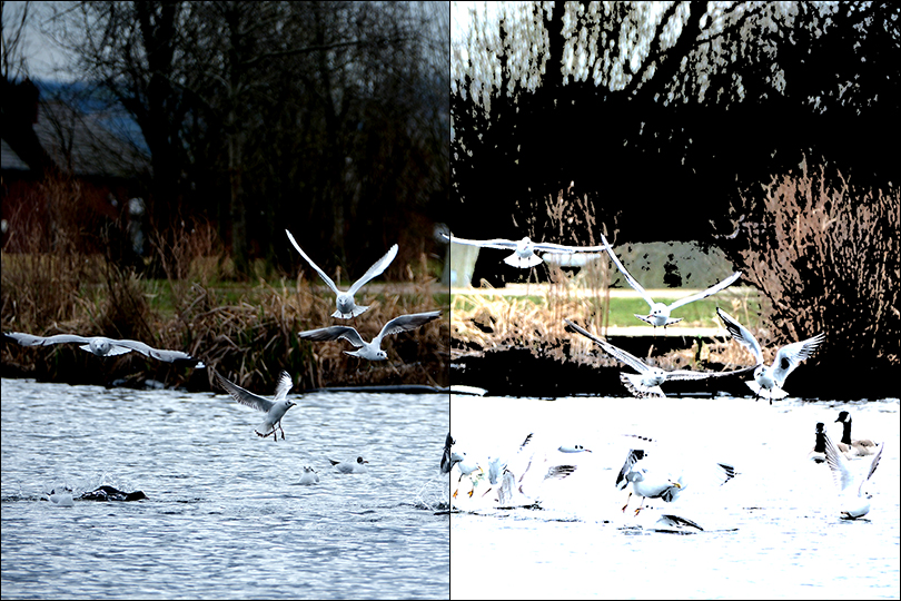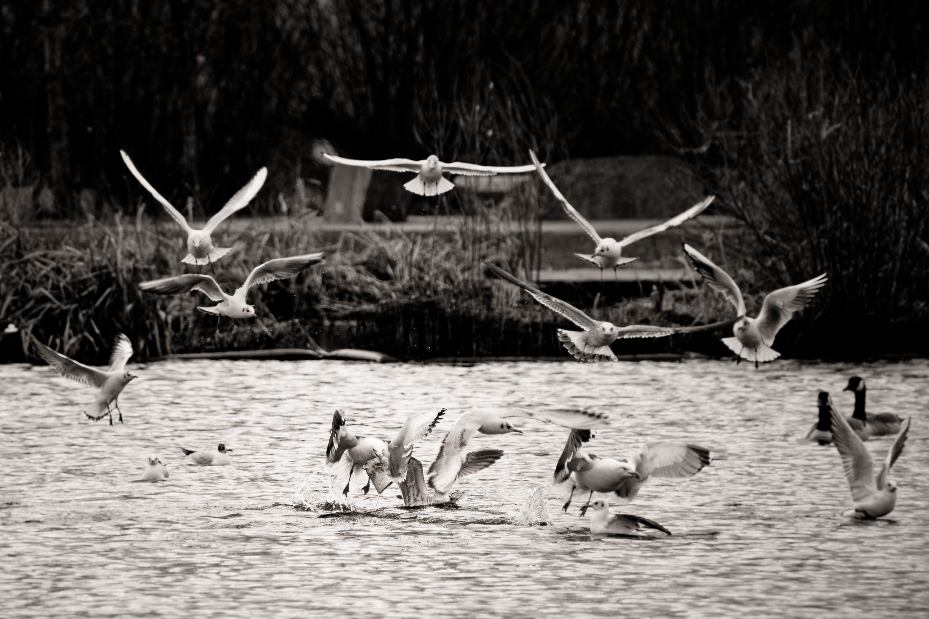 Birds over the pond. Lots going on , so feel free to crop/enhance to find something interesting.