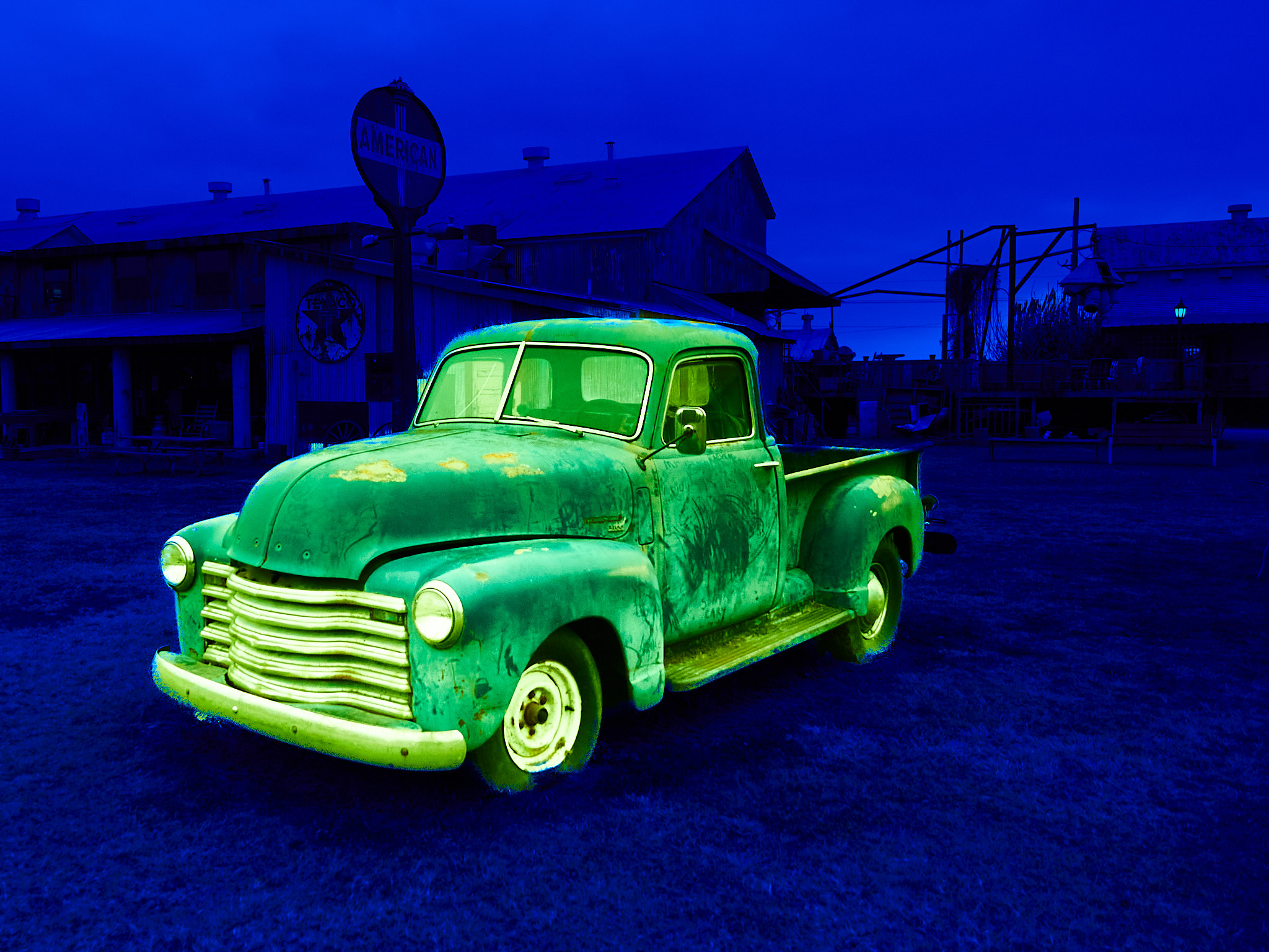 Excellent color change on the truck to a rusty orange instead of royal blue. Looks very realistic. There was a rusted truck just about like this parked on the other side of this field.