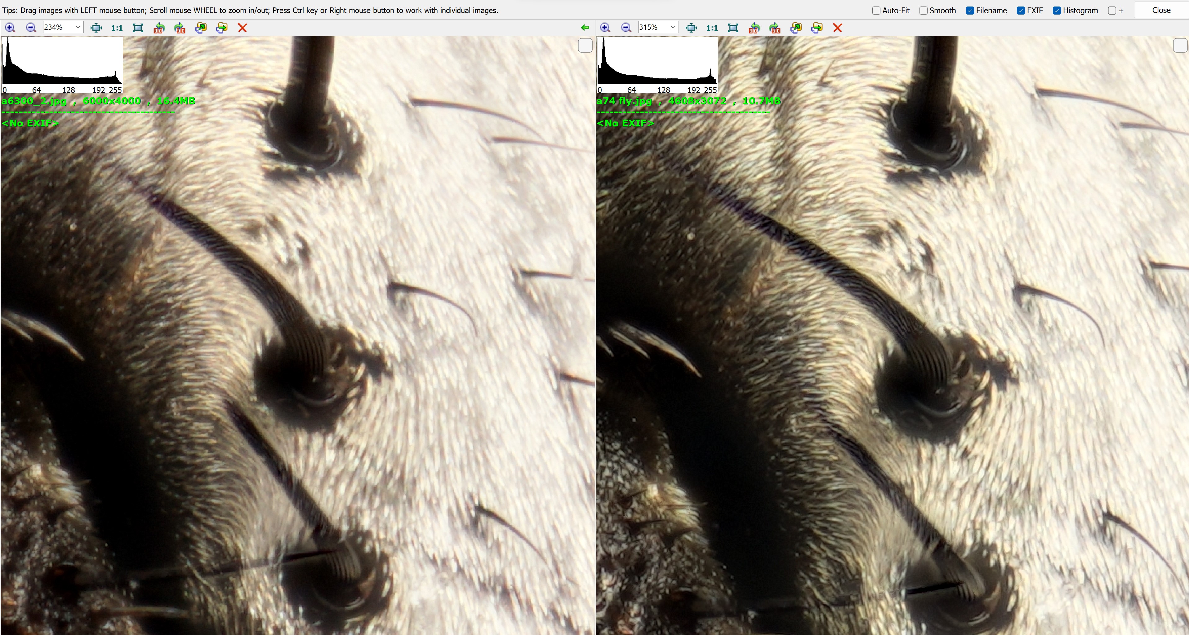 this is the stress test, flick between the 2 images full screen and see the diffraction softness,between different size pixels. i had a dead fly laying around, again ive done this test before. so you can imagine as soon as i shoot the a74 on full sensor it blows apsc away, not even close.