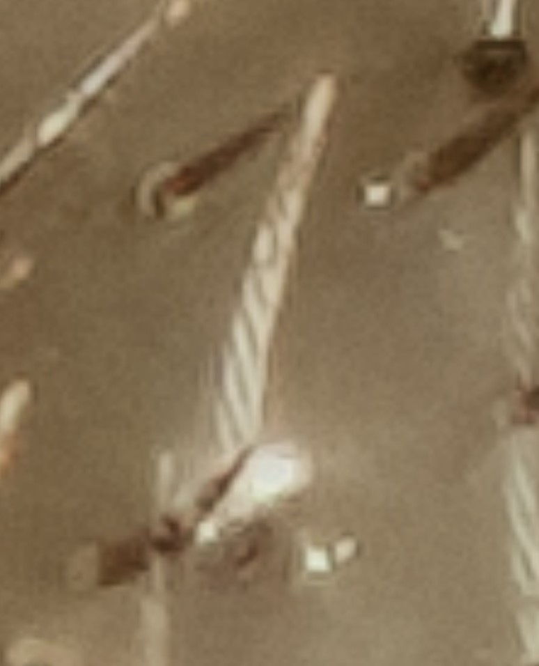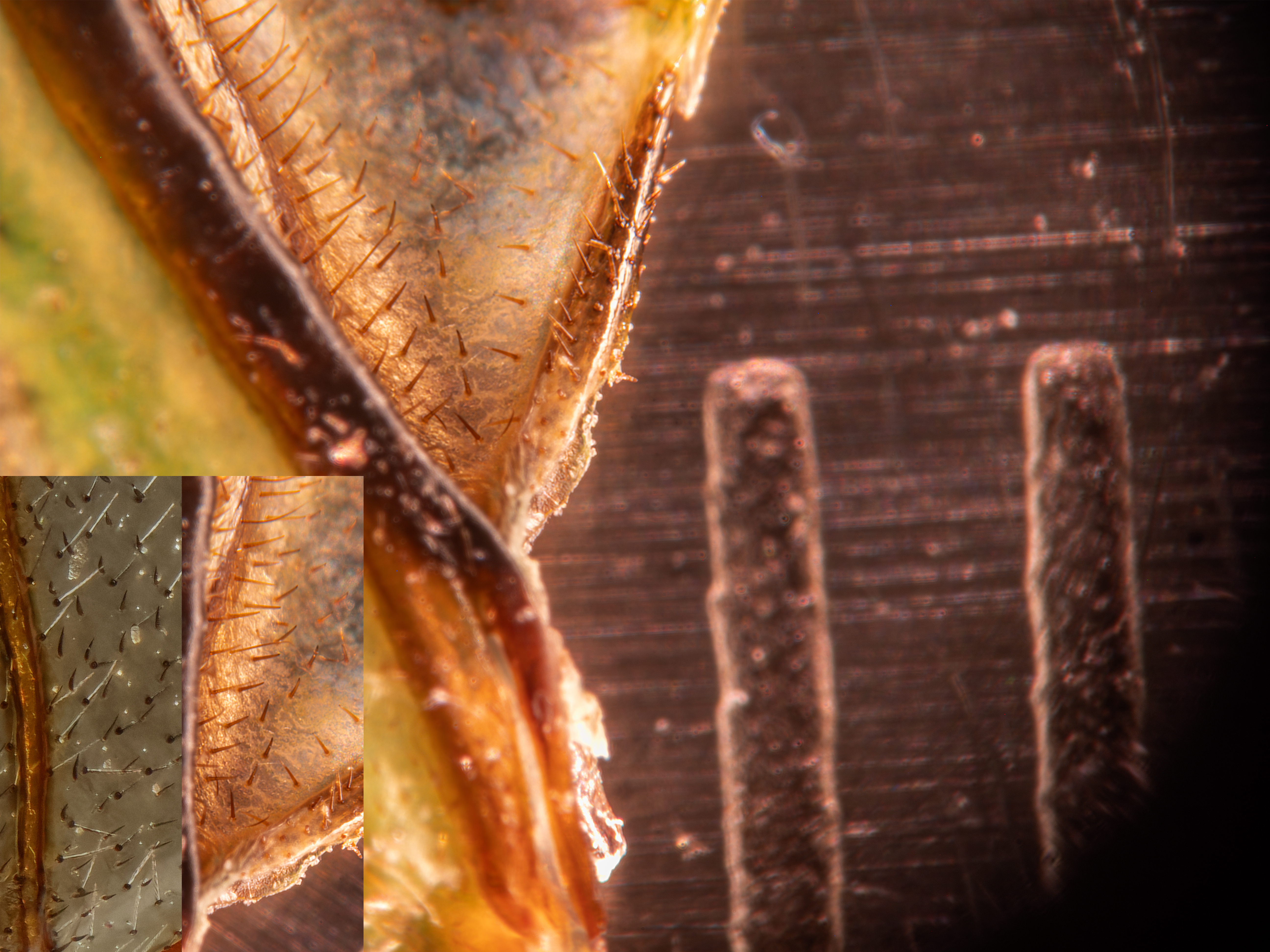 OK, I'll play even though I haven't been interested in macro photography for the last 20 years or so and didn't bother to purchase an Oly macro lens when I switched from Nikon. So, to get the kind of magnification you're working at, I had to kludge together my old Tamron 90mm macro and 2x teleconverters. In front of those I reversed a Tamron 28-75mm zoom, set to 28mm (all Nikon mounts although the zoom was "mounted" by bubble gum and chicken wire so-to-speak since I didn't have an appropriate adapter. This Rube Goldberg monstrosity was attached to my Oly EM1iii via a Metabones focal reducer. My subject was a Cicada wing salvaged from a dead Cicada my grandson came across in our backyard. Lighting was a PITA given the necessity of positioning the lens set very close to the wing. The wing was rested on a ruler to give a sense of the magnification involved. Those are millimeter marks at the bottom of the shot. For comparison purposes, I've inserted a crop from Donald's a7iv wing shot posted [here]