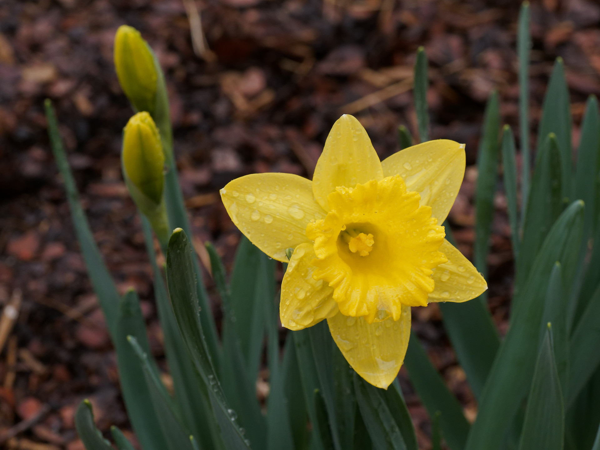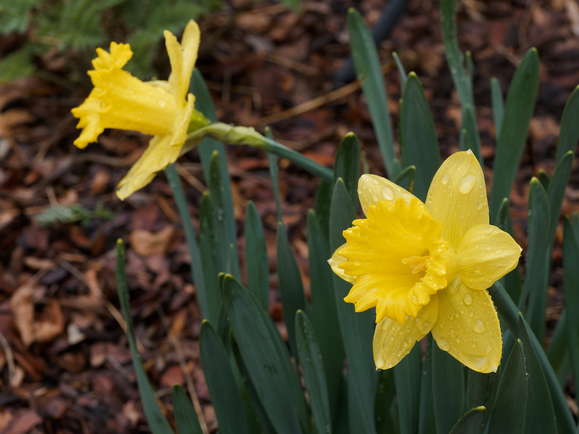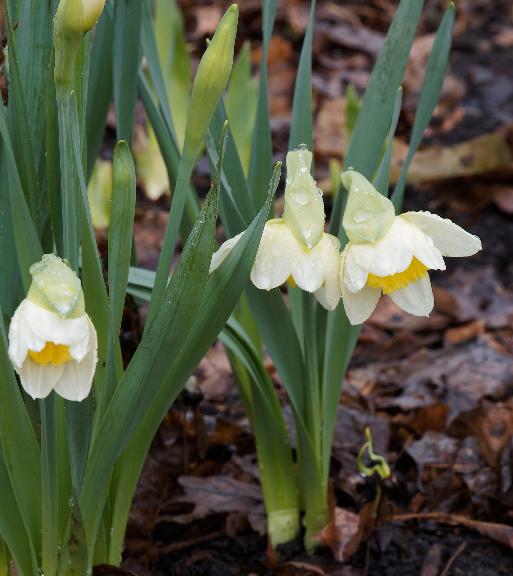 Today is 40 degrees colder than yesterday and it's raining rather than clear and sunny. The more daffodils are blooming anyway.