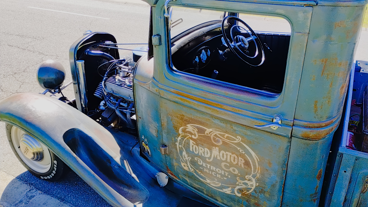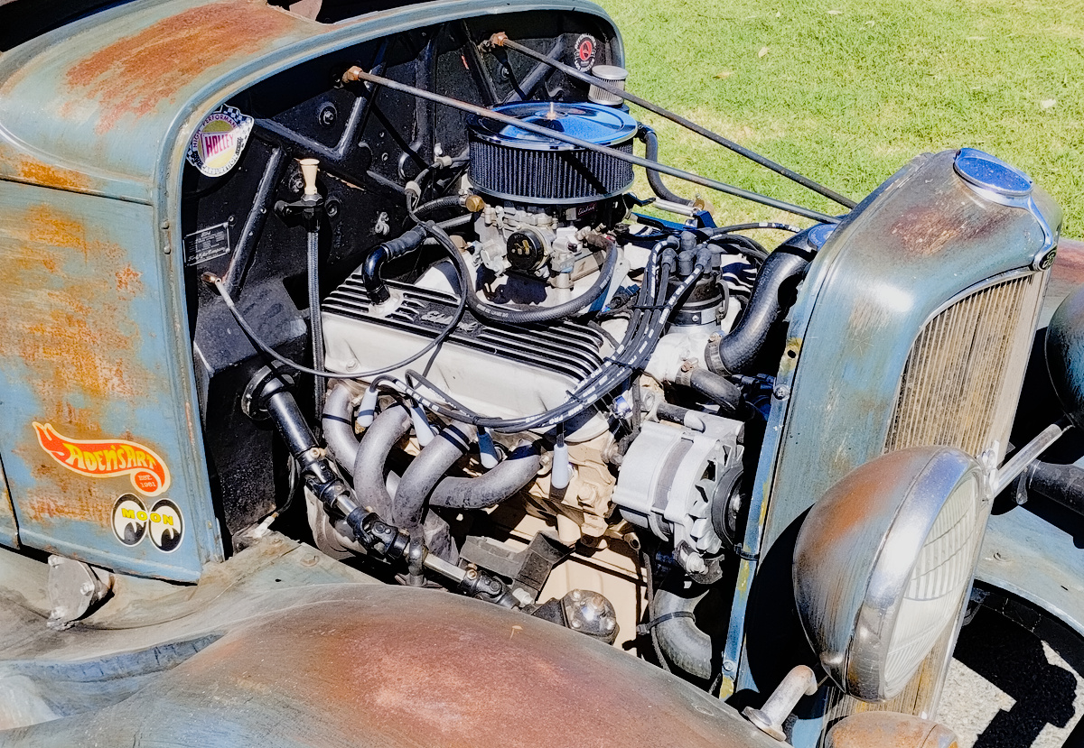 You can clearly see the left side of the Ford 60 V8 engine sticking out here. So, visually very different from the modern V8 in that hot rod truck.