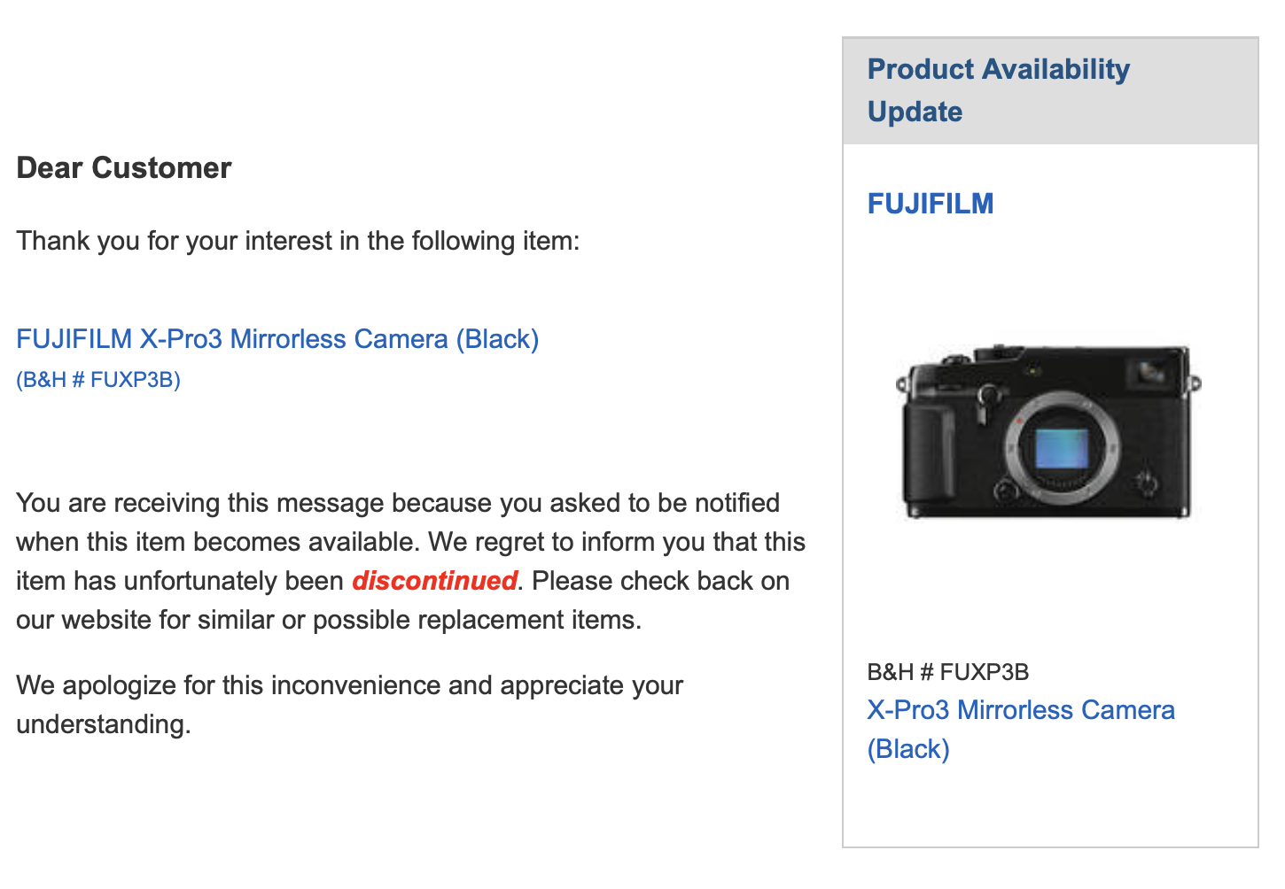 My limited experience with manufacturing tells me that it may not be feasible for Fuji to fire up another line just to meet this trend-driven demand, even if they can get all of the components. And perhaps this model too is approaching the end of its production run.