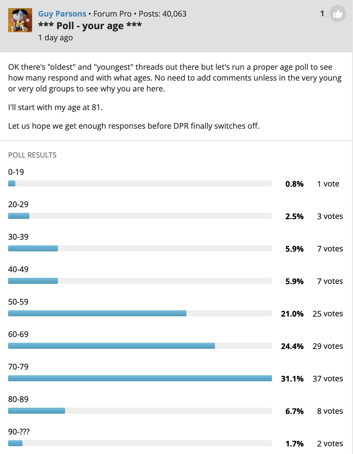 It will be interesting to see if the age distribution on this poll will converge with the DPR poll's distribution or not. I don't expect a huge difference, but the audiences might differ a bit.