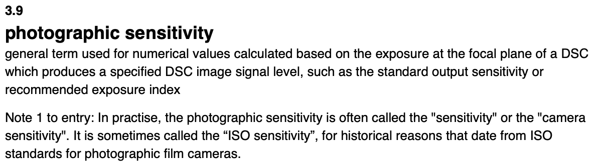 Anyhow, when digital cameras started to provide the ability to change the ISO, it was described (wrongly) as a 'sensitivity' control due mainly, I suspect, to this bogus RF receiver analogy. CIPA has been promoting this 'sensitivity' description for a long while, whilst ISO has been resistant, even though it adopted CIPA's two novel 'ISO' definitions in 2006. In the 2019 update of the standard it fudged the whole issue by adopting a term 'photographic sensitivity', which essentially says 'Photographic sensitivity is a term for ISO and for historical reasons sometimes it's just called sensitivity'.
