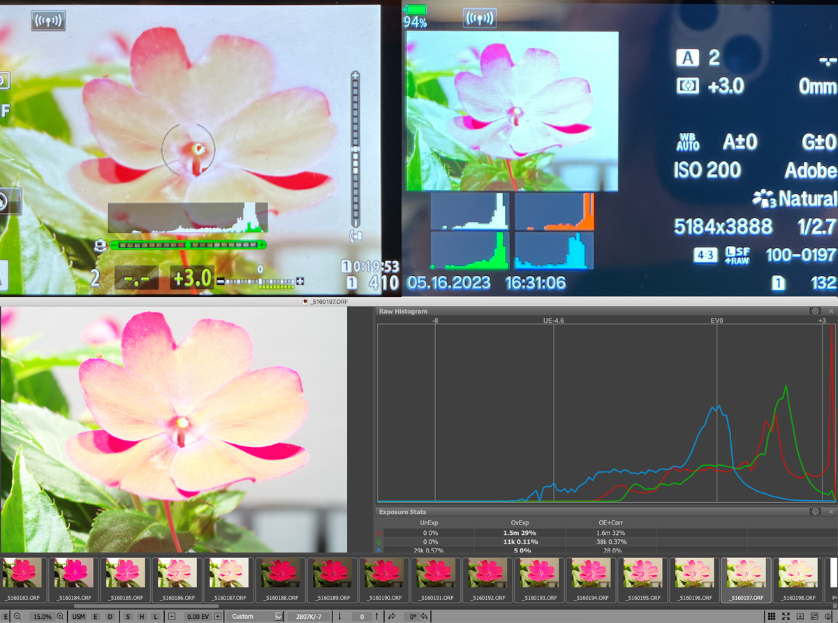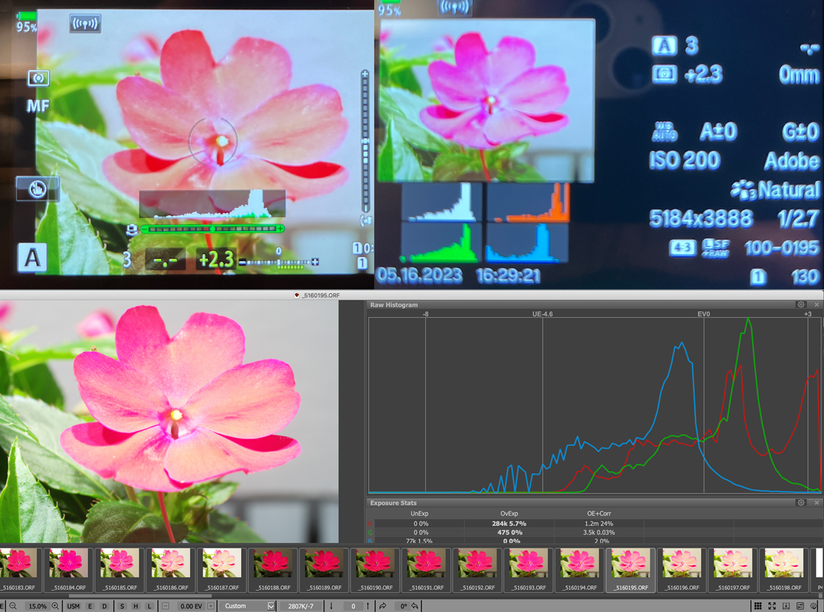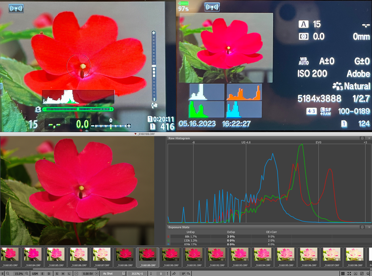 One of my wife's Mother's Day presents this past Sunday was some potted red flowers, I took their appearance as an unmistakable message from the forum gods that I should go ahead and do a red flower test of my EM1iii's live (luminance) histogram and highlight warning blinkies. Contrary to Donald's results with his magical Sony cameras, my test results confirm that my EM1iii's live histogram is based on the RGB data that generates in-camera display and JPEGs. The real difference between my results and Donald's has nothing to do with the different cameras used and everything to do with different scenes tested (and resulting highlights in the respective color channels). If Donald were to perform a similar test with his Sony cameras on a similar red flower scene as the one I used, his Sony cameras would no longer display luminance histograms that seemingly magically match the corresponding raw histograms. Here are my test results:
