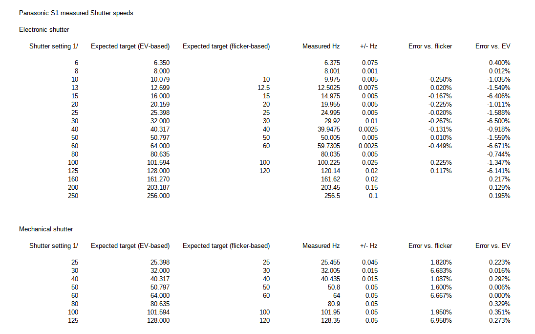 Some of the electronic shutter errors are surprising: I found larger errors at "1/30" and "1/60" than at "1/120", when I would expect the opposite. The electronic shutter speed of 1/59.73 s at a "1/60" setting appears to be a bug.