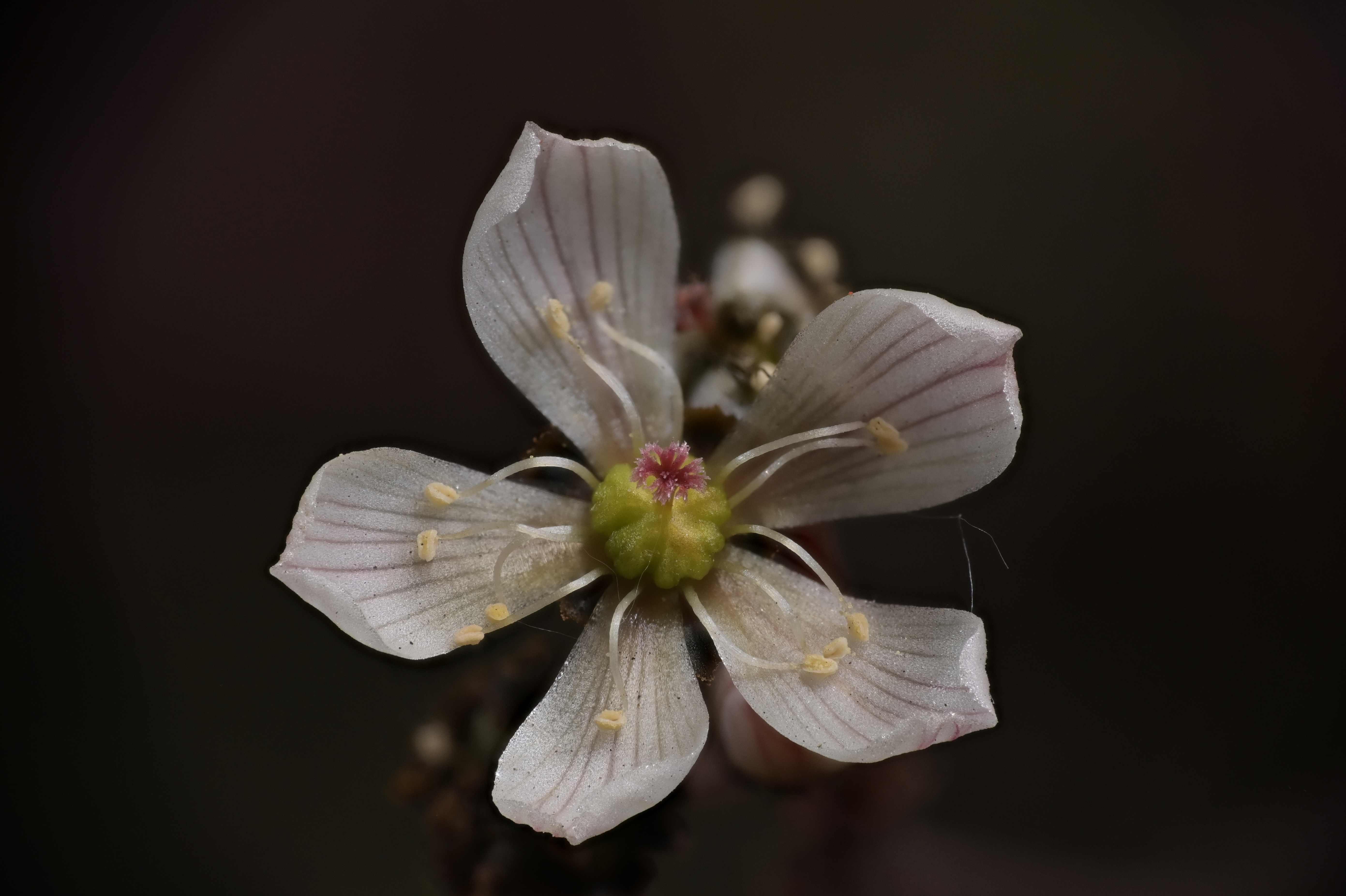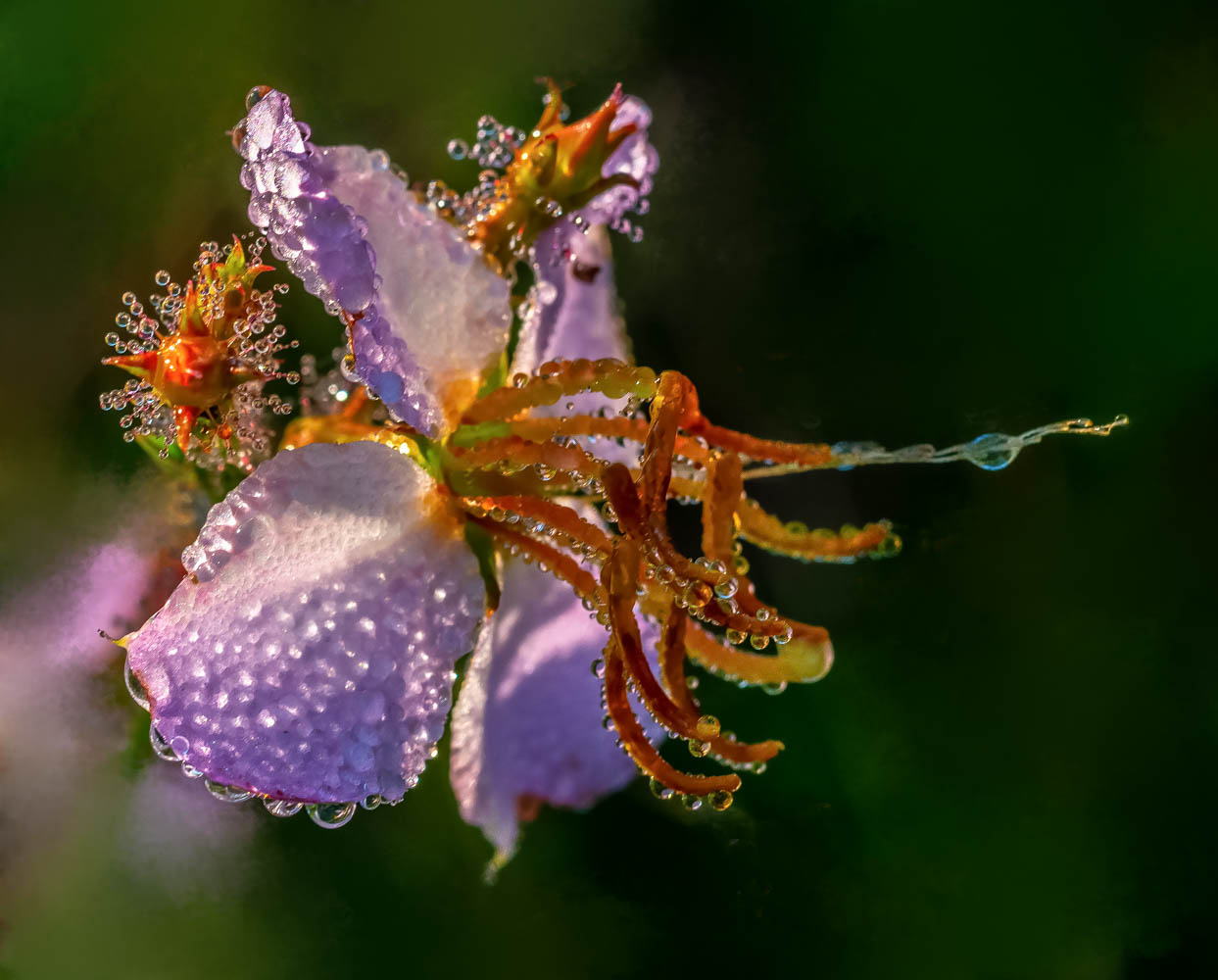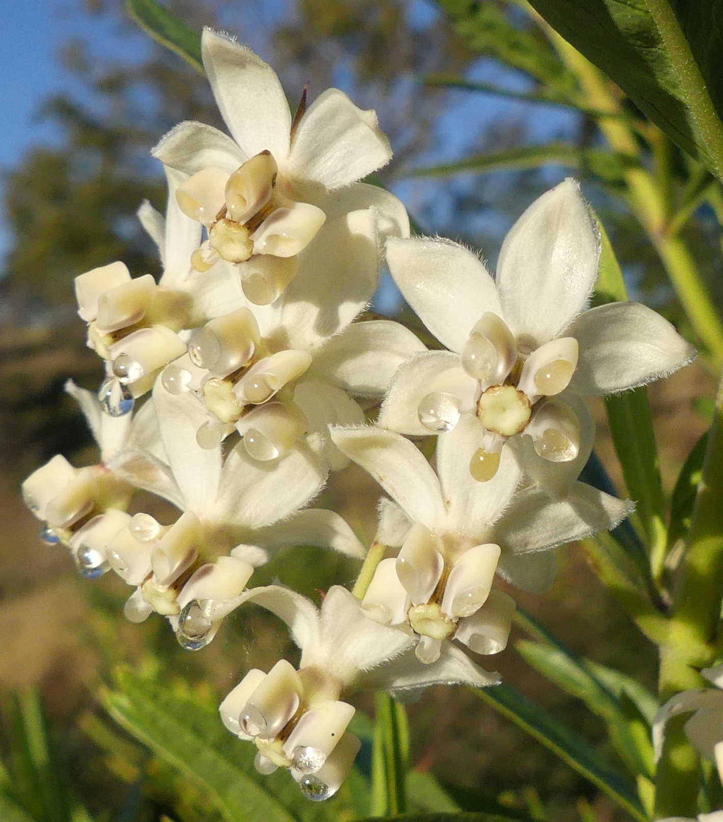 Not my favourite in any way but included for oddity. I believe it is a type of milkweed. Not raindrops or dew, it must express liquid, probably to attract pollenators...