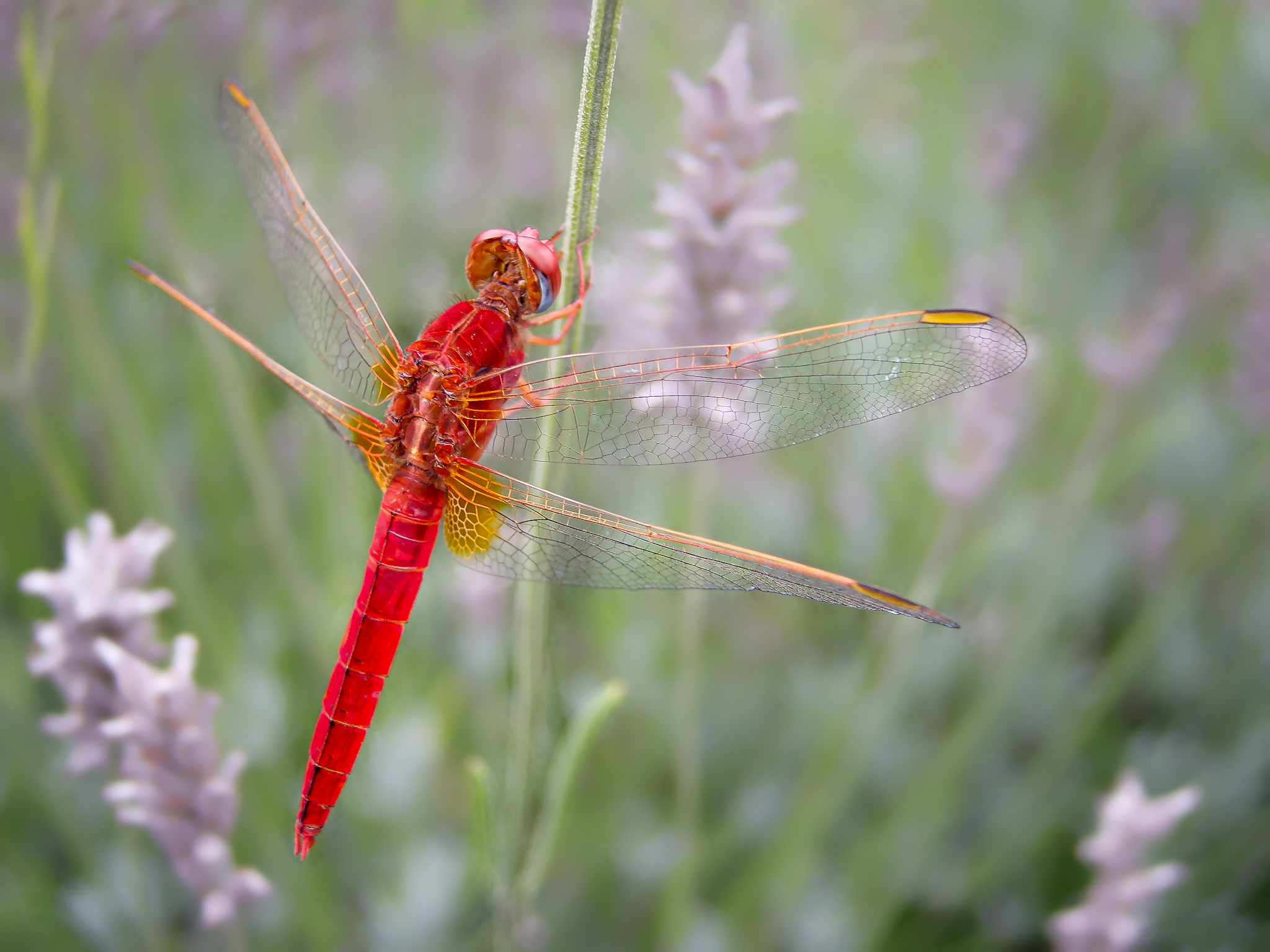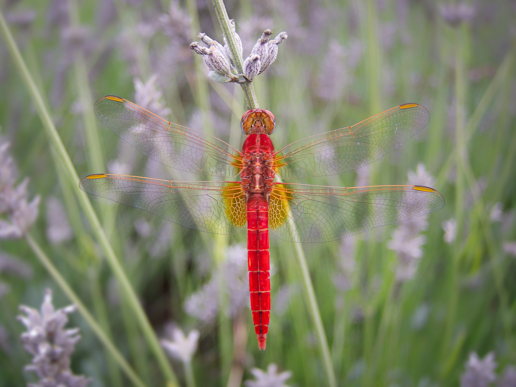 ¡Hola Alan! It is a male scarlet dragonfly (Crocothemis erythraea), and from what I have read, it is extremely rare in the British Isles, with only a few sightings, but quite common in southern Europe...