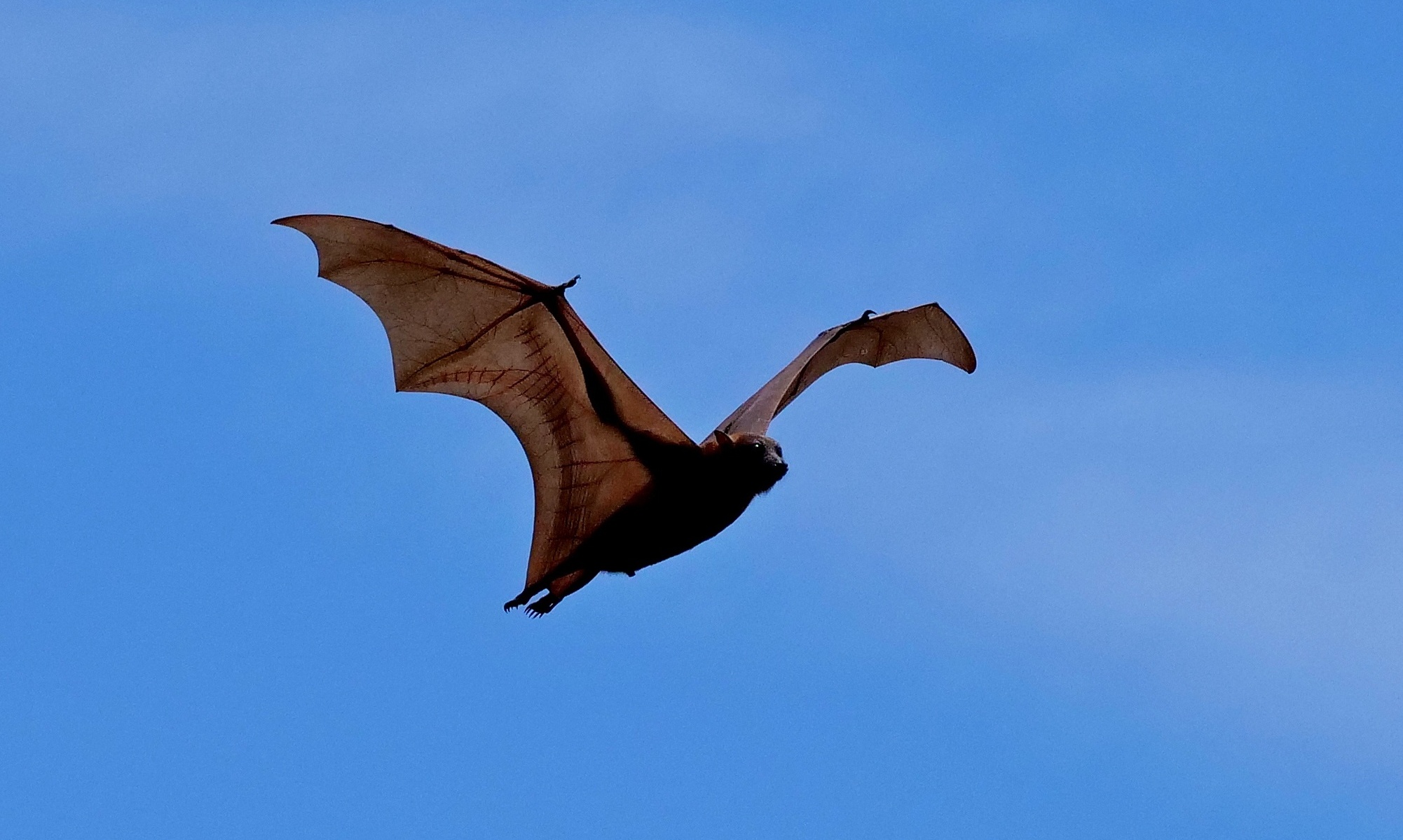 There is a huge colony of these fruit bats along a nearby river. Late afternoon some of them stretch their wings and fly around a bit.