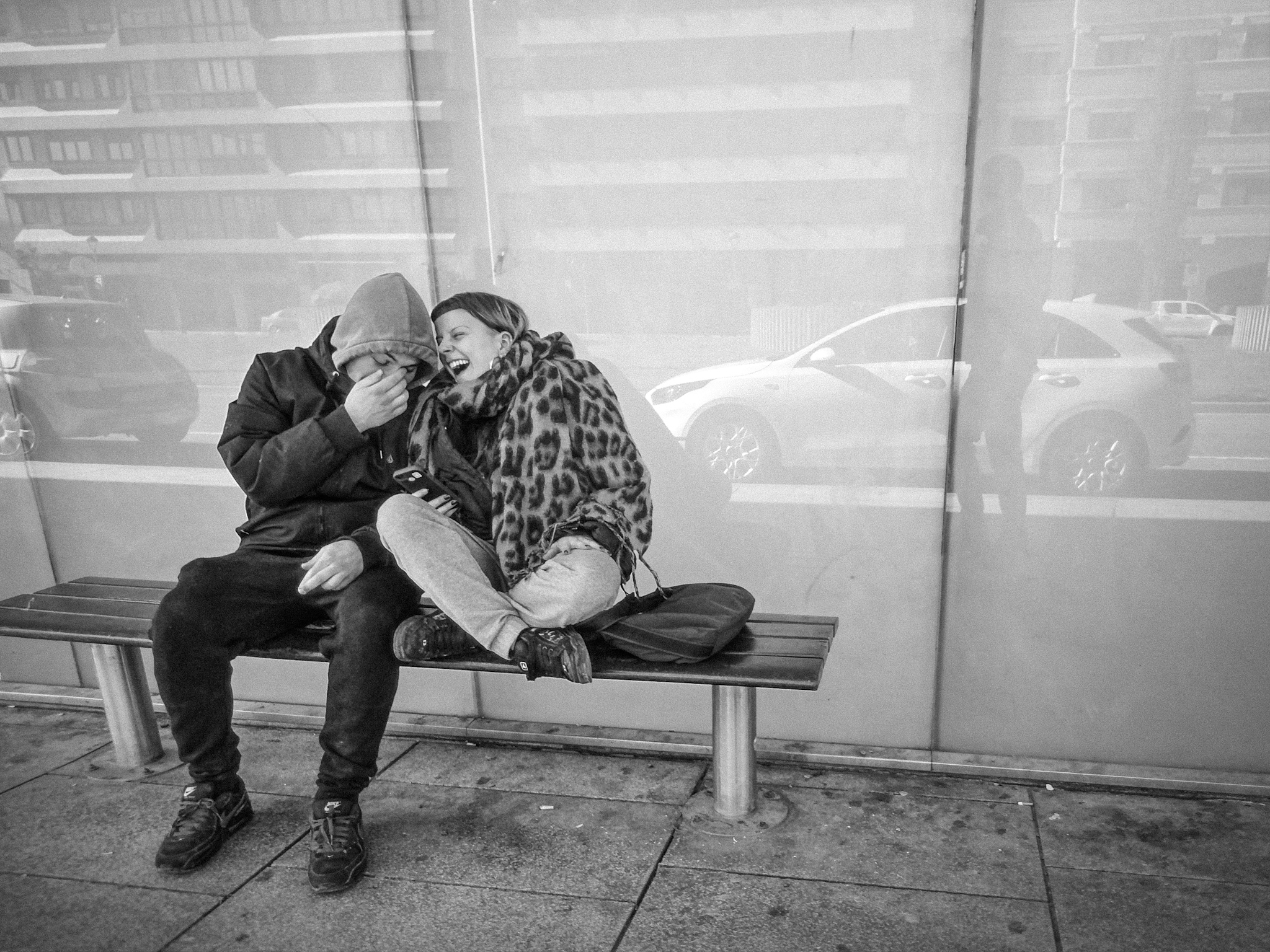 Actually, the original shot doesn't have much color. The entire background is greenish glass, with few nuances, and the floor is gray. The young man is dressed in black and the only thing that attracts attention is the "animal print" on the lady's coat. So in the end I opted for black and white...