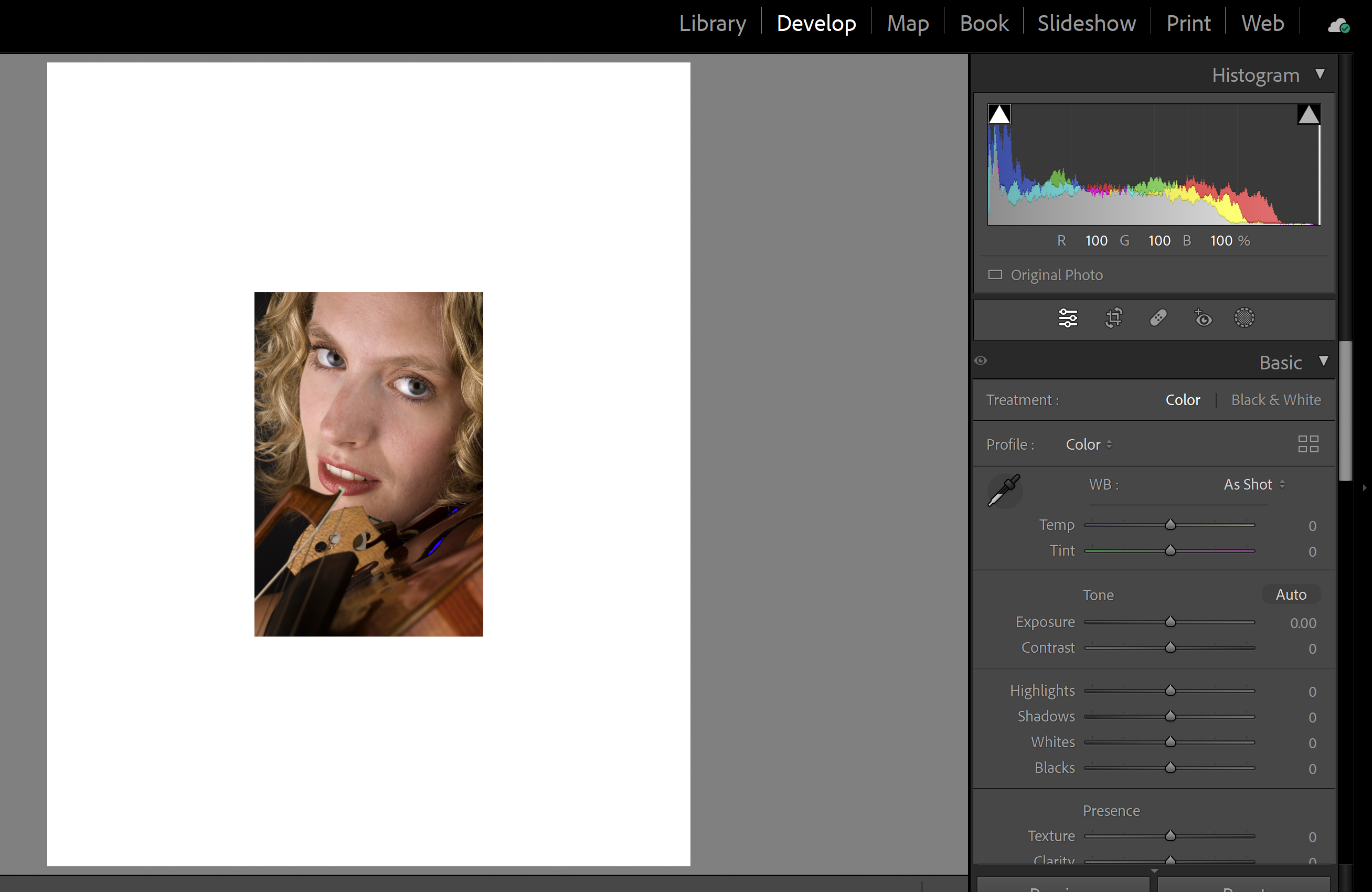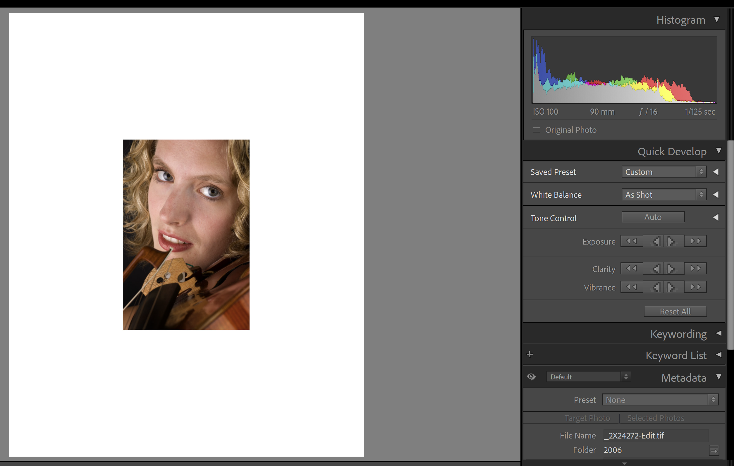 I was playing around with different surrounds, and I created an image with a large white surround. I noticed that the surround didn't show up on the histogram in Lr's Library View: