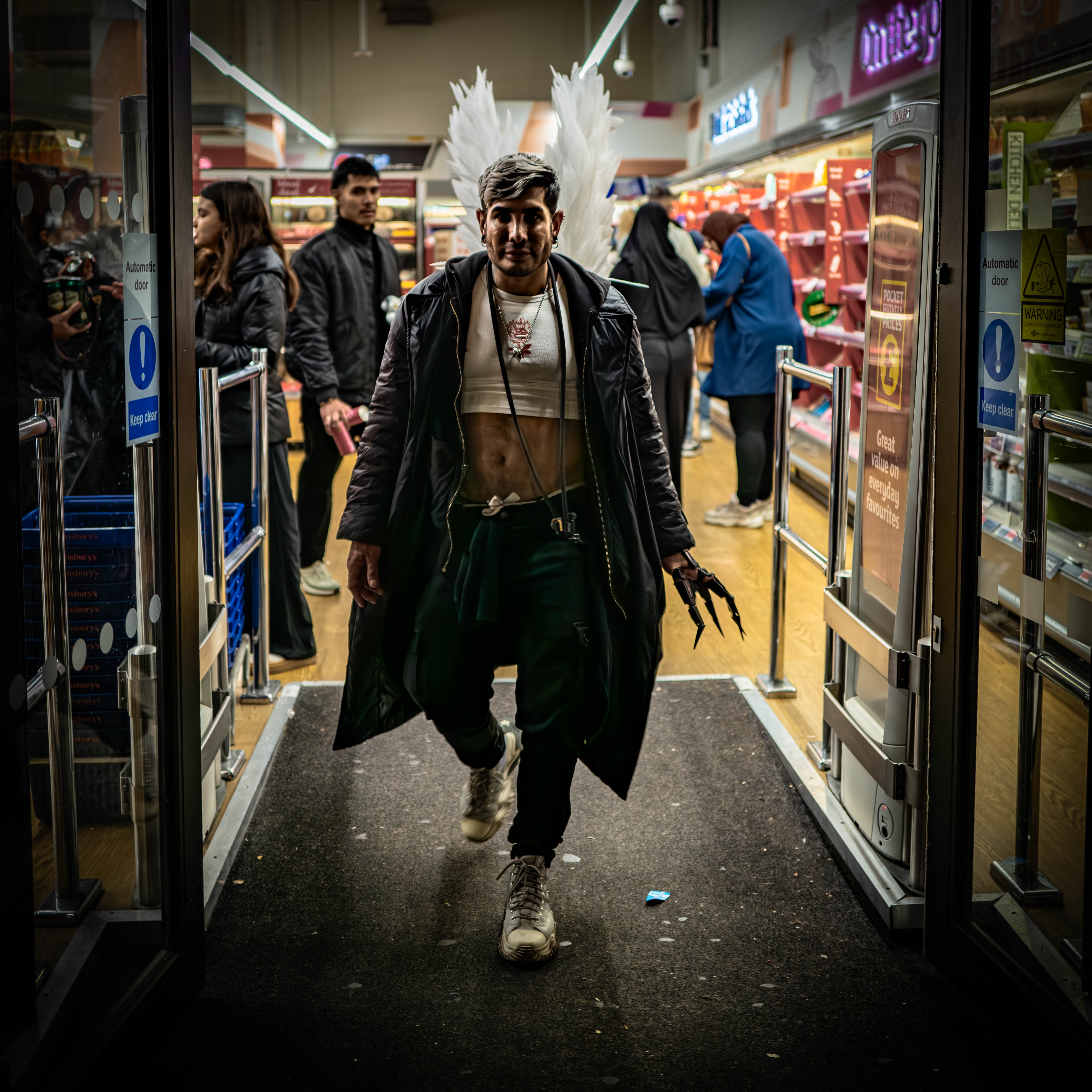 Thanks for your nice comment. I liked it, particularly the spread of the hand and the position of the wings. It was seriously underexposed, and I had to lift the shadows a lot to improve it. Then I cleaned up the noise. As you thought , it’s not a staged shot. I was walking down the street when this chap was leaving the store. I noticed him, lifted the camera, and took three shots—this is the best one.