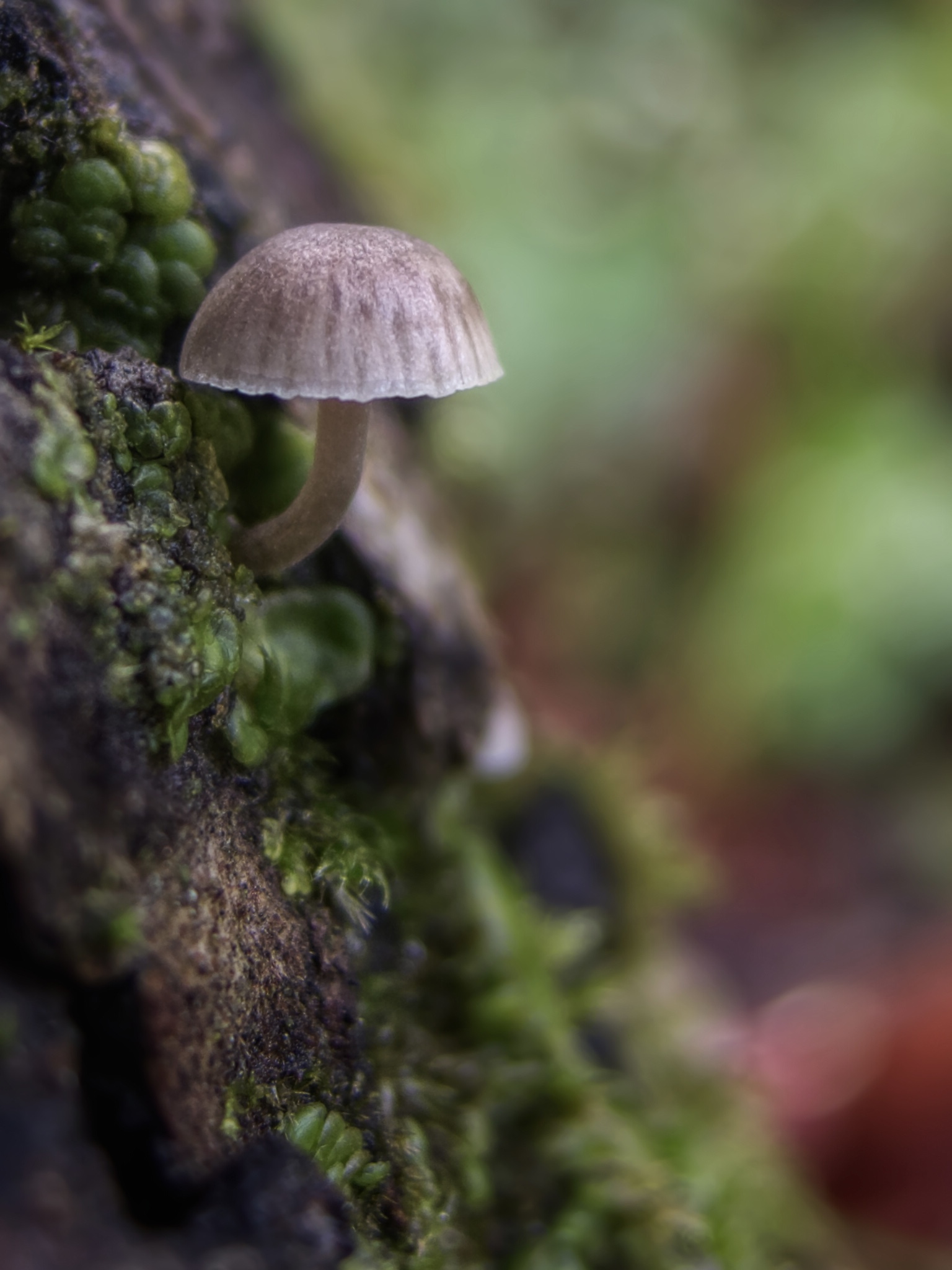 Another small mushroom among the moss, the lichen, on the bark of a tree...