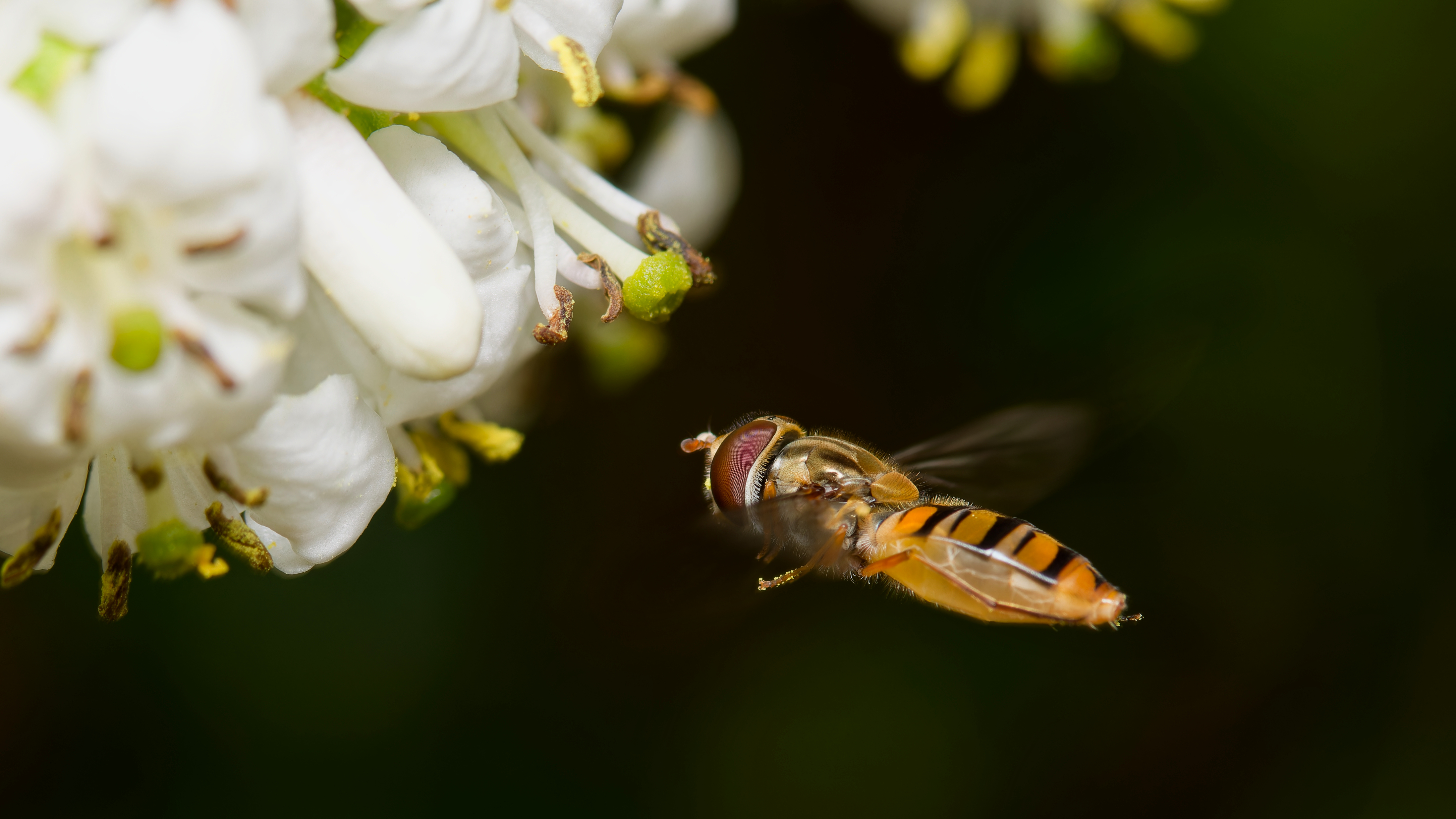 I was chasing bees but got (easily) distracted. I think these are called Marmalade Hoverfly (based on the moustache shaped bands)